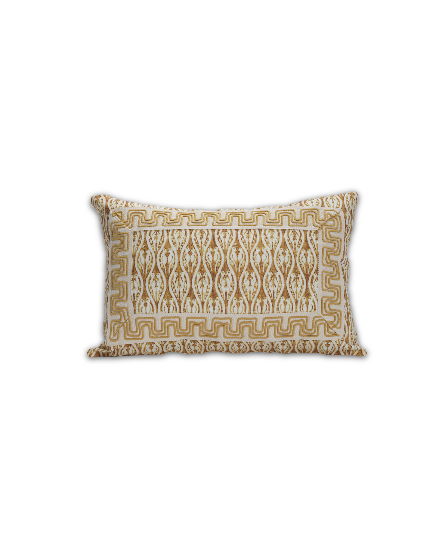 Cojín pequeño en tonos mostaza de algodón con estampado en exclusiva para IQ Home. Detalle de cenefa con ribete. También disponible en color rojo y verde y tamaños grande y pequeño. No incluye el relleno.