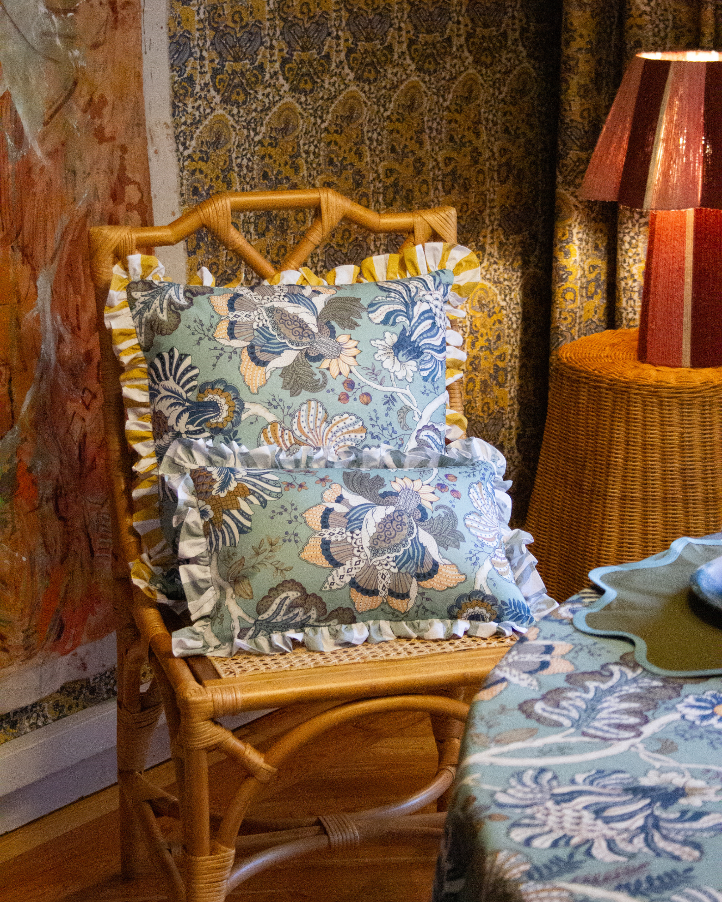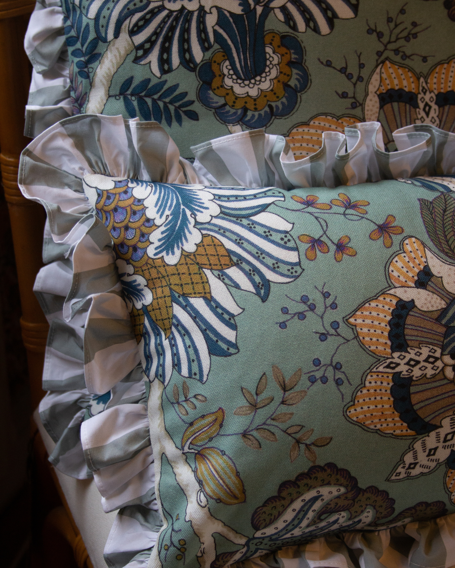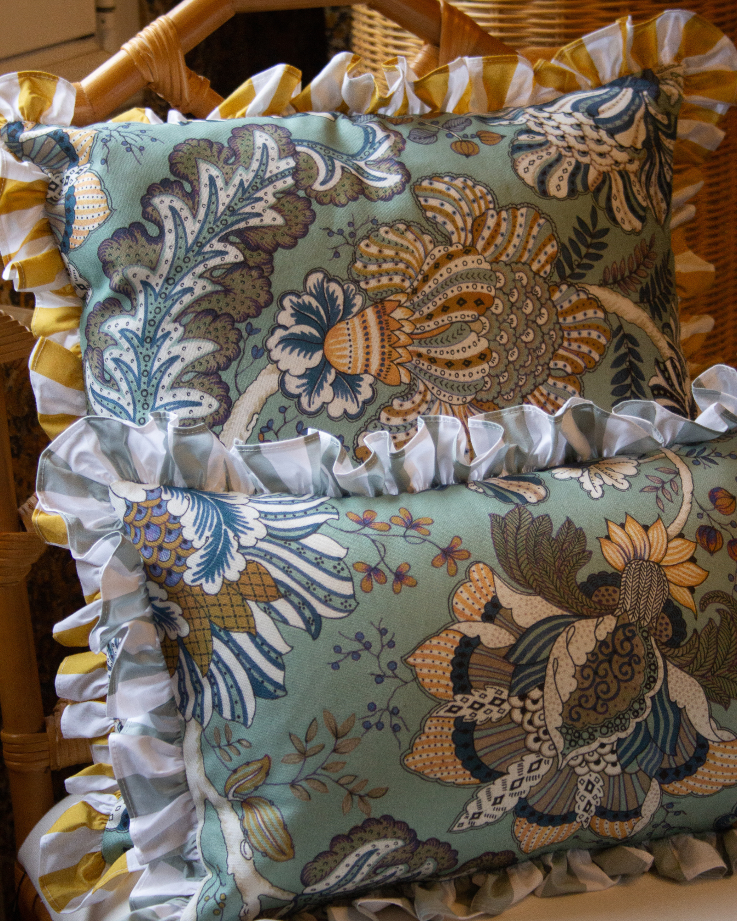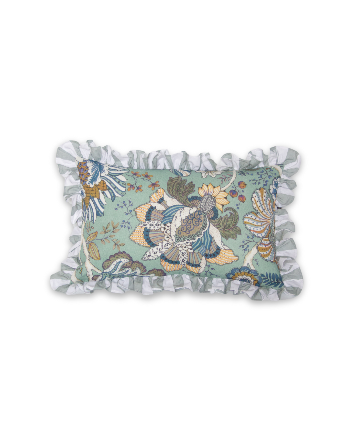 Cojín pequeño de algodón en tonos azules hecho en 100% algodón con estampado floral. Detalle de volante con estampado de rayas blanco y azul. También disponible en rayas amarillas. No incluye el relleno.