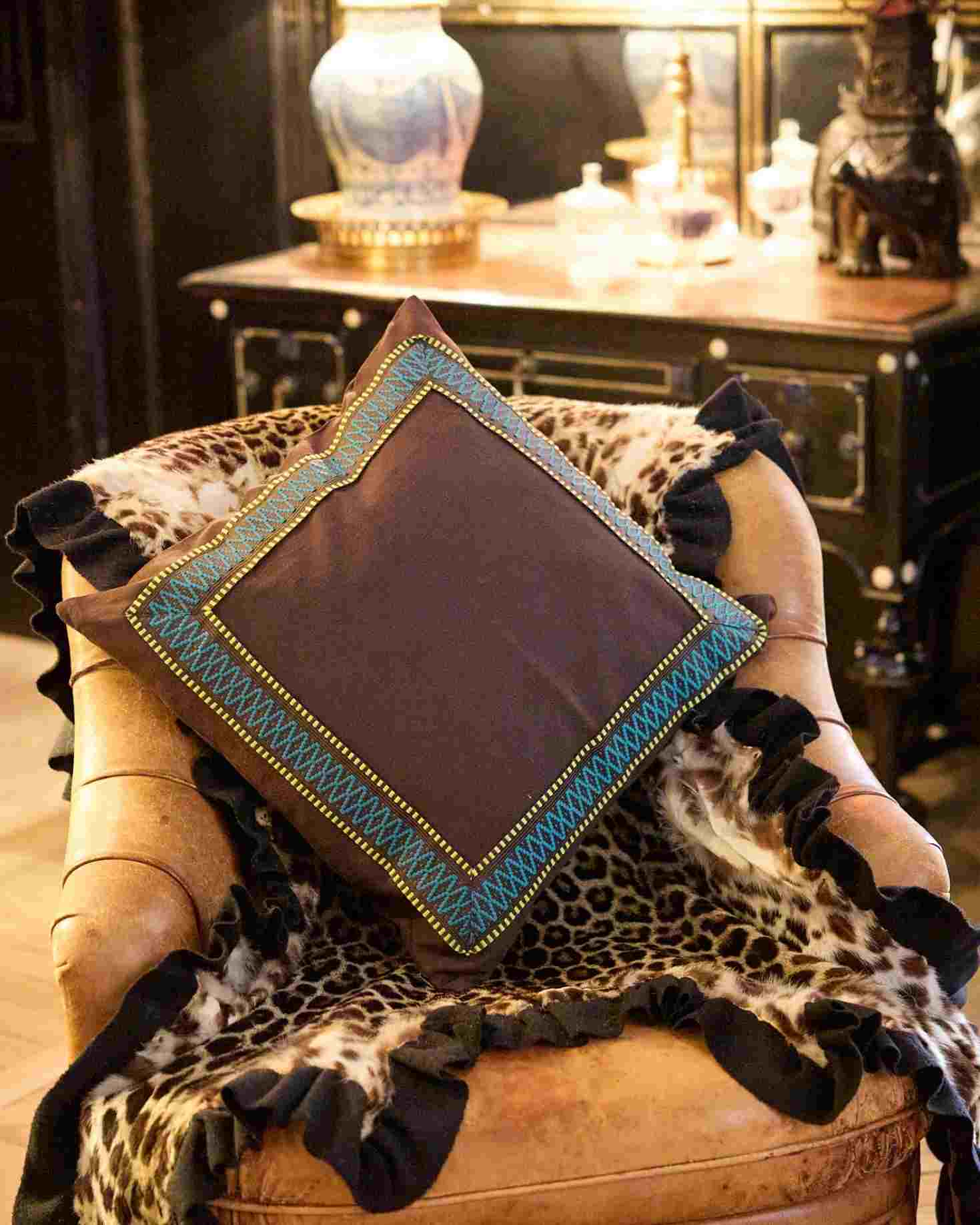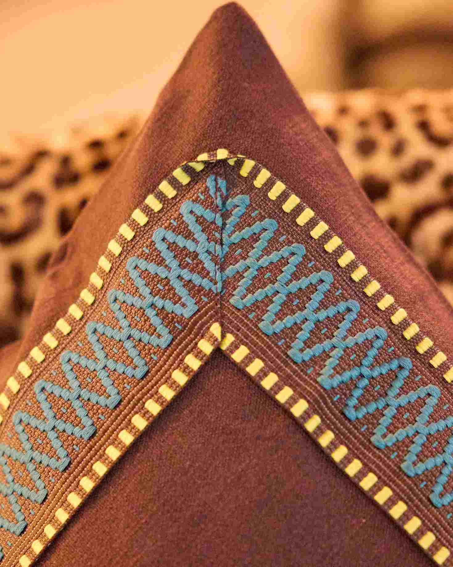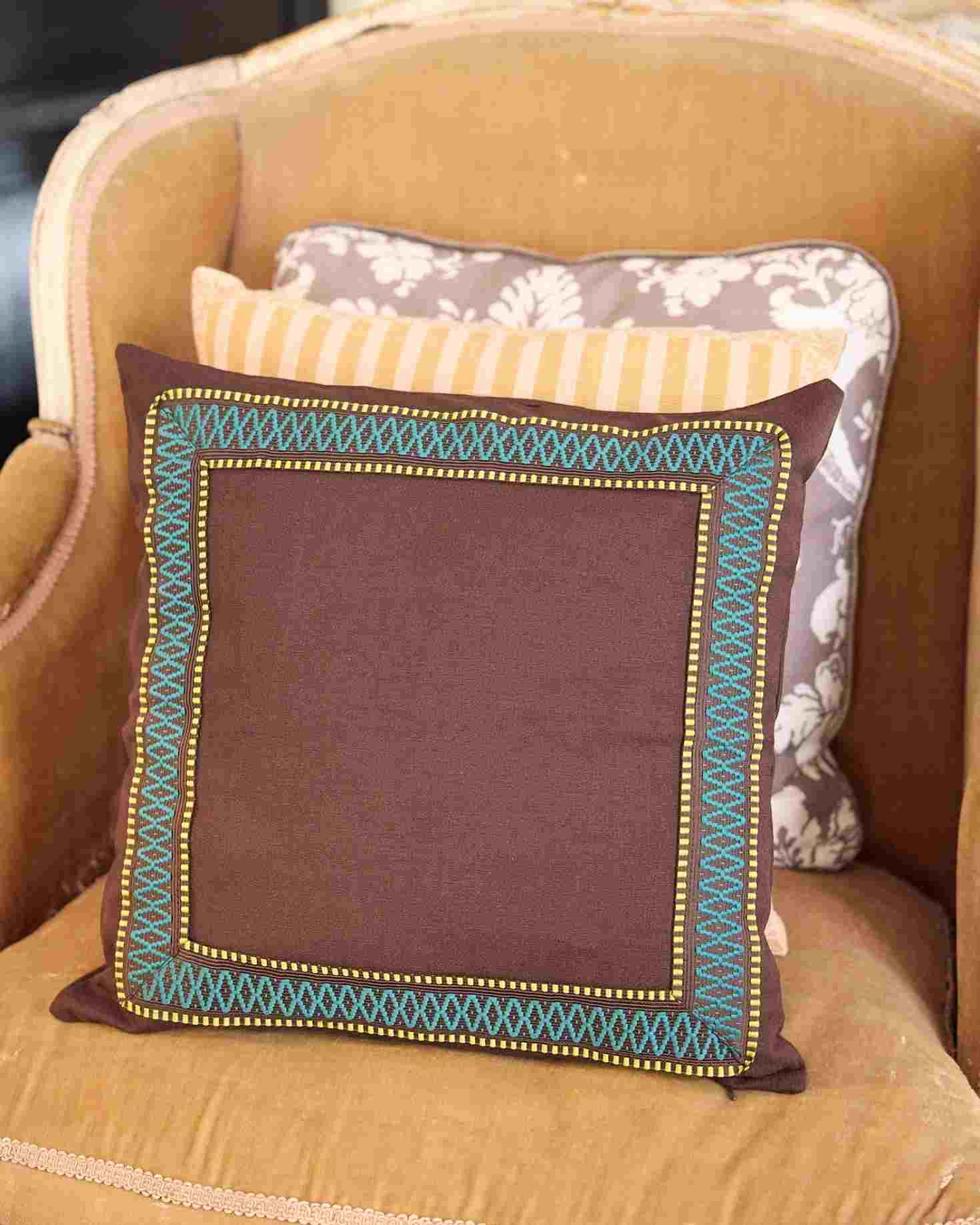 Cojín grande de lino en color marrón y cenefa geométrica en tono marrón, verde y amarillo. También disponible en verde. No incluye el relleno.