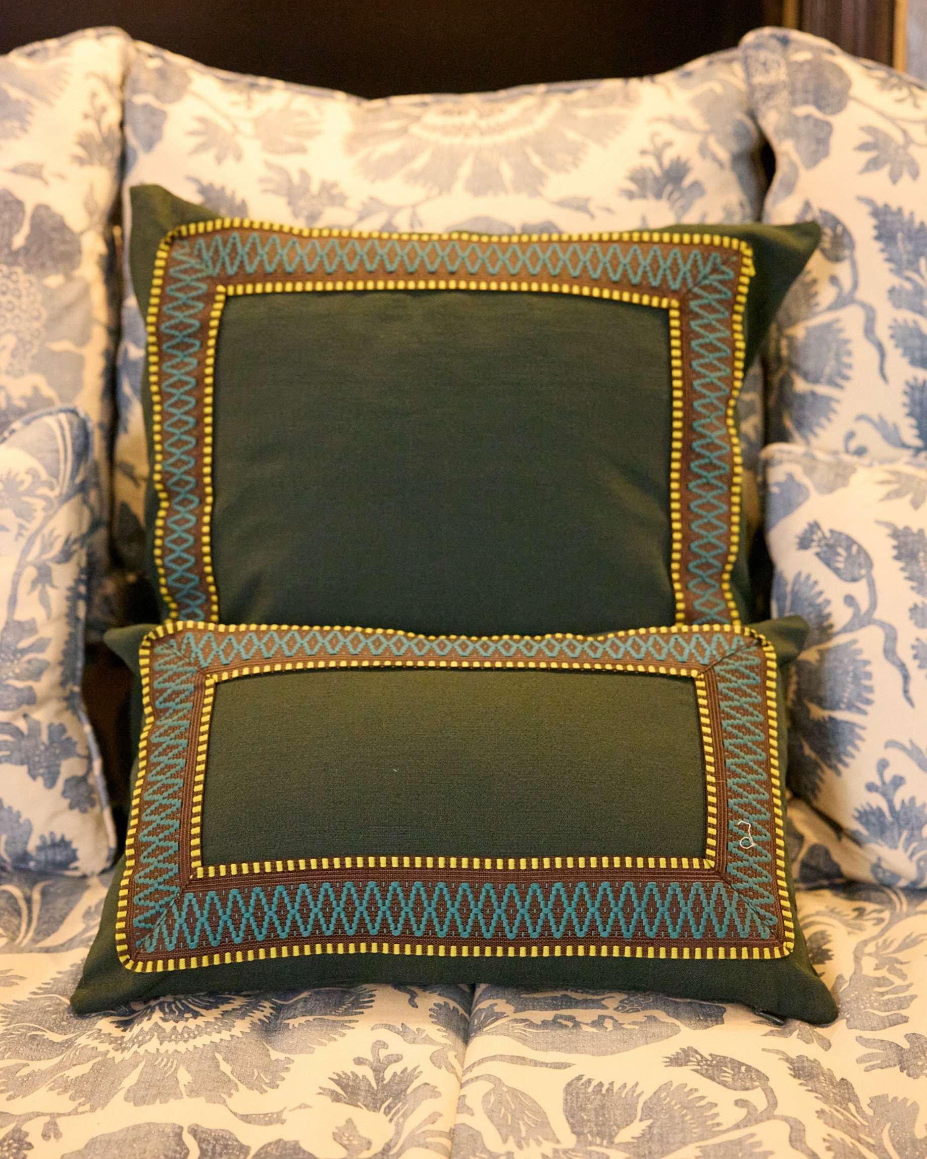 Cojín grande de lino en color verde y cenefa geométrica en tono marrón, verde y amarillo. También disponible en marrón. No incluye el relleno.