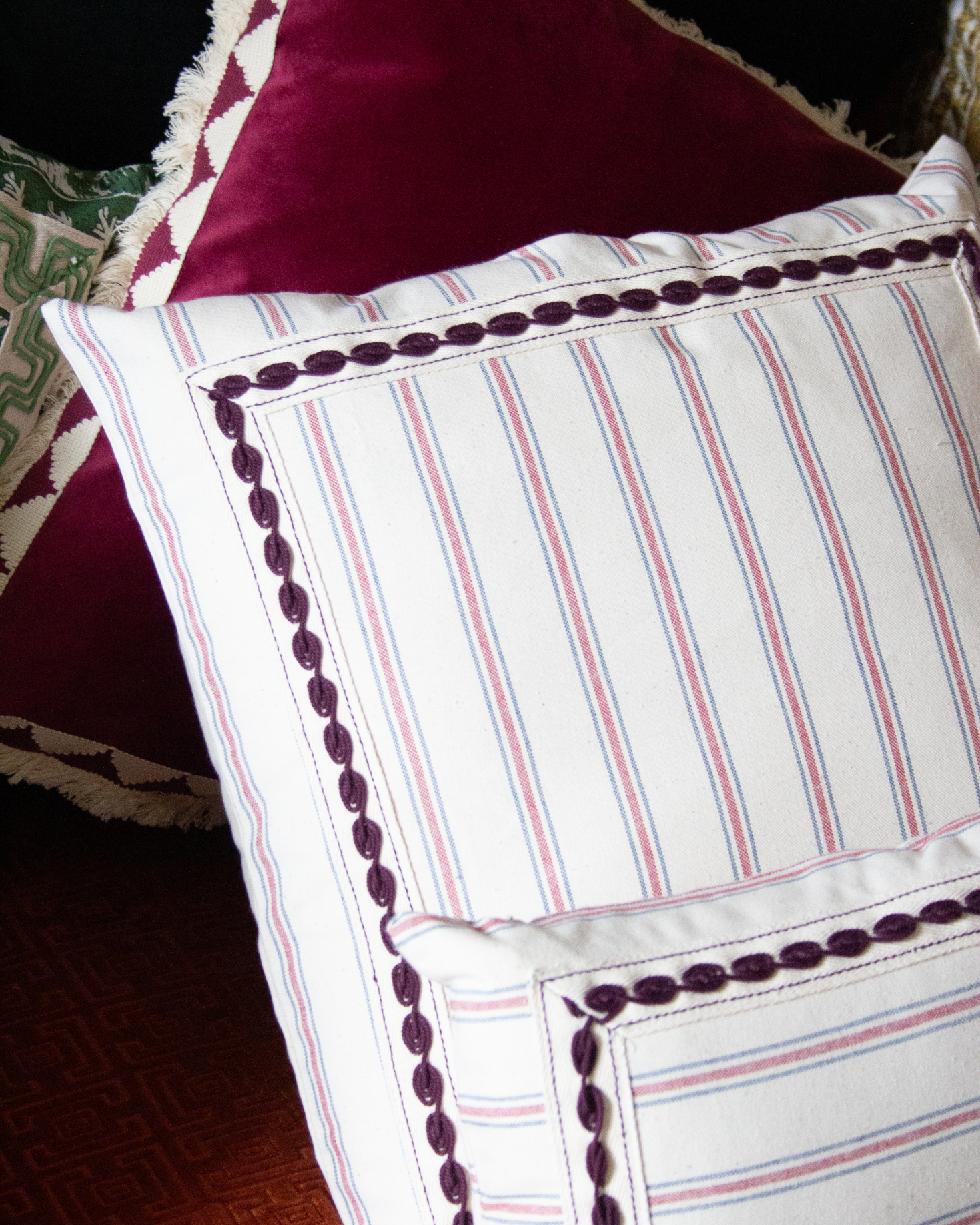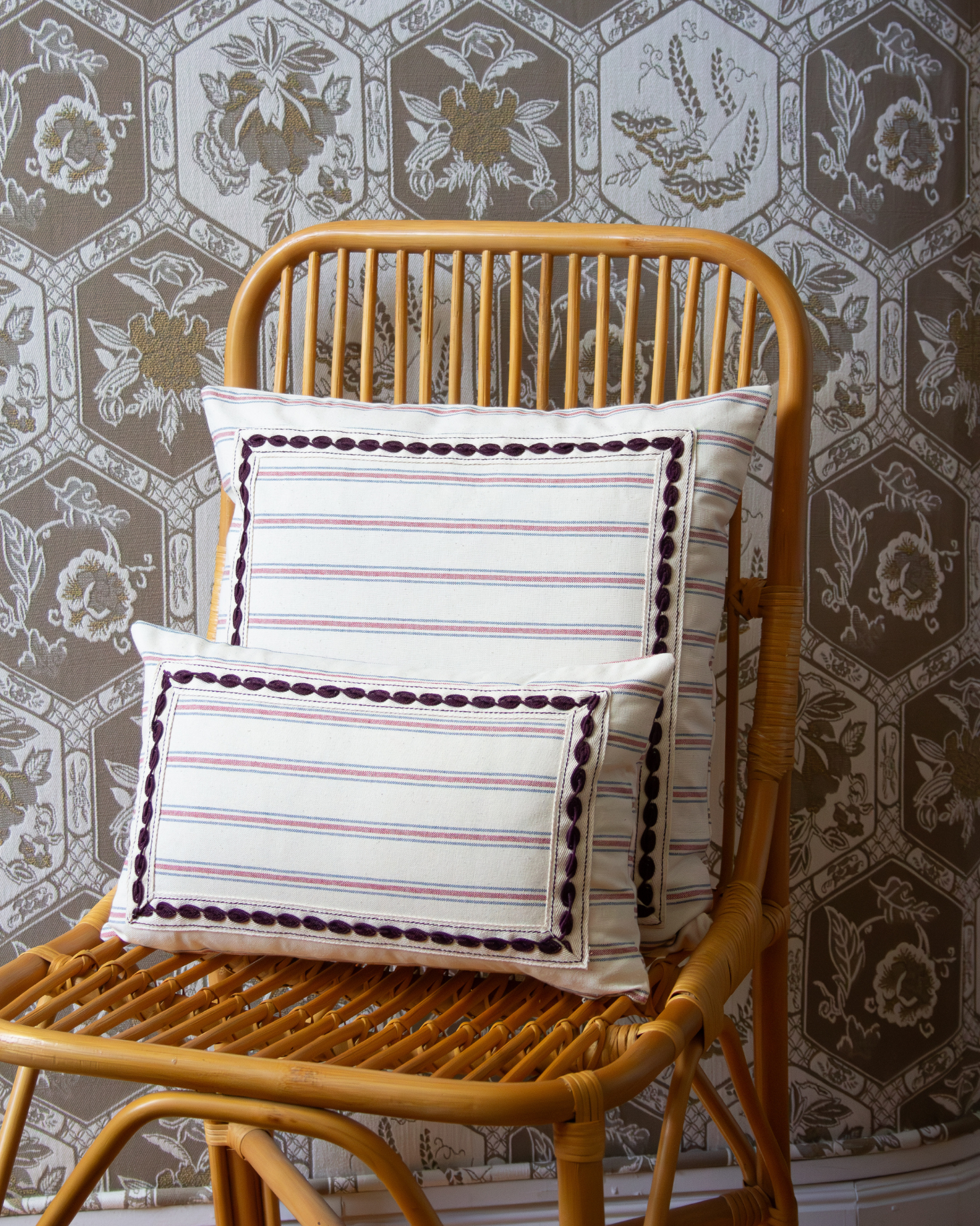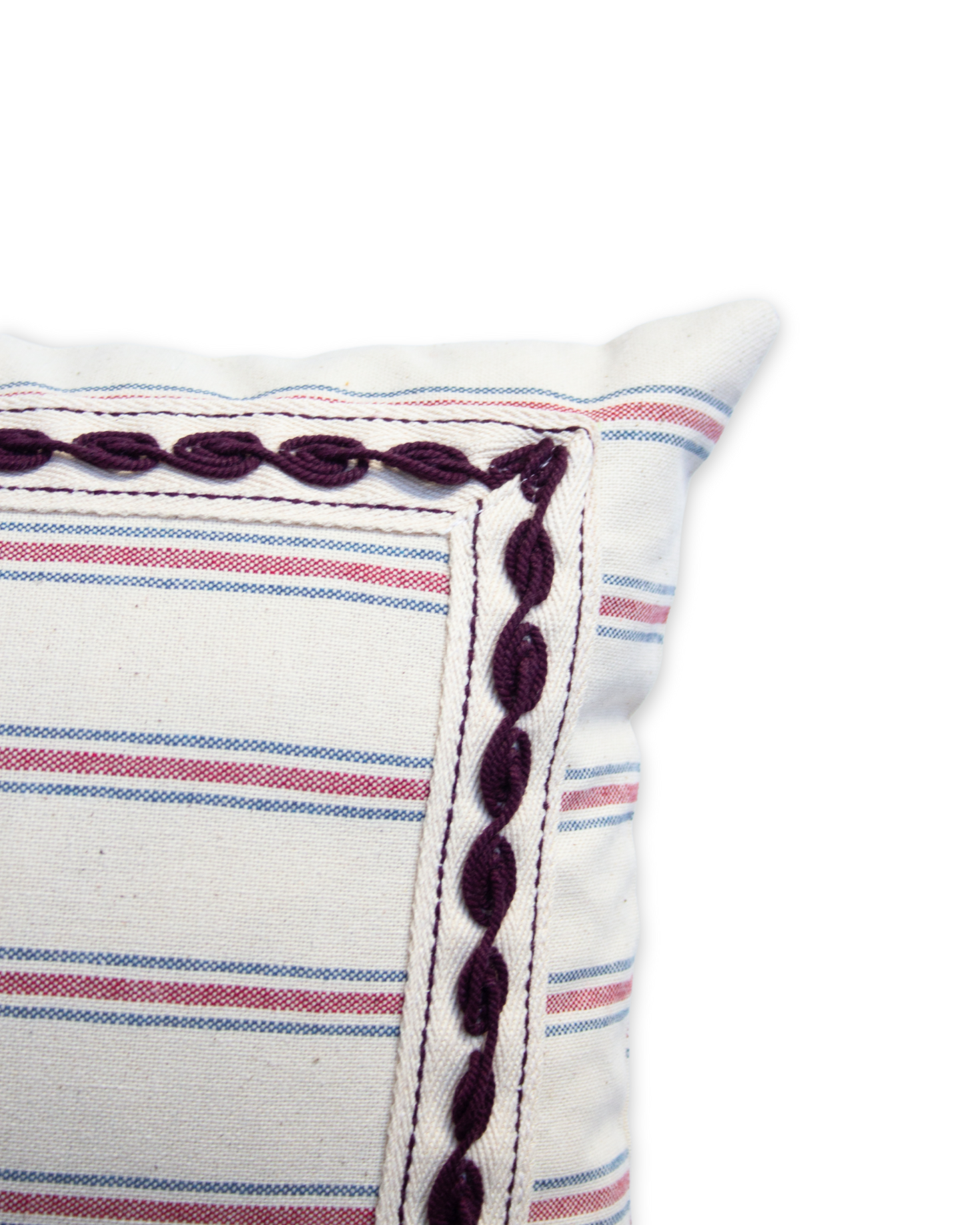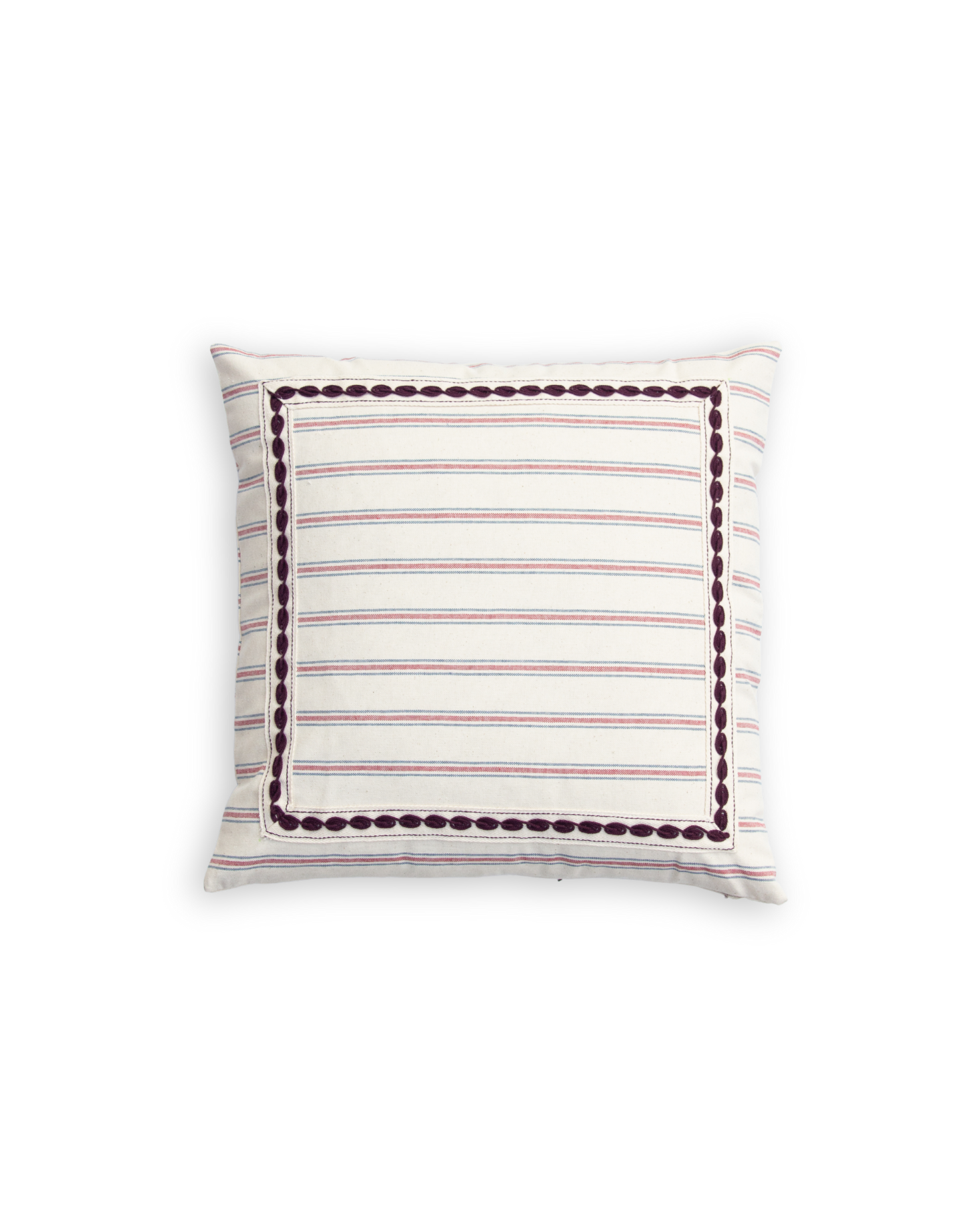 Cojín grande de algodón con estampado de rayas en tonos rojos, azules y beige. Detalle de cenefa en color burdeos. También disponible en mostaza, negro y azul. No incluye el relleno.