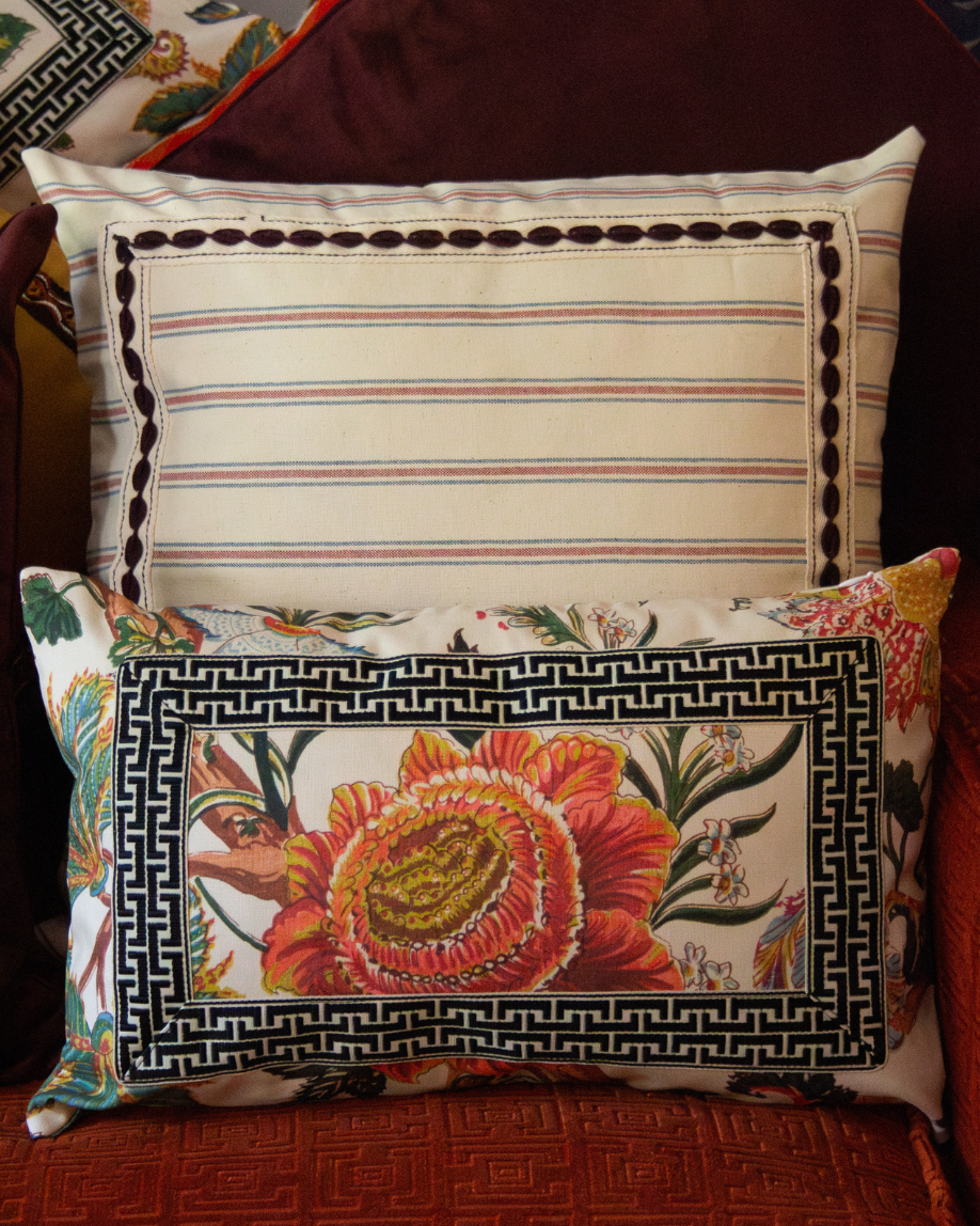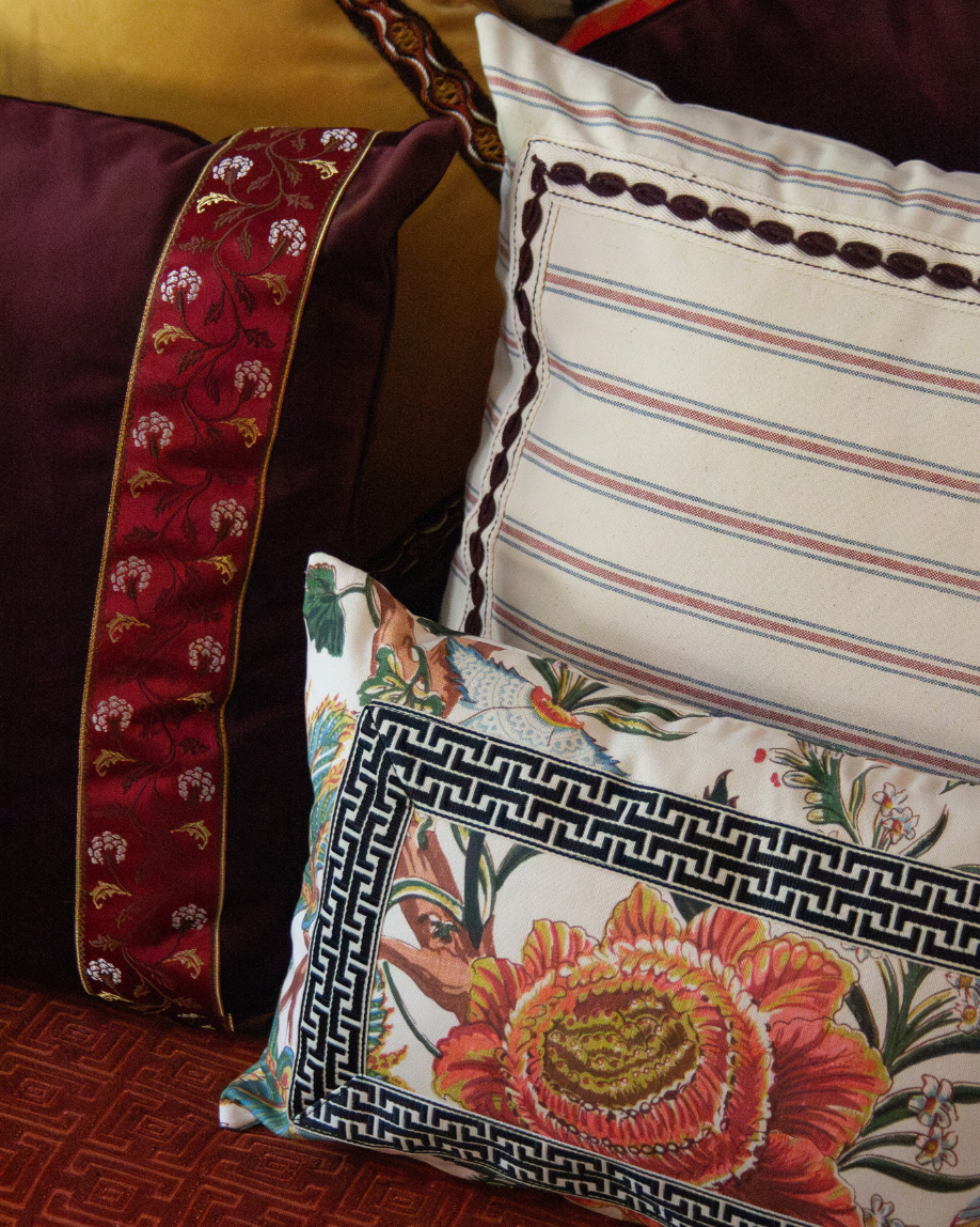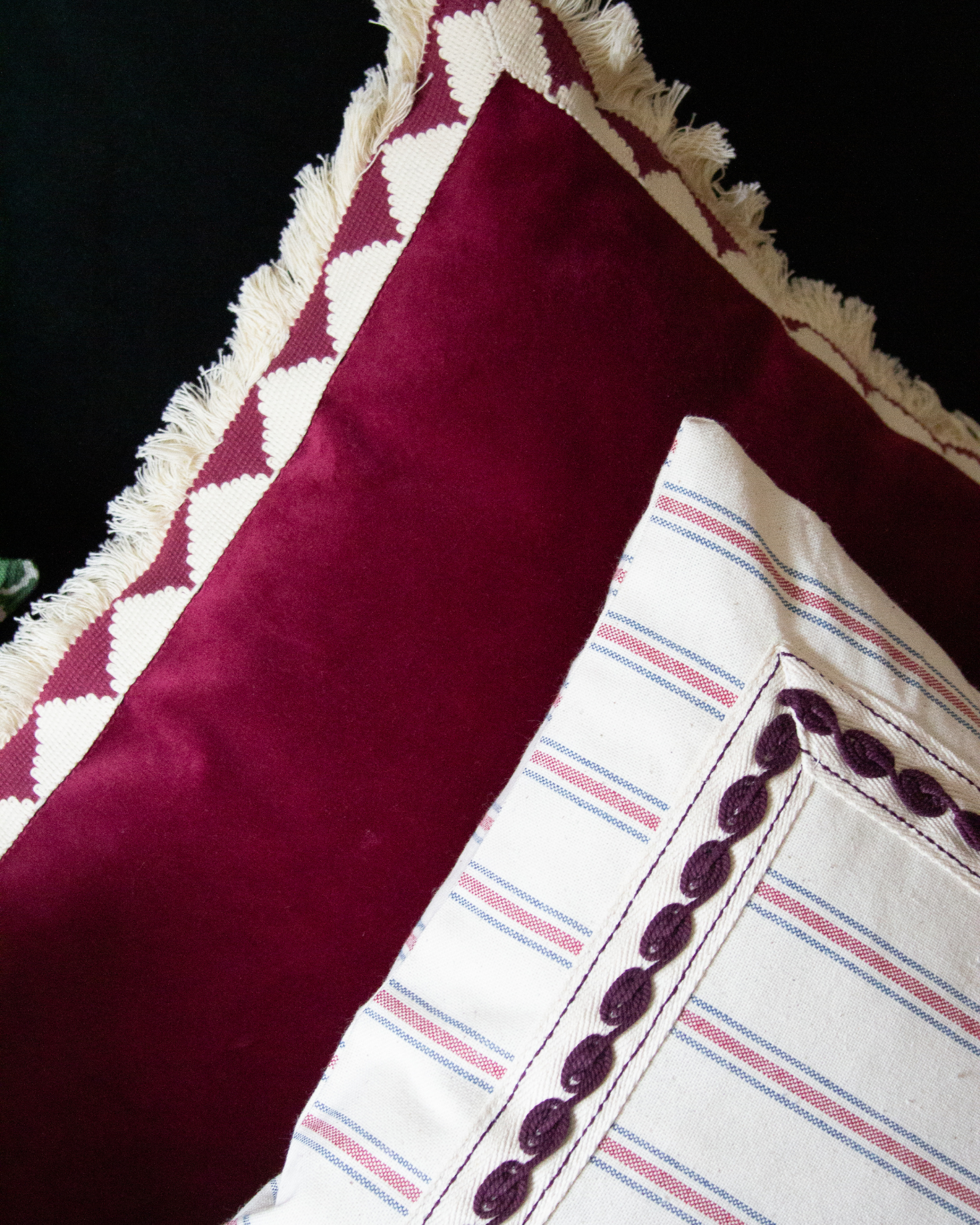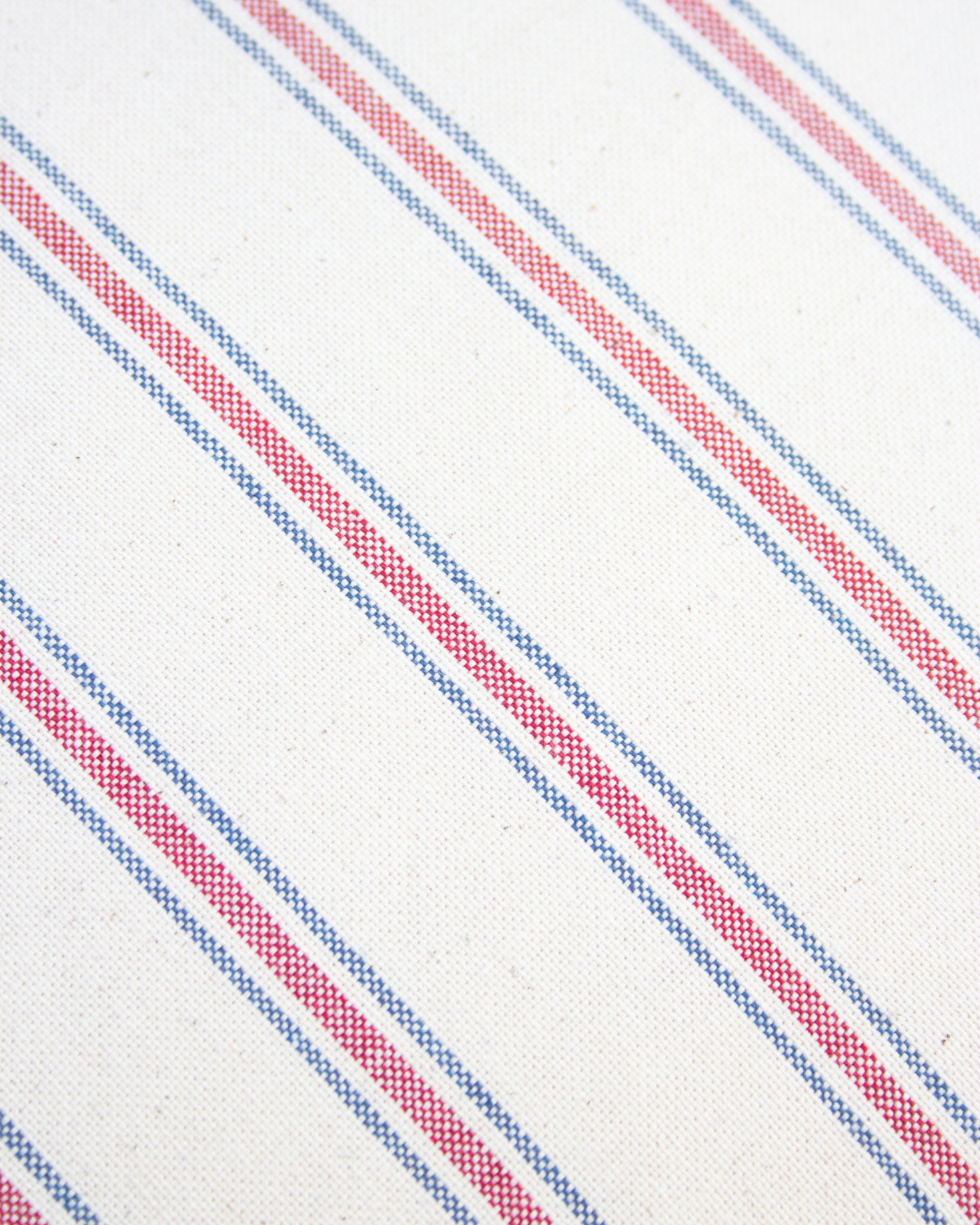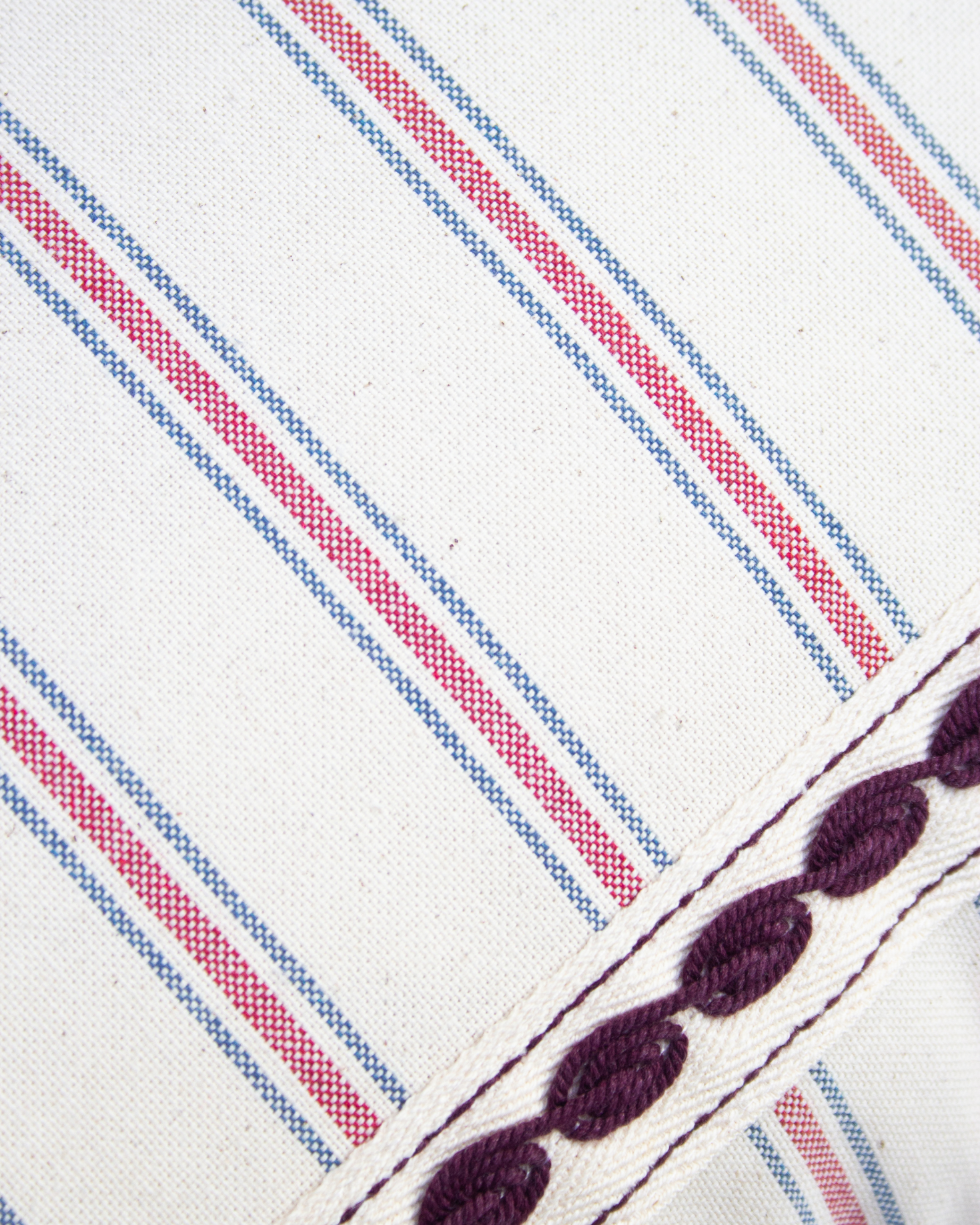 Cojín grande de algodón con estampado de rayas en tonos rojos, azules y beige. Detalle de cenefa en color burdeos. También disponible en mostaza, negro y azul. No incluye el relleno.
