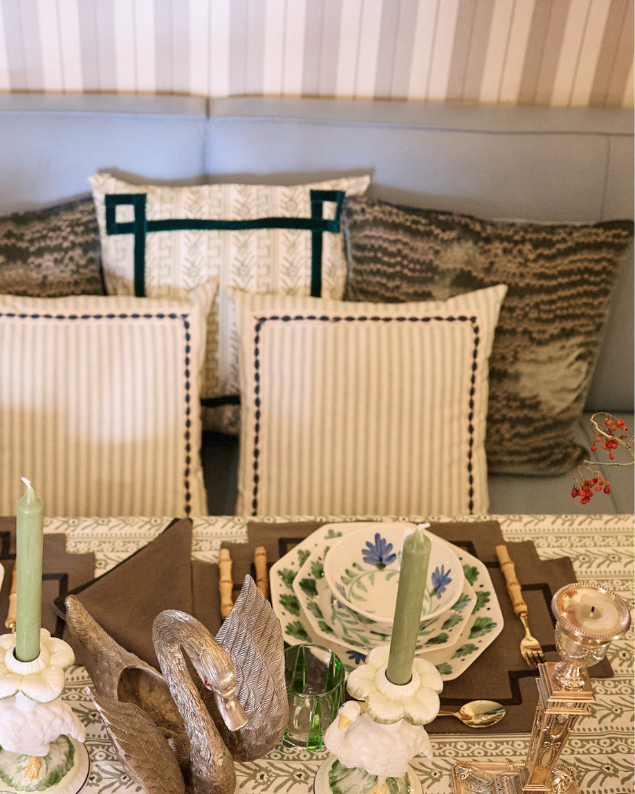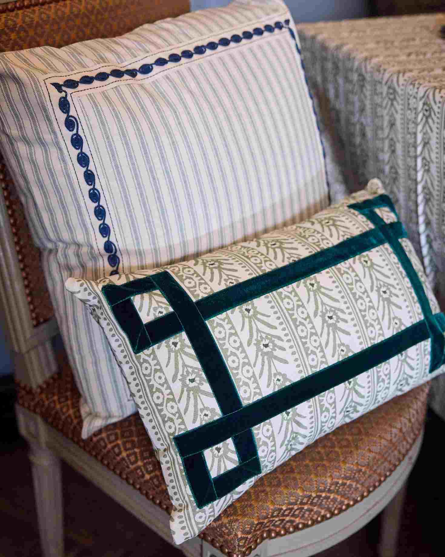 Cojín grande de algodón con estampado de rayas en tonos verde y beige. Detalle de cenefa en color azul. También disponible en rojo, negro, mostaza y azul. No incluye el relleno.