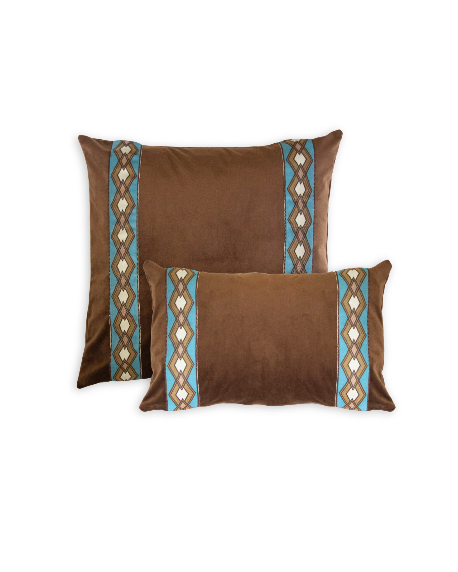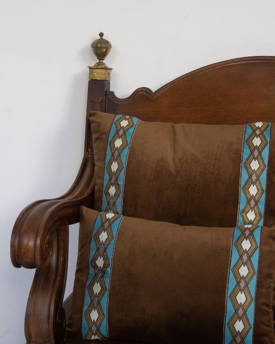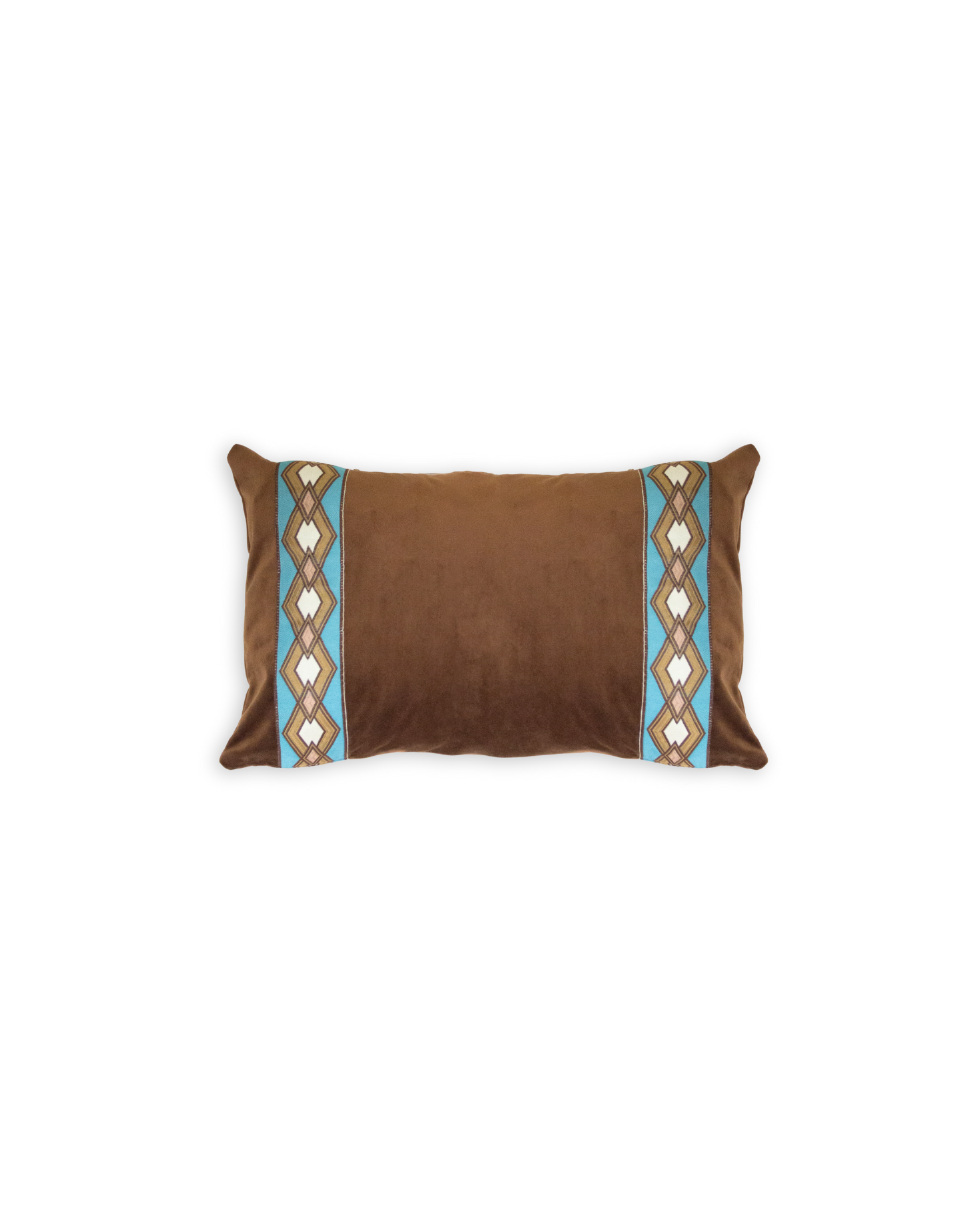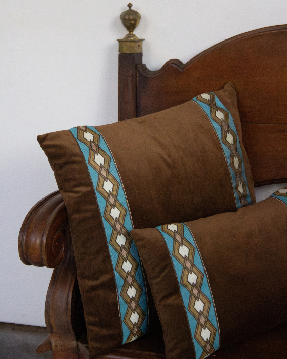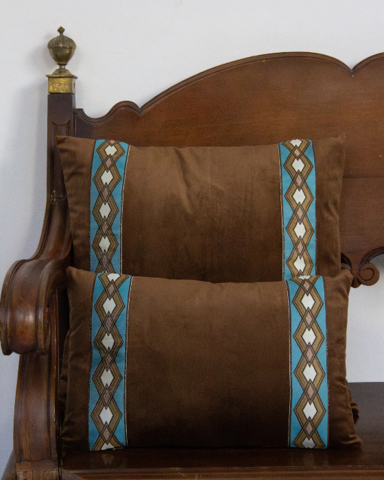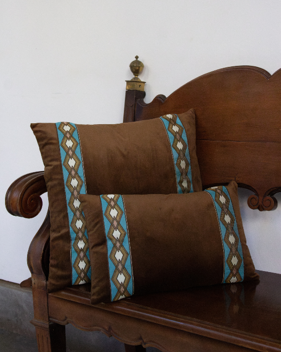Funda de cojín pequeño fabricado en terciopelo marrón con cenefa geométrica en tonos blancos, azules y ocres. Disponible también en azul.