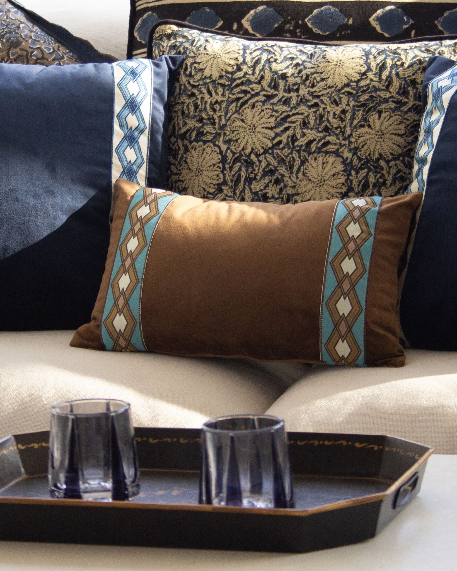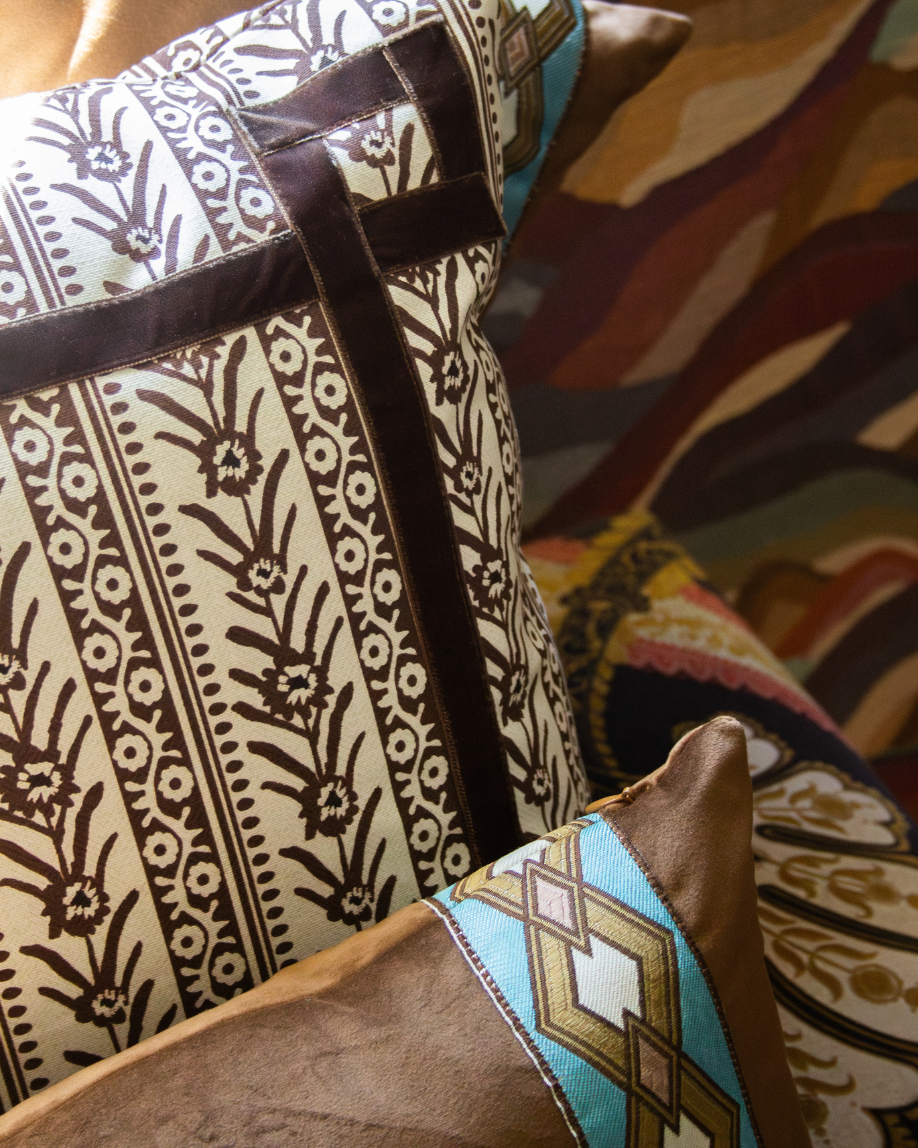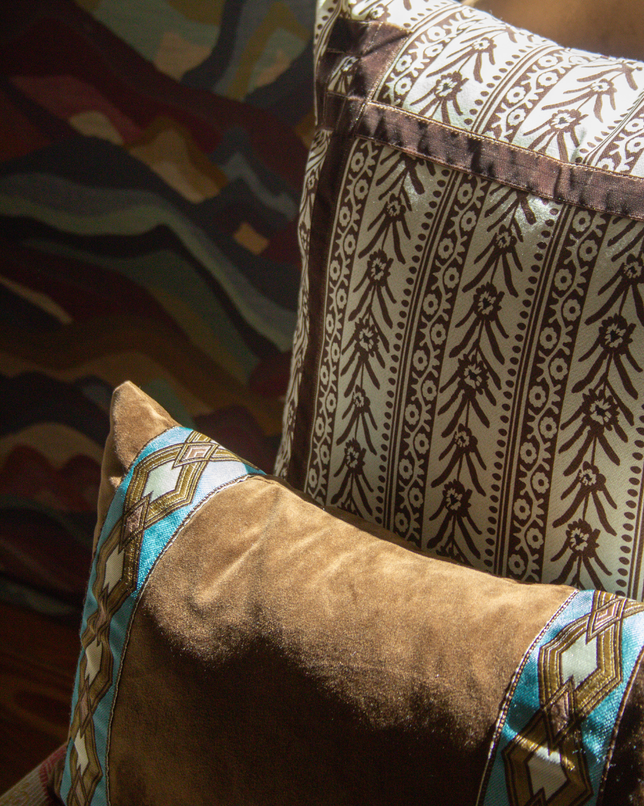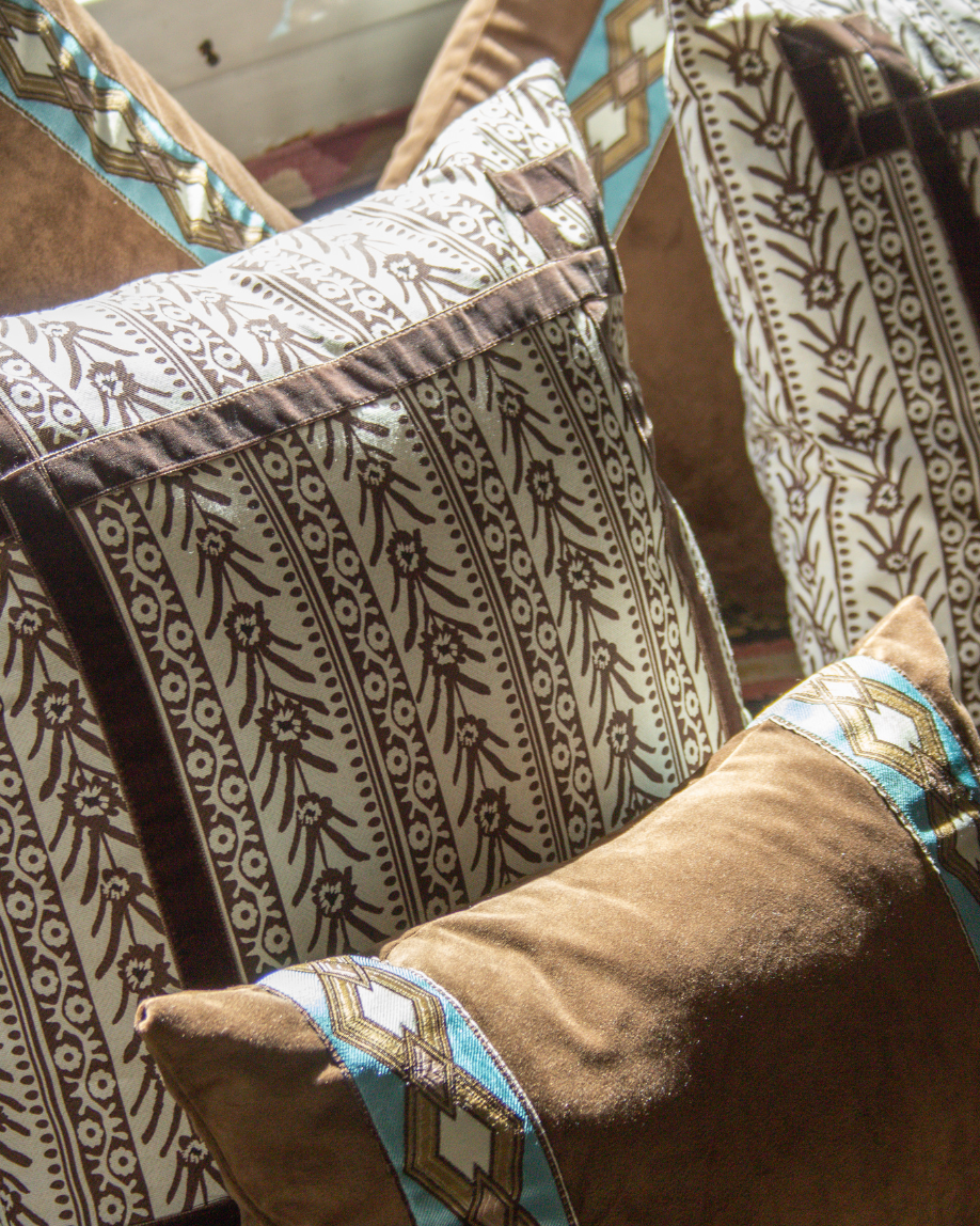 Funda de cojín pequeño fabricado en terciopelo marrón con cenefa geométrica en tonos blancos, azules y ocres. Disponible también en azul.