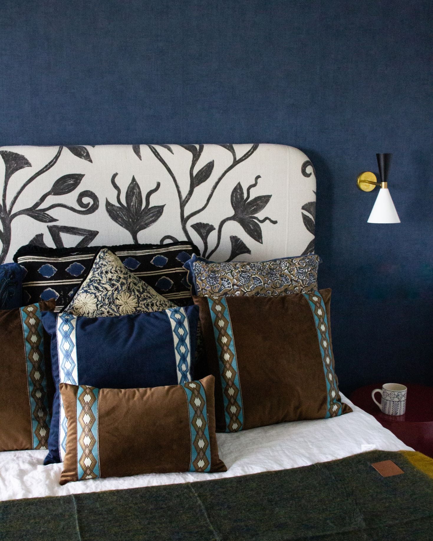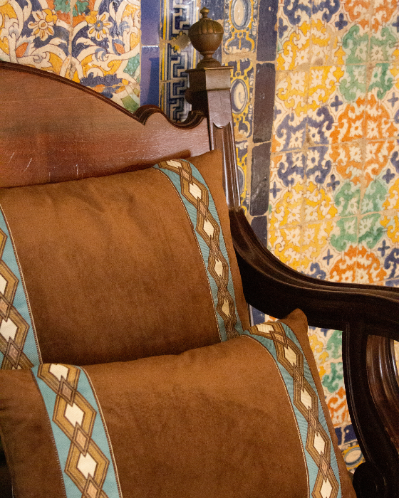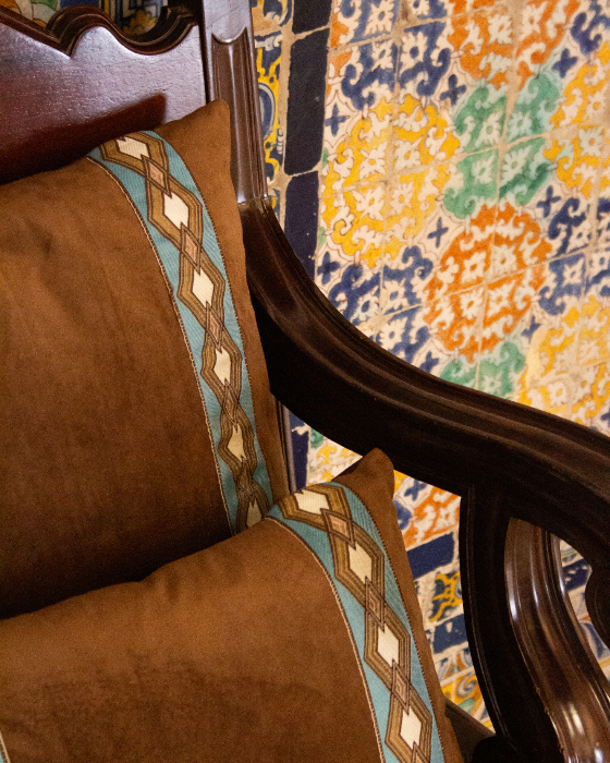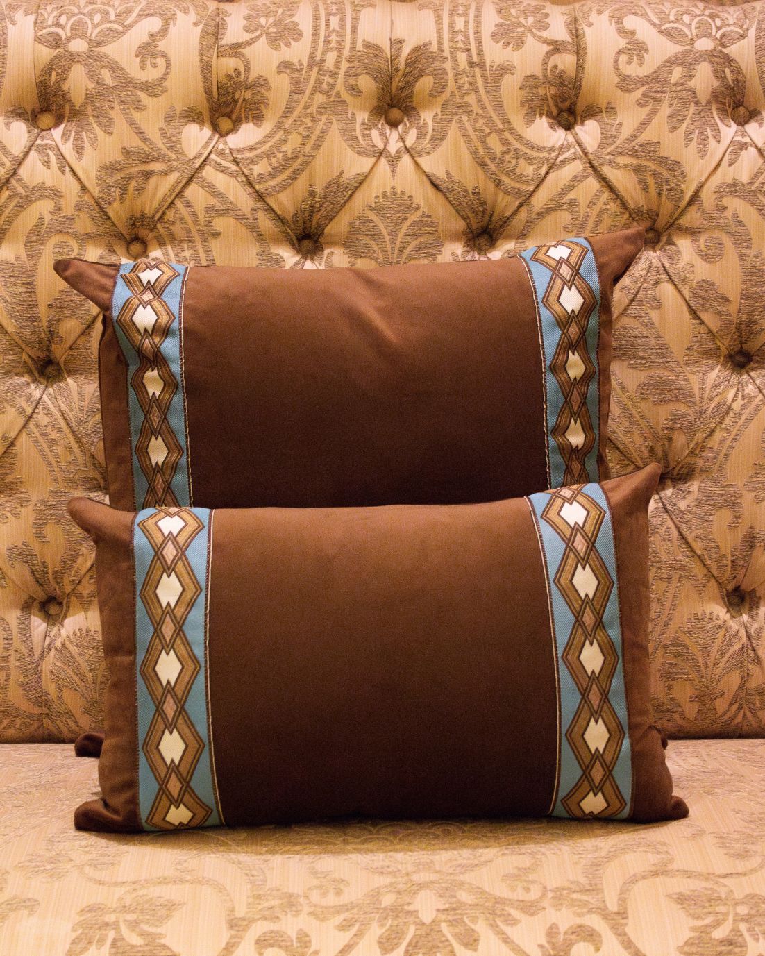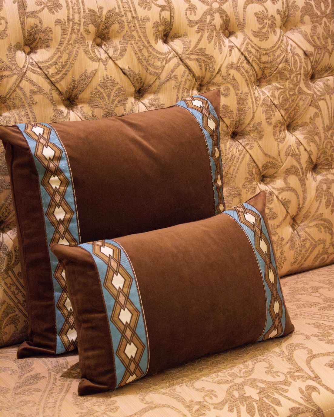 Funda de cojín pequeño fabricado en terciopelo marrón con cenefa geométrica en tonos blancos, azules y ocres. Disponible también en azul.