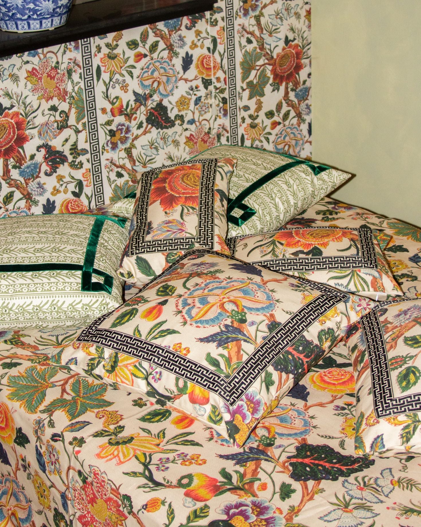 Funda de cojín grande fabricado en algodón 100%. Estampado floral en tonos calderas, beige y verdes con detalle de cenefa geométrica bordada en negro.