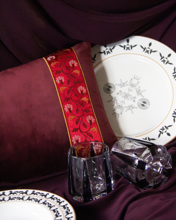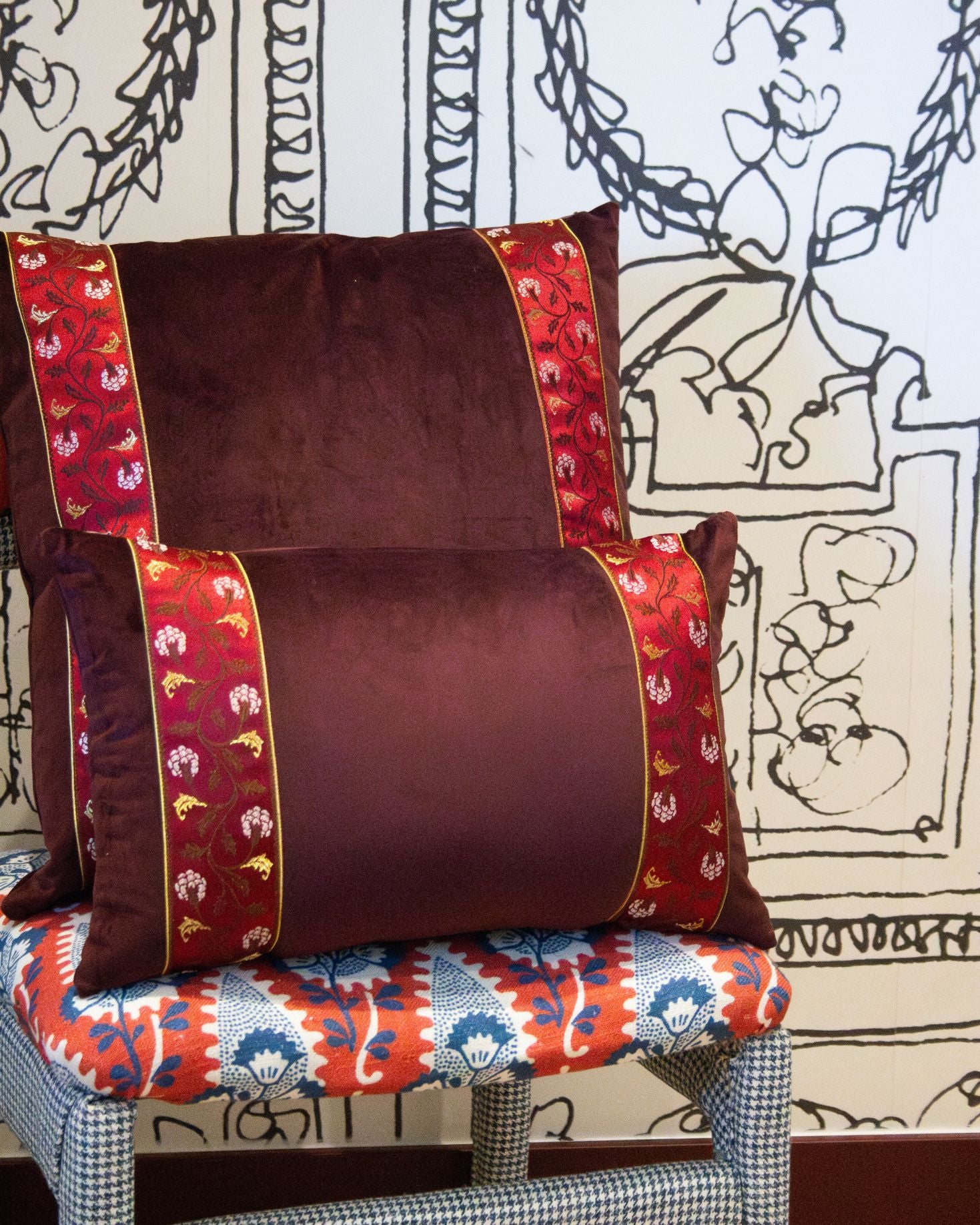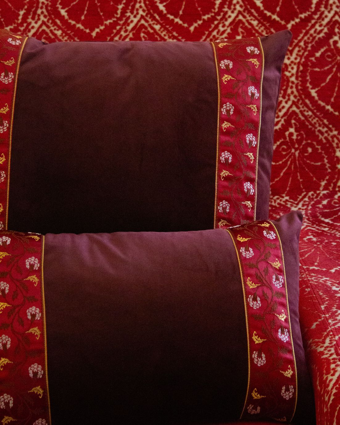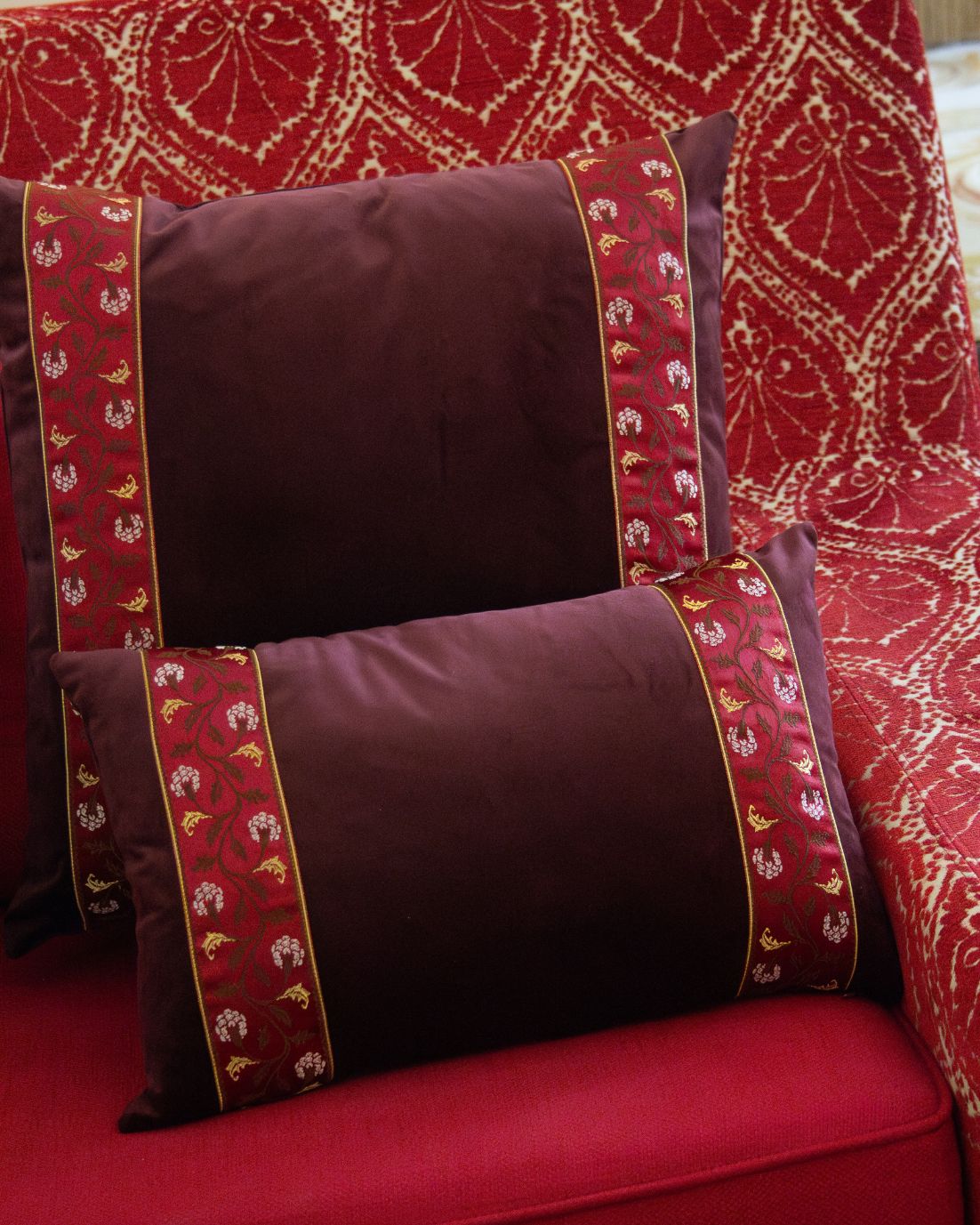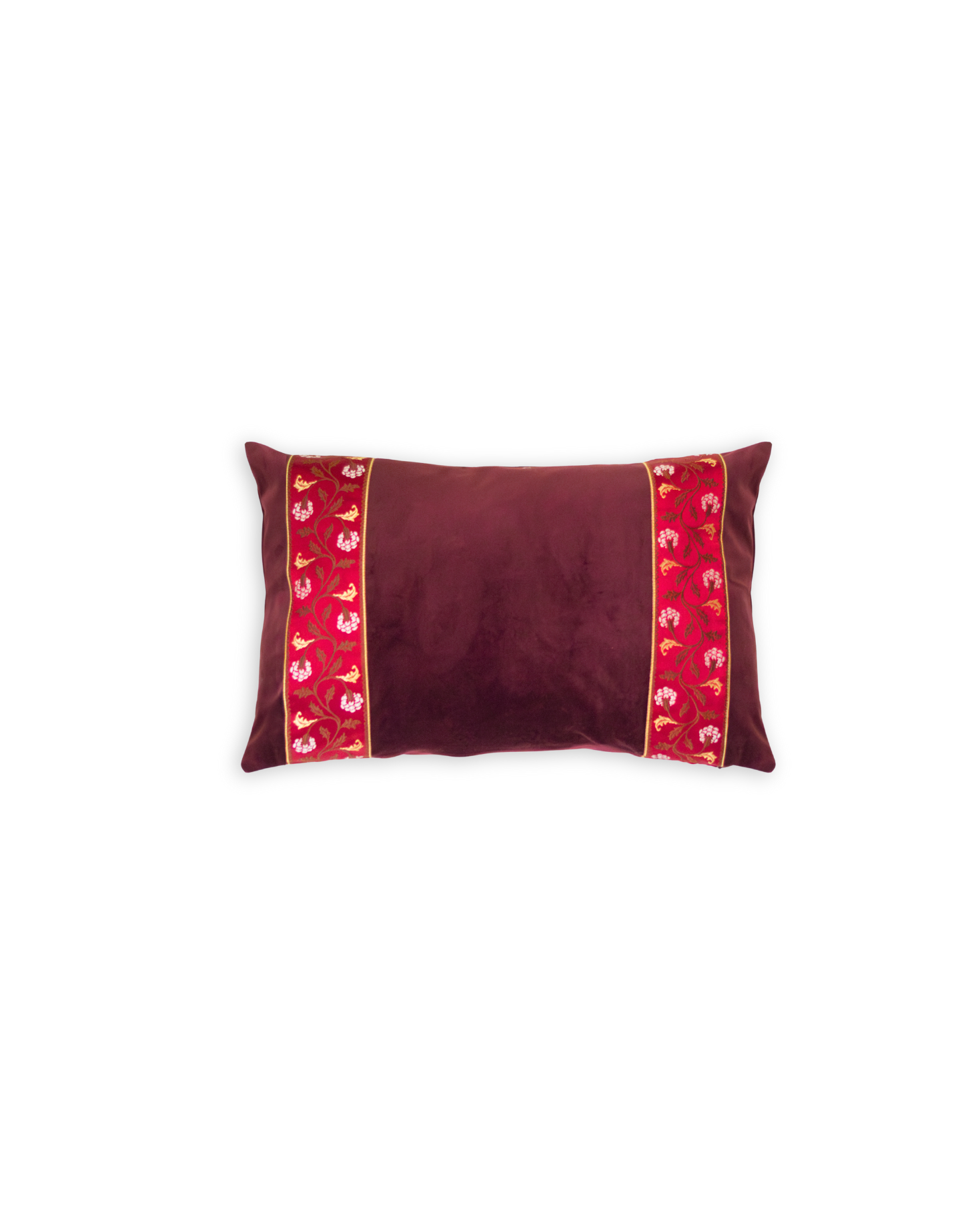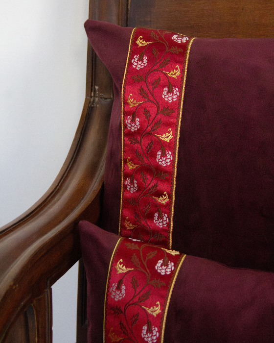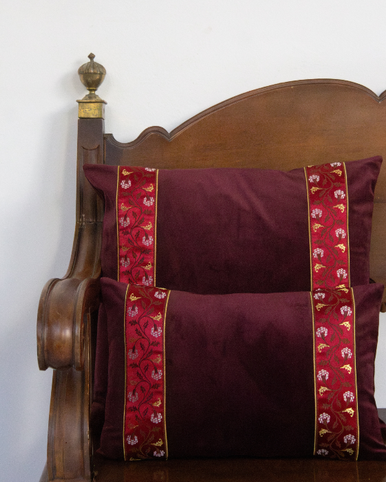Funda de cojín pequeño fabricado en terciopelo burdeos con cenefa decorativa vertical con detalles florales en tonos burdeos y dorado.