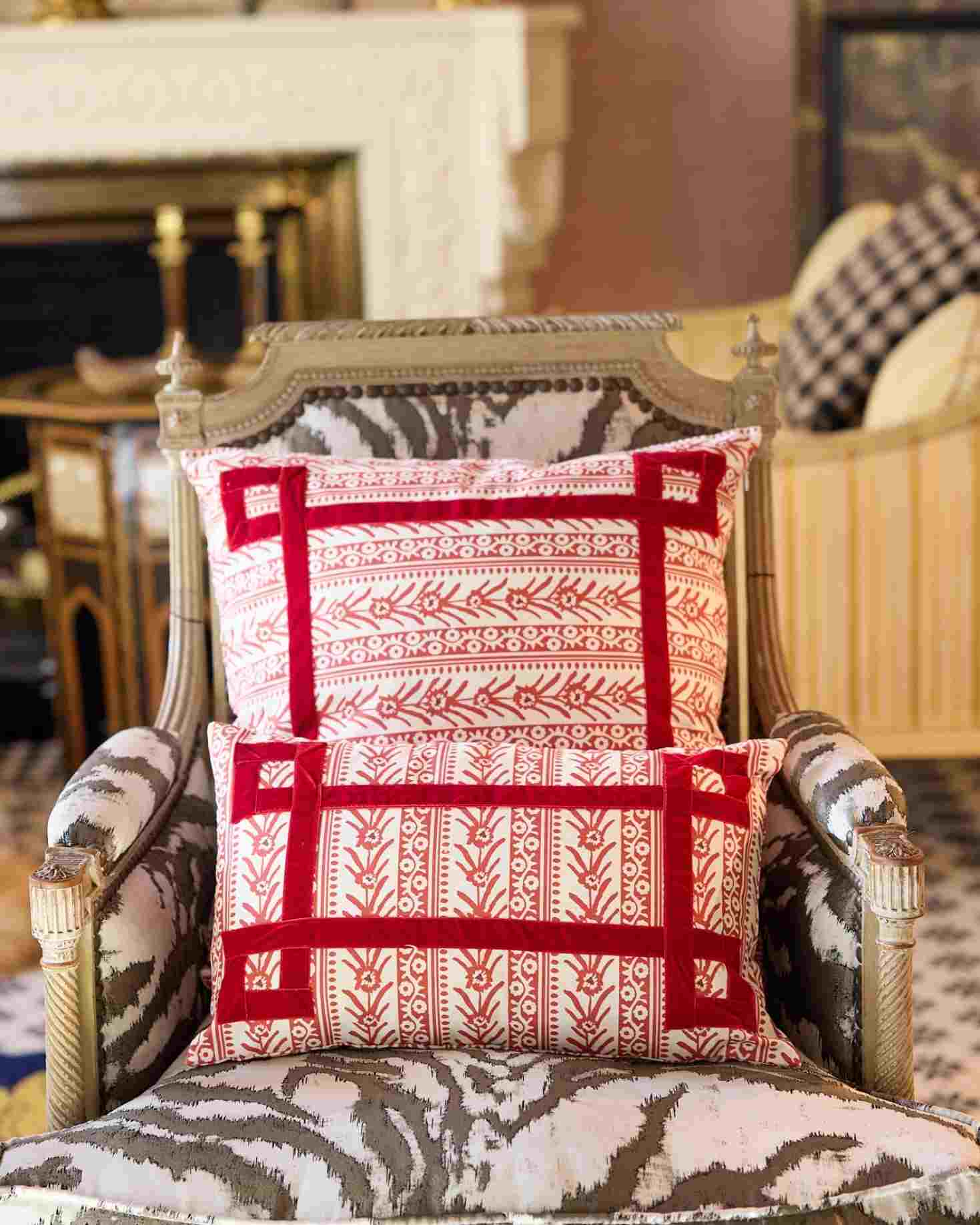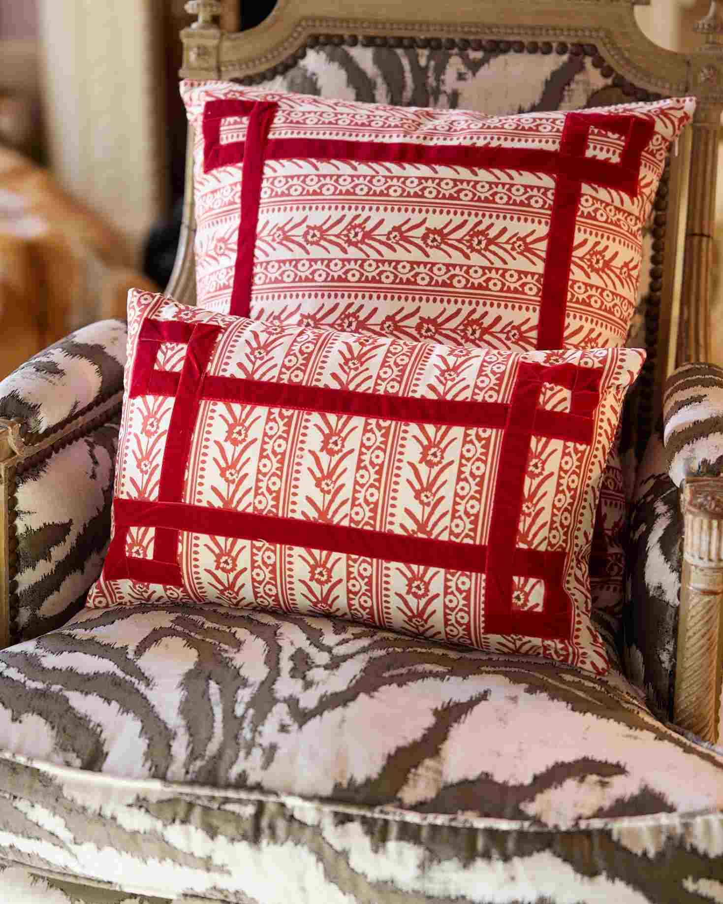 Funda de cojín pequeño fabricado en algodón 100%. Estampado con grecas florales en color rojo y detalle de cenefa de terciopelo rojo. Disponible también en color mostaza, marrón y verde.