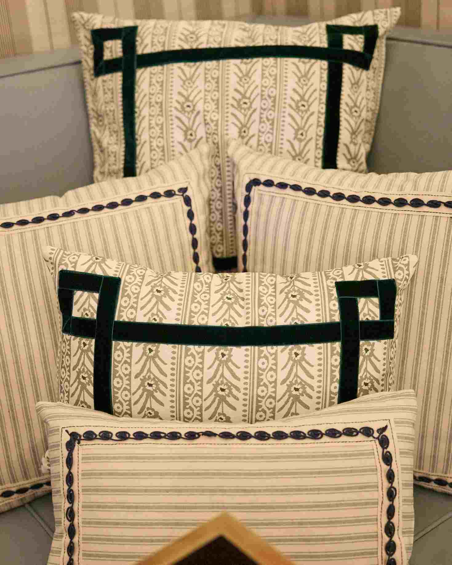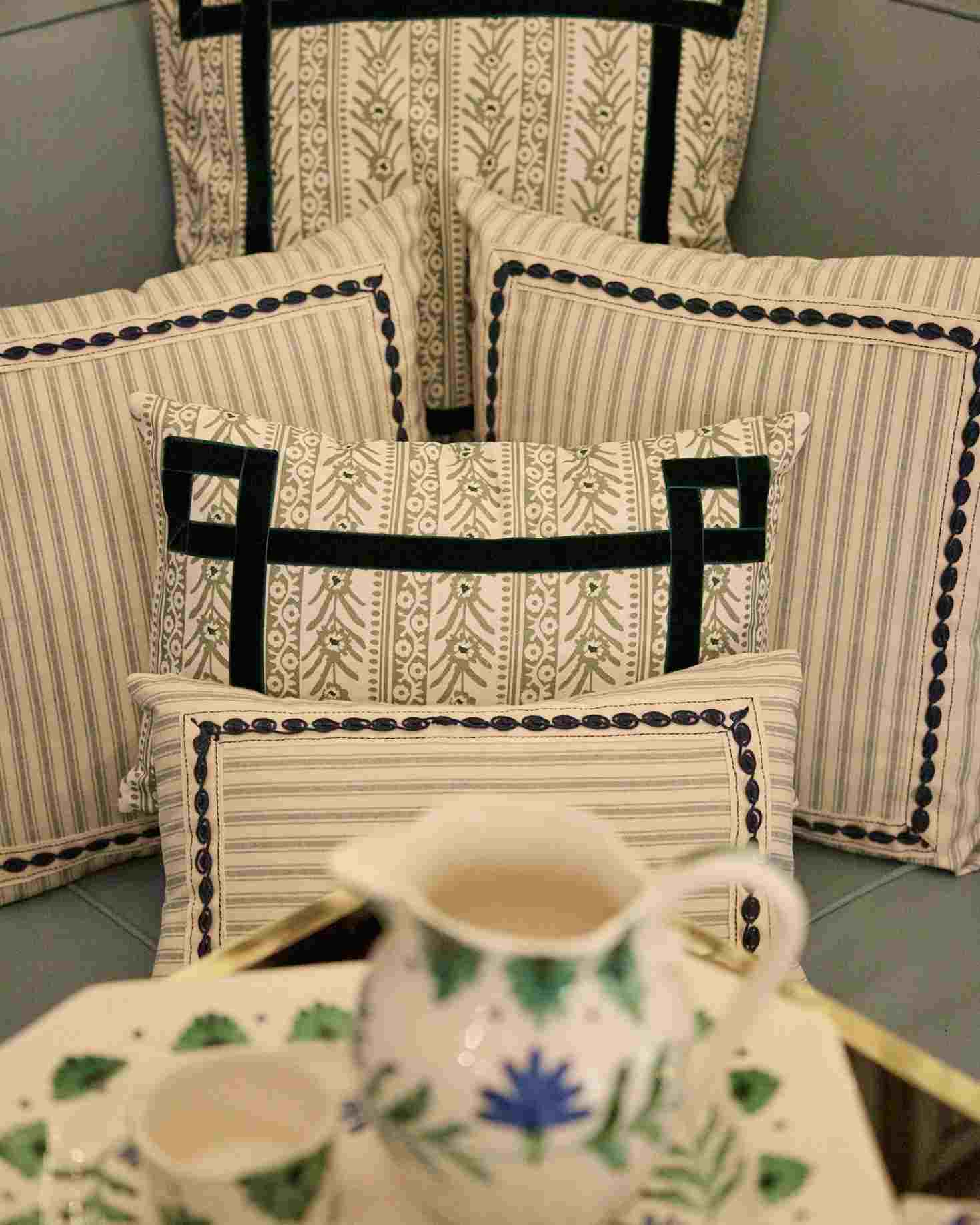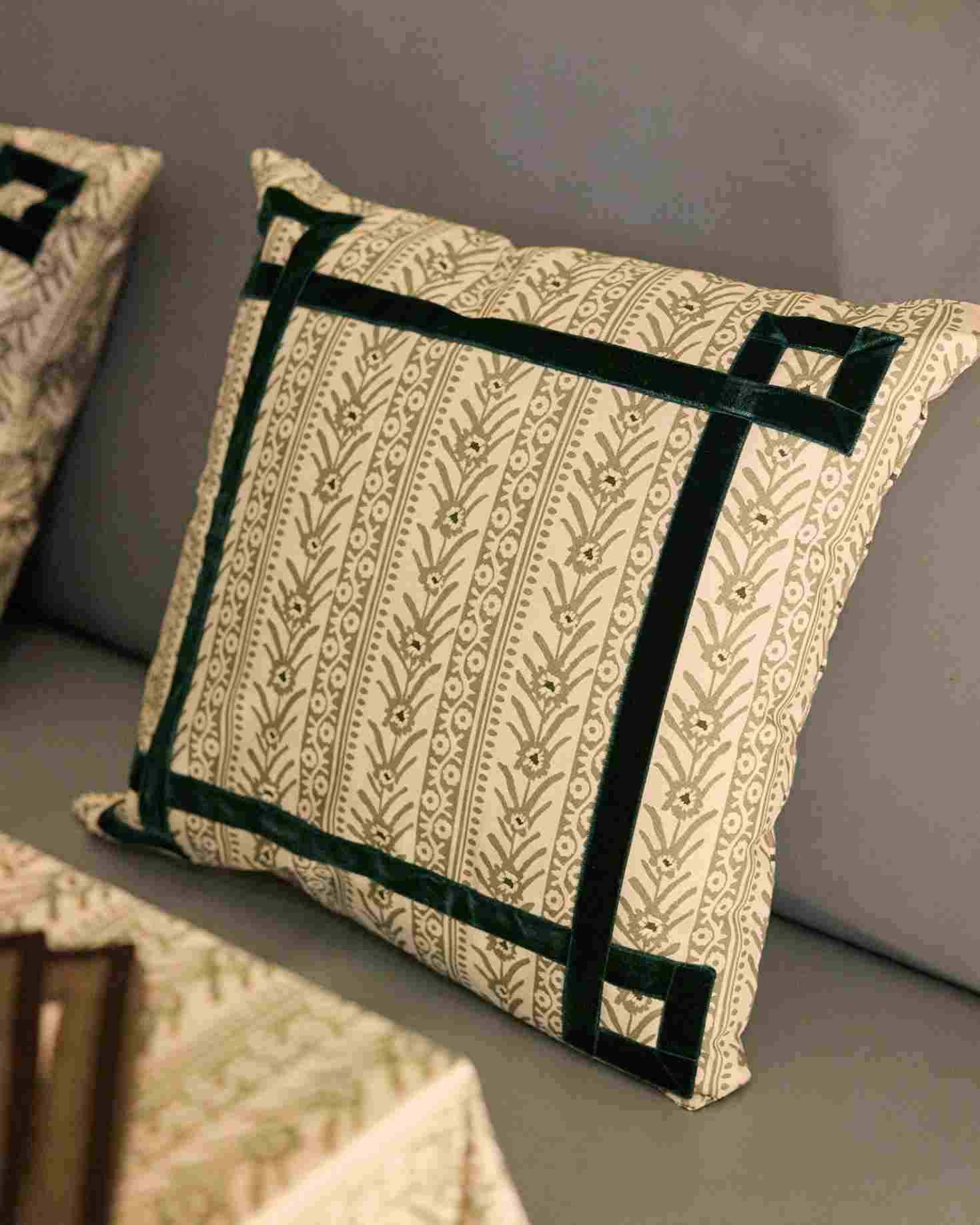 Funda de cojín grande fabricado en algodón 100%. Estampado con grecas florales en color verde y detalle de cenefa de terciopelo verde. Disponible también en color mostaza, rojo y marrón.