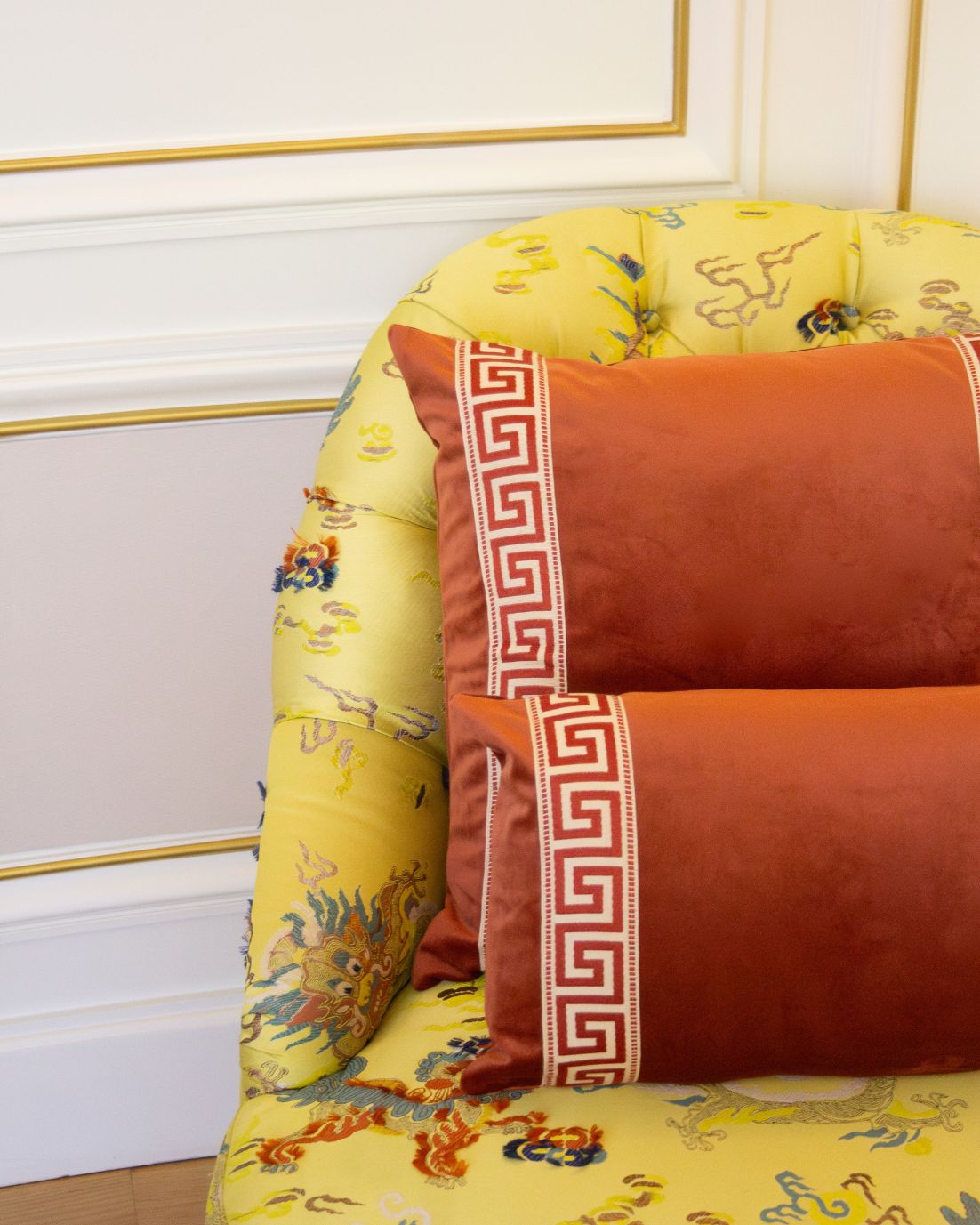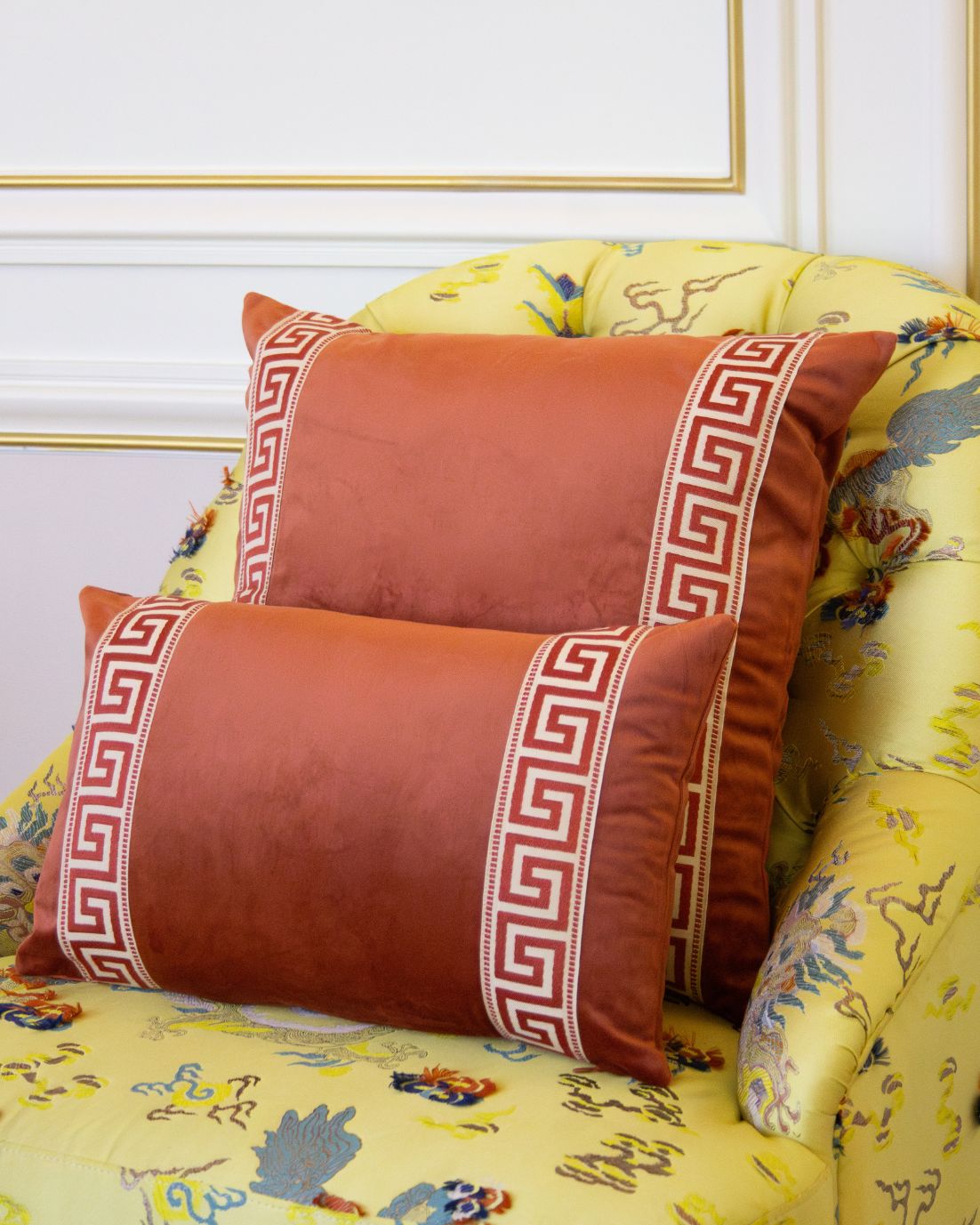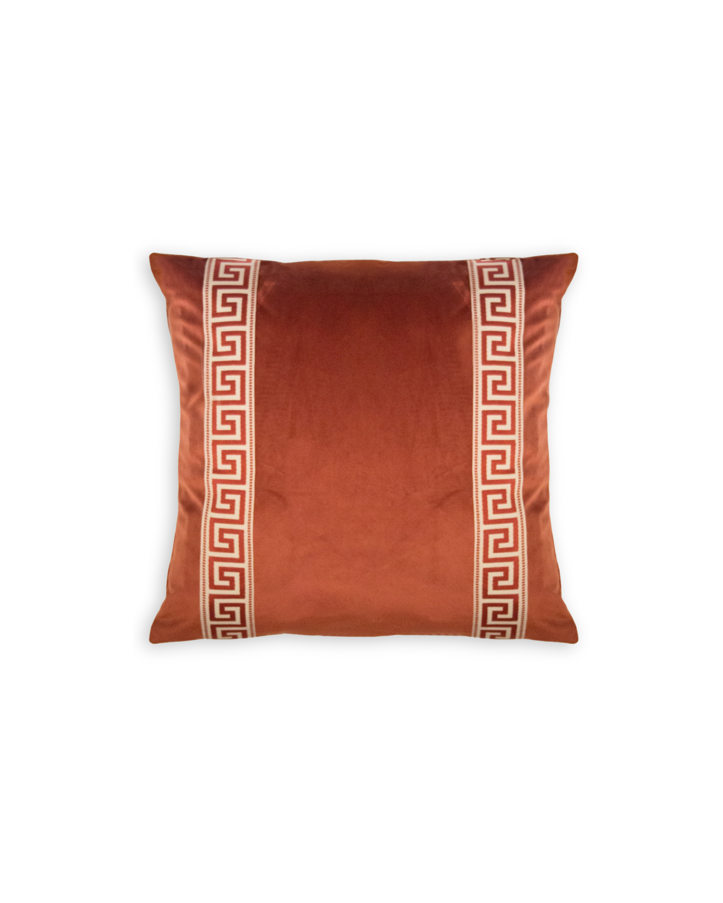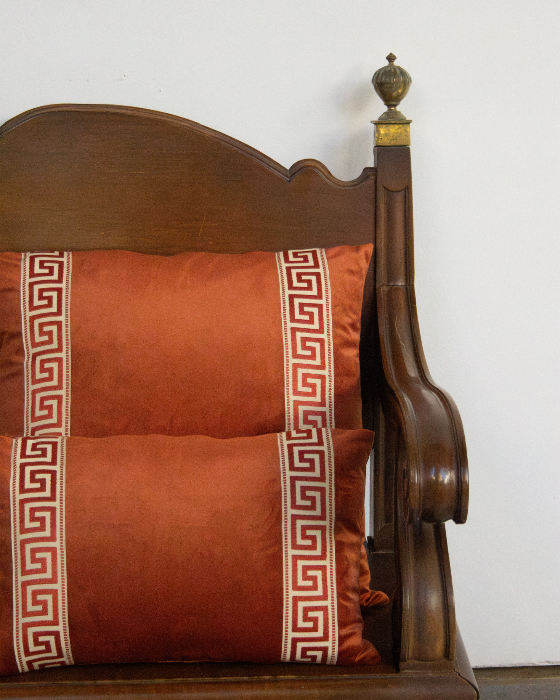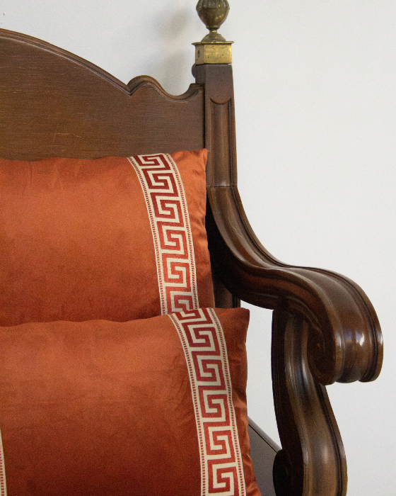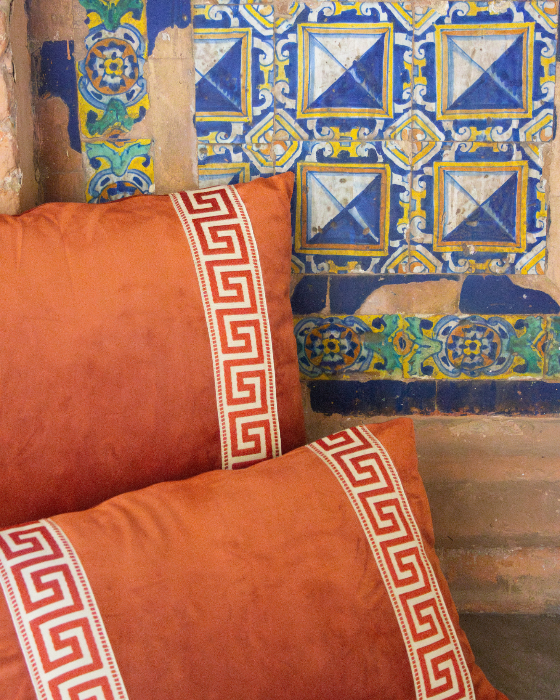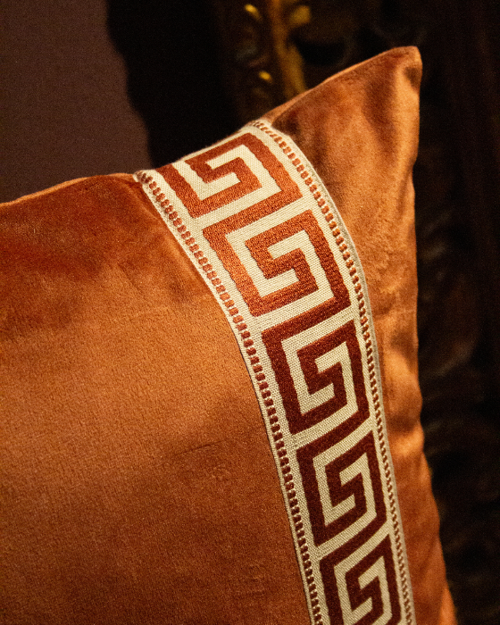Funda de cojín grande fabricado en terciopelo caldera con cenefa decorativa con detalles geométricos en tonos caldera.