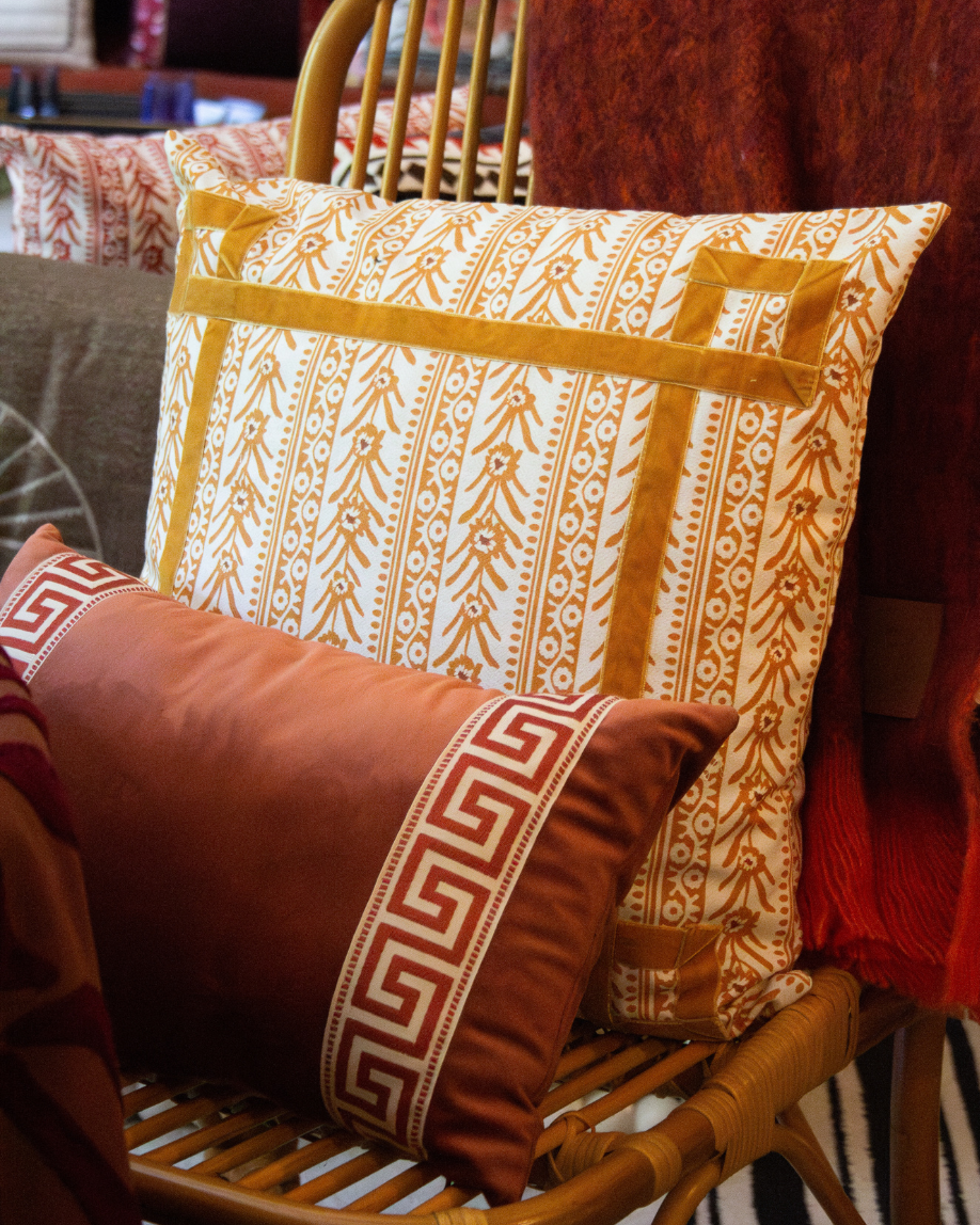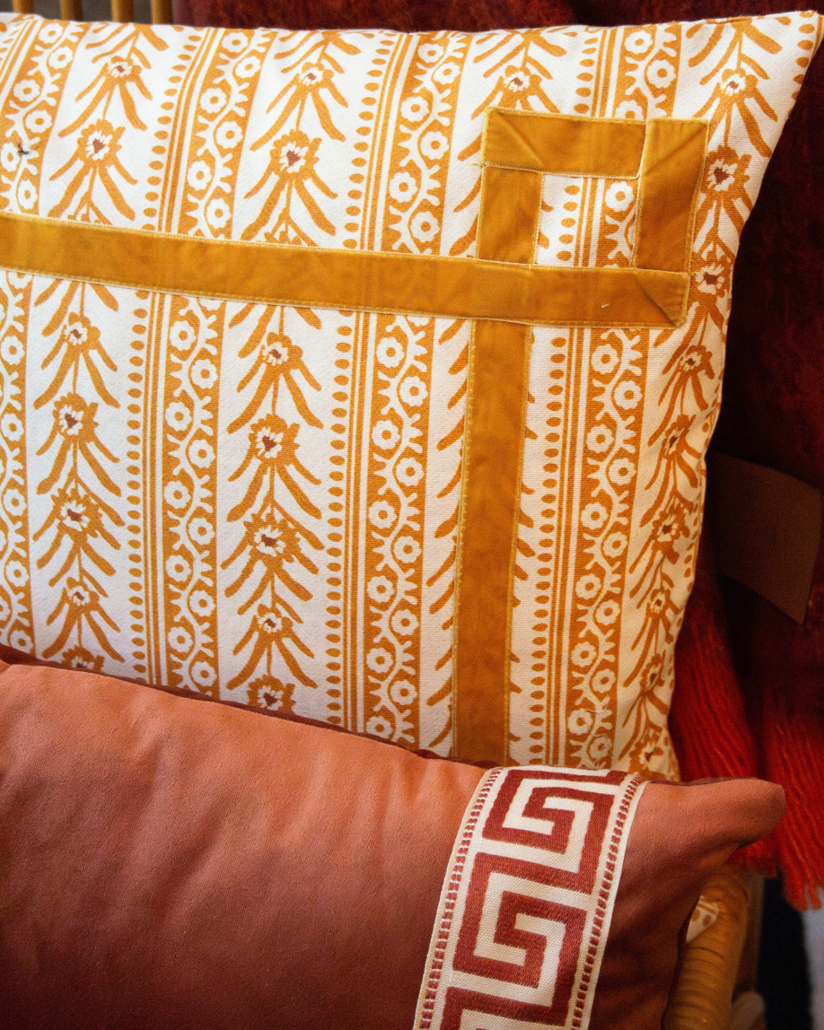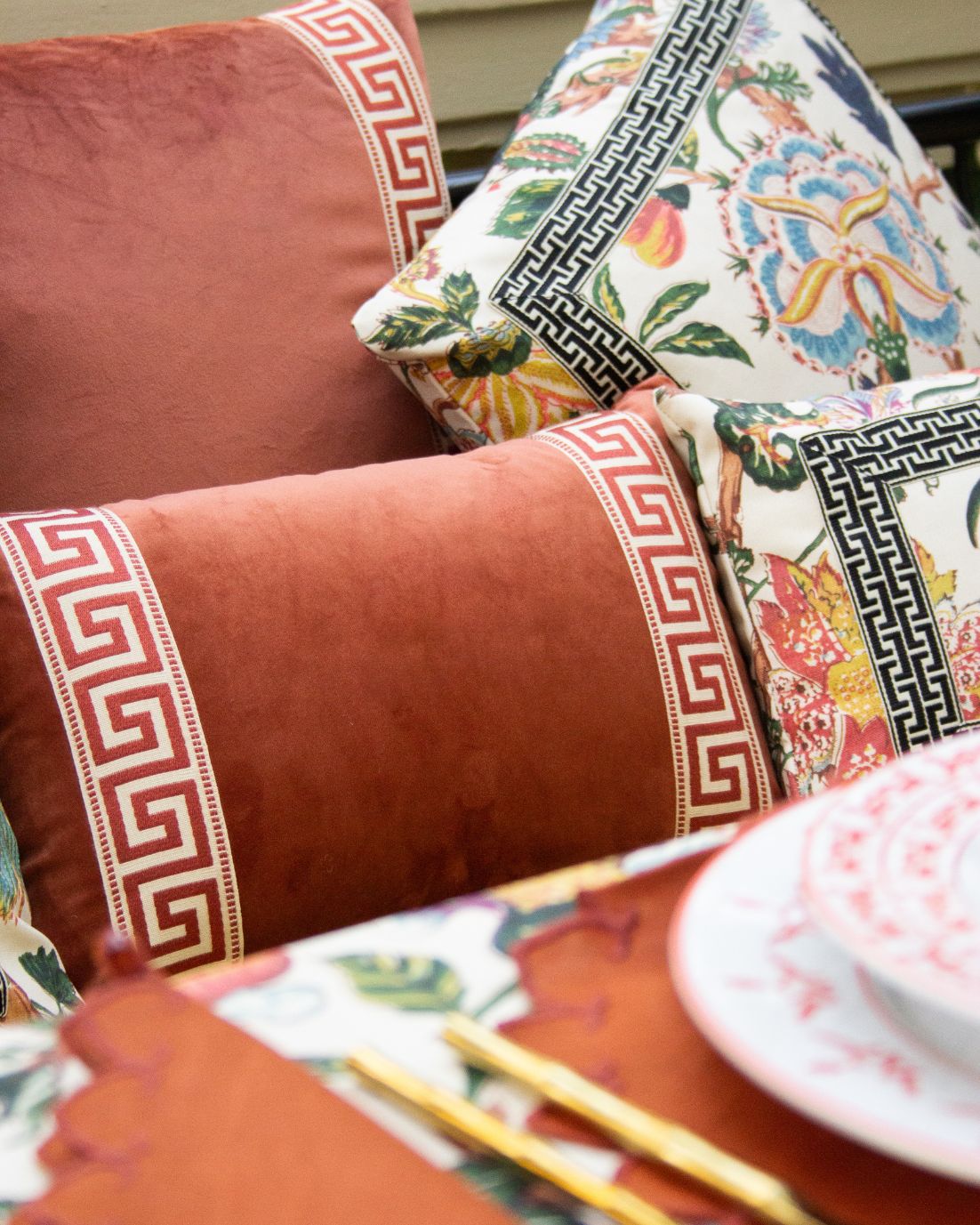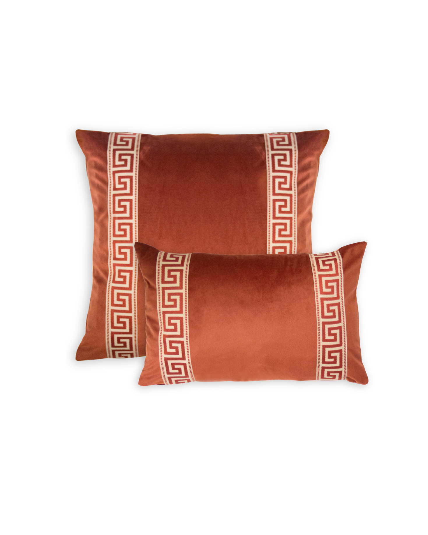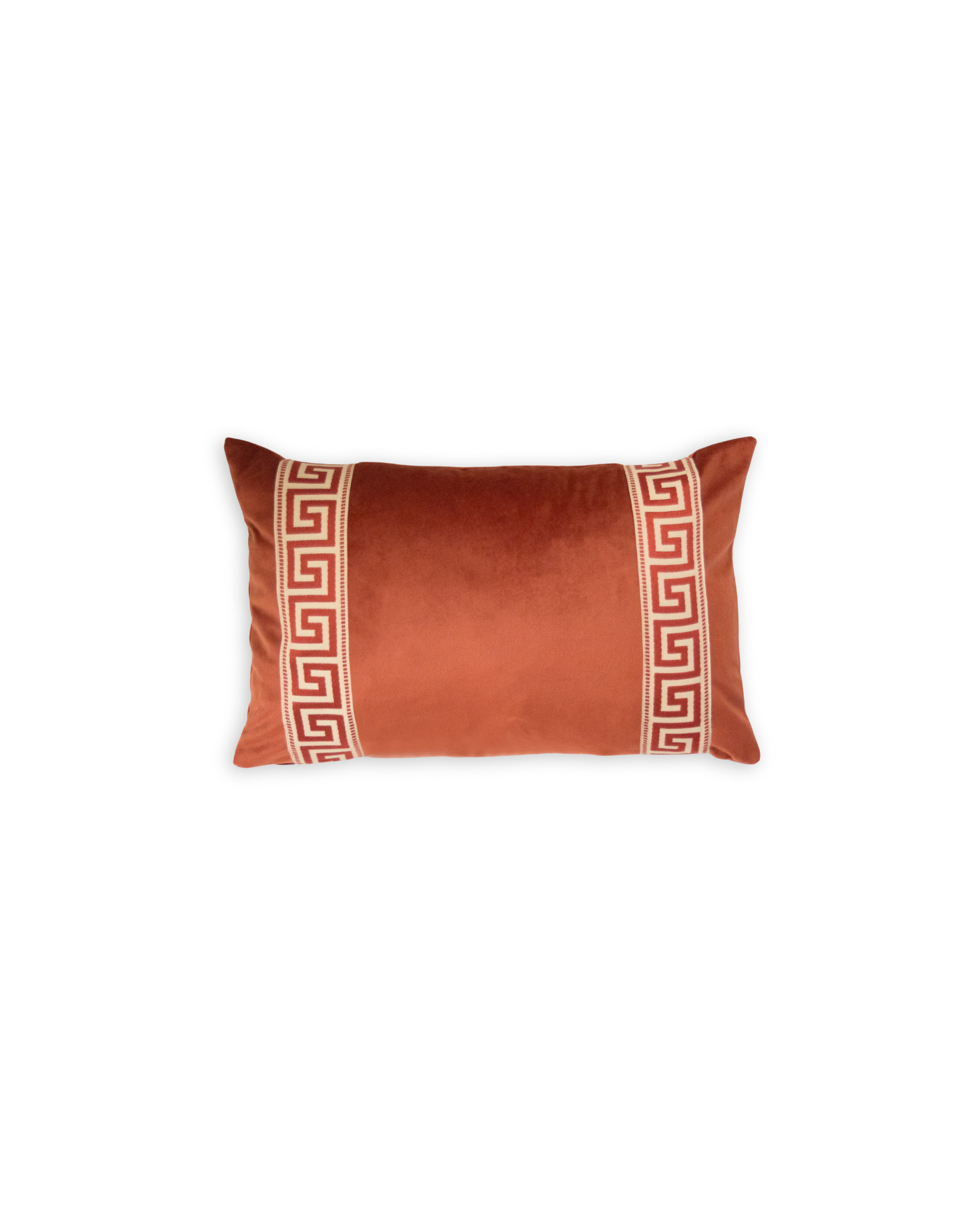 Funda de cojín pequeño fabricado en terciopelo caldera con cenefa decorativa con detalles geométricos en tonos caldera.