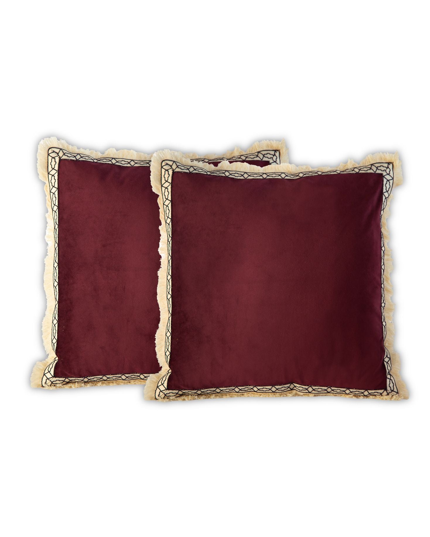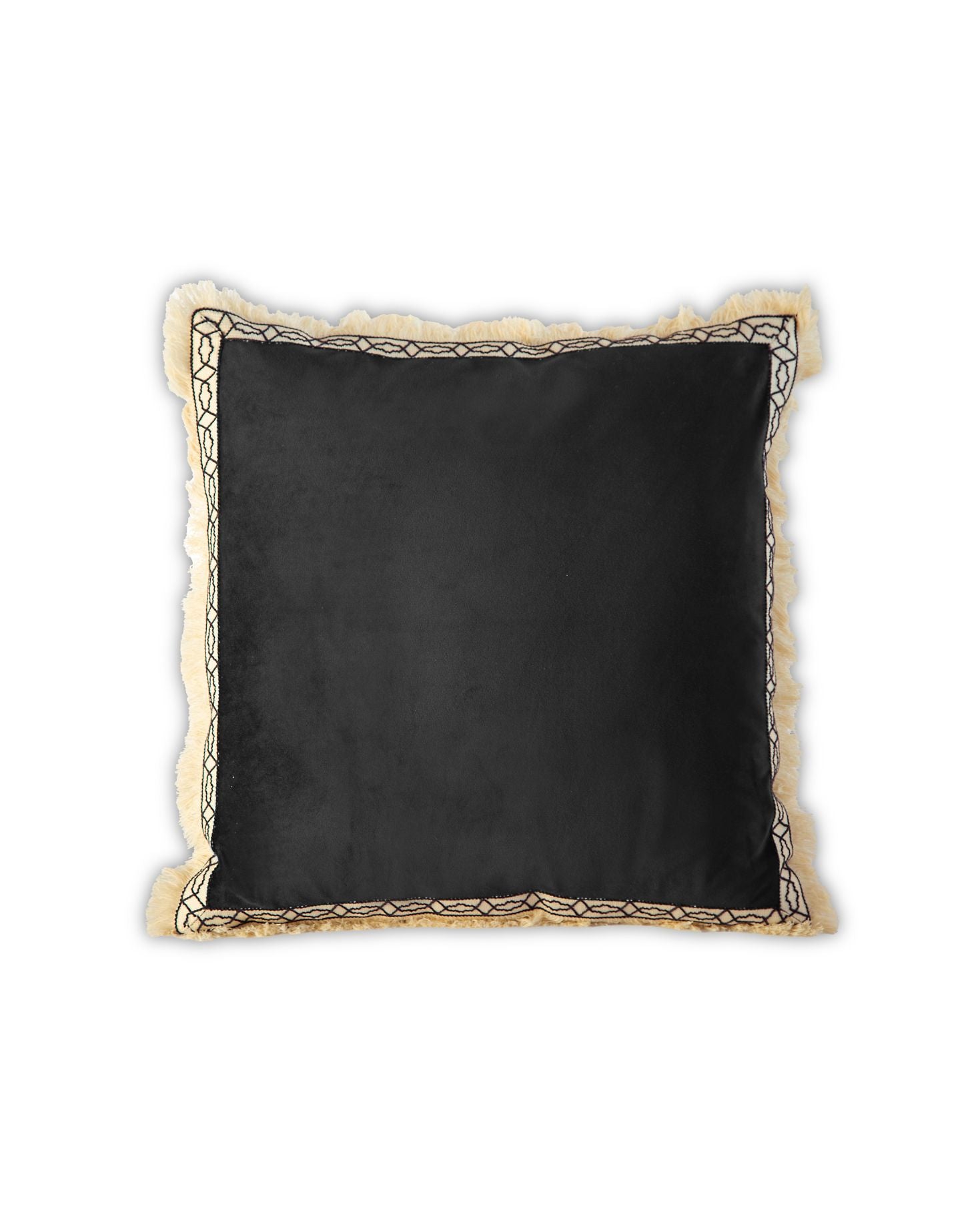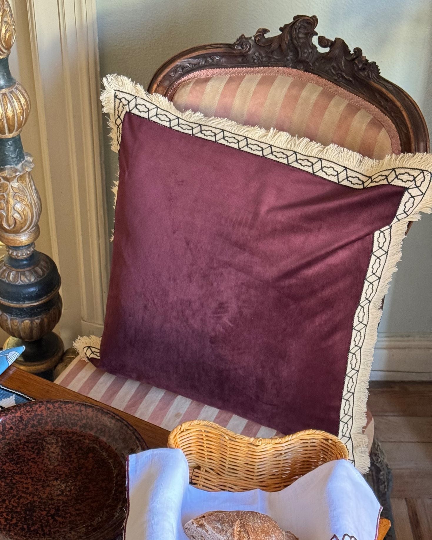 Cojín grande de terciopelo con greca exterior de flecos. Disponible en cuatro colores: burdeos, azul, verde y negro. No incluye relleno.