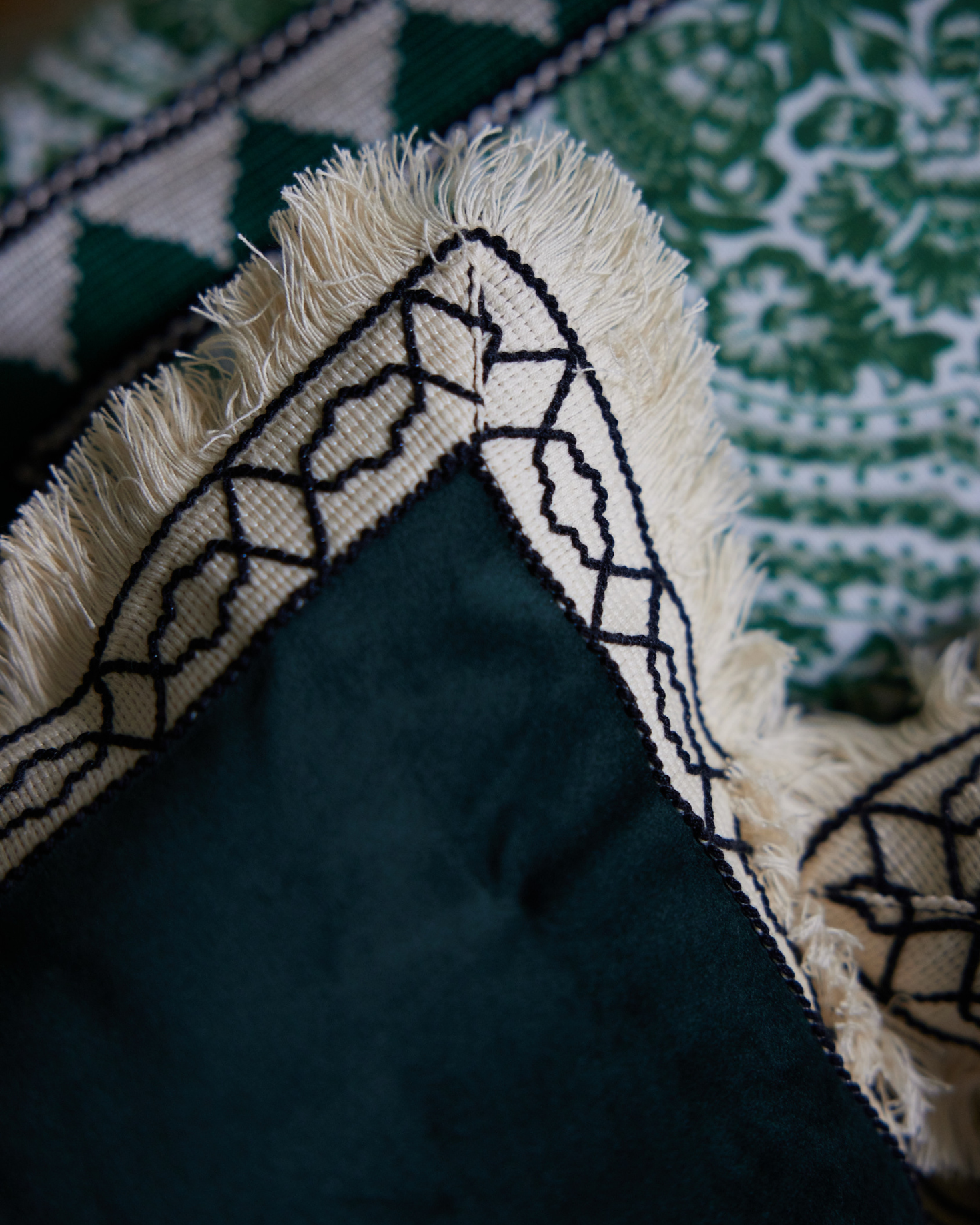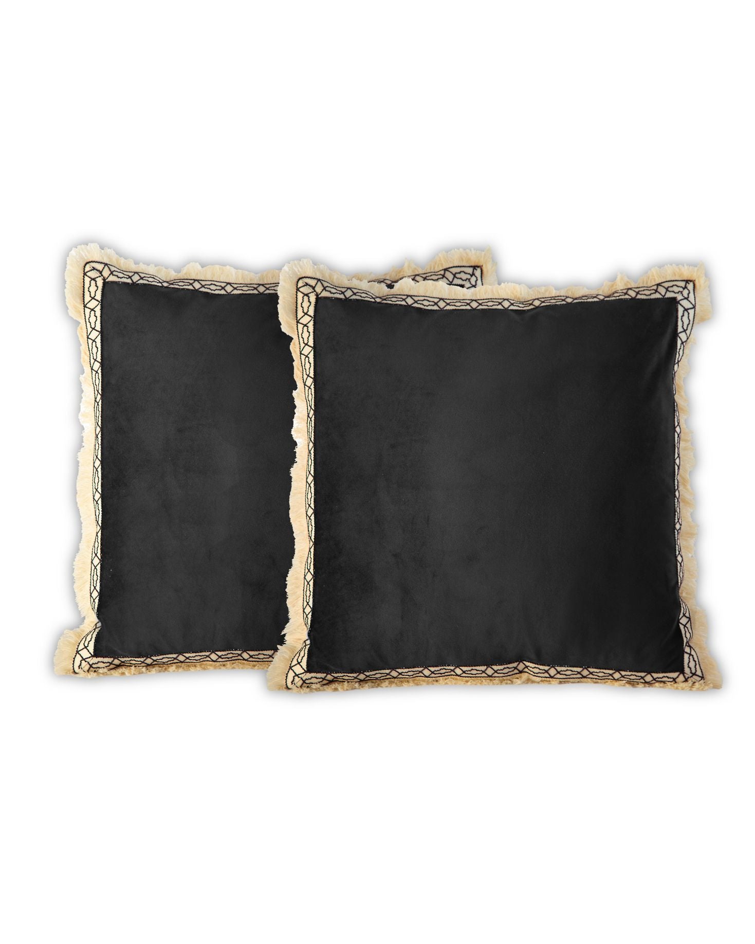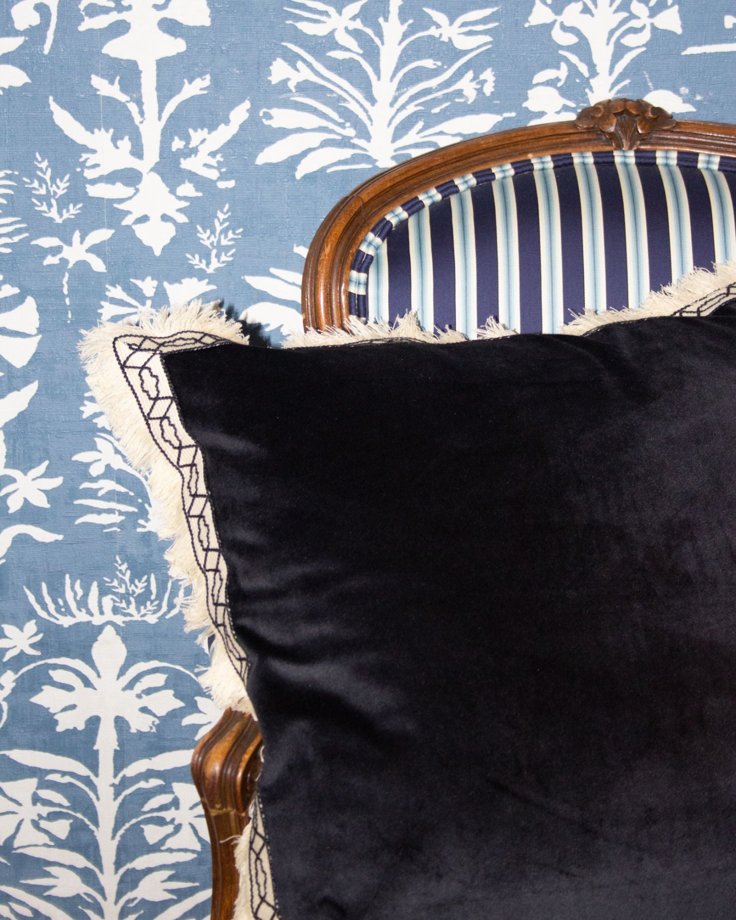 Cojín grande de terciopelo con greca exterior de flecos. Disponible en cuatro colores: burdeos, azul, verde y negro. No incluye relleno.