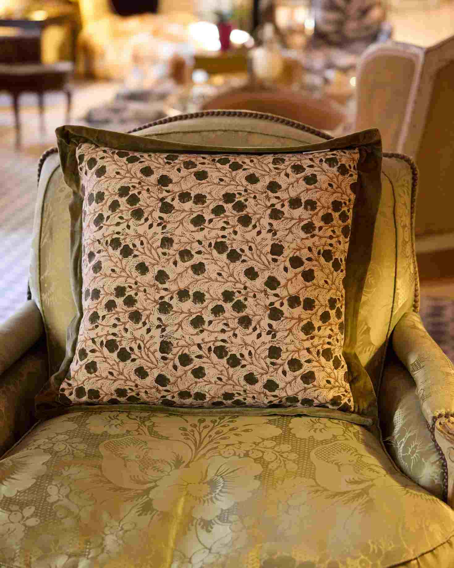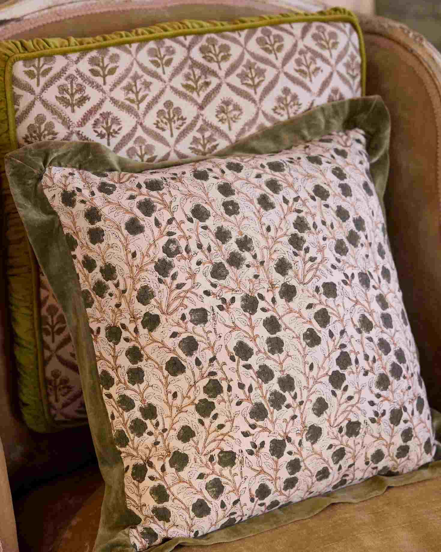 Cojín de algodón con estampado floral en tonos verdes, naranjas y beige con detalle de ribete de terciopelo verde. Este producto incluye el relleno.