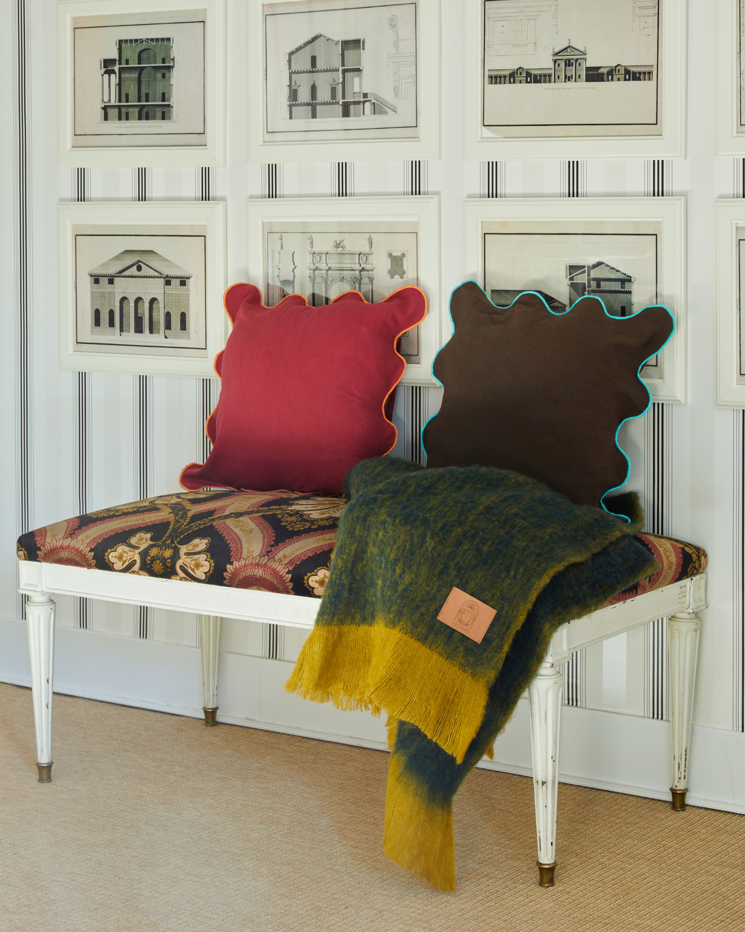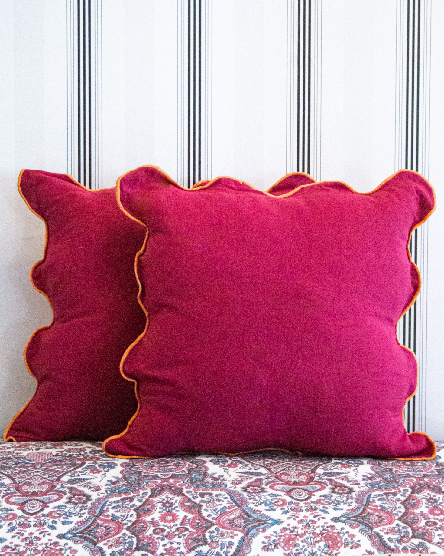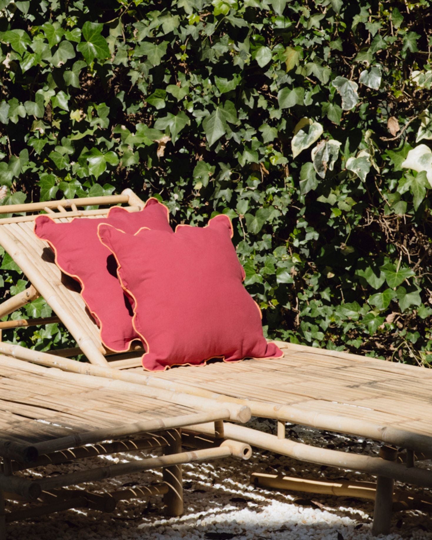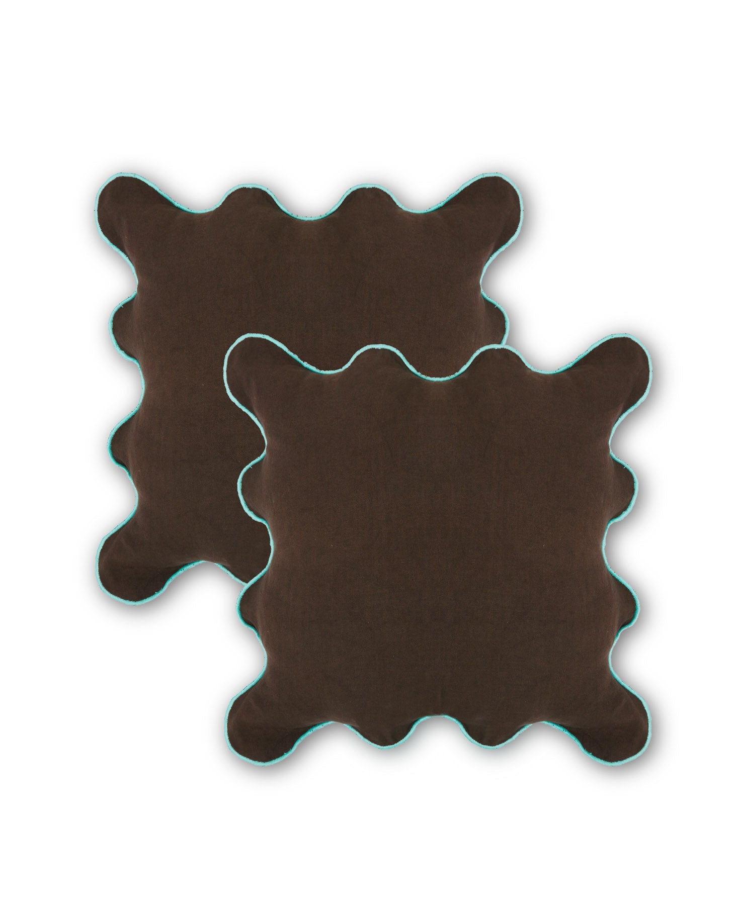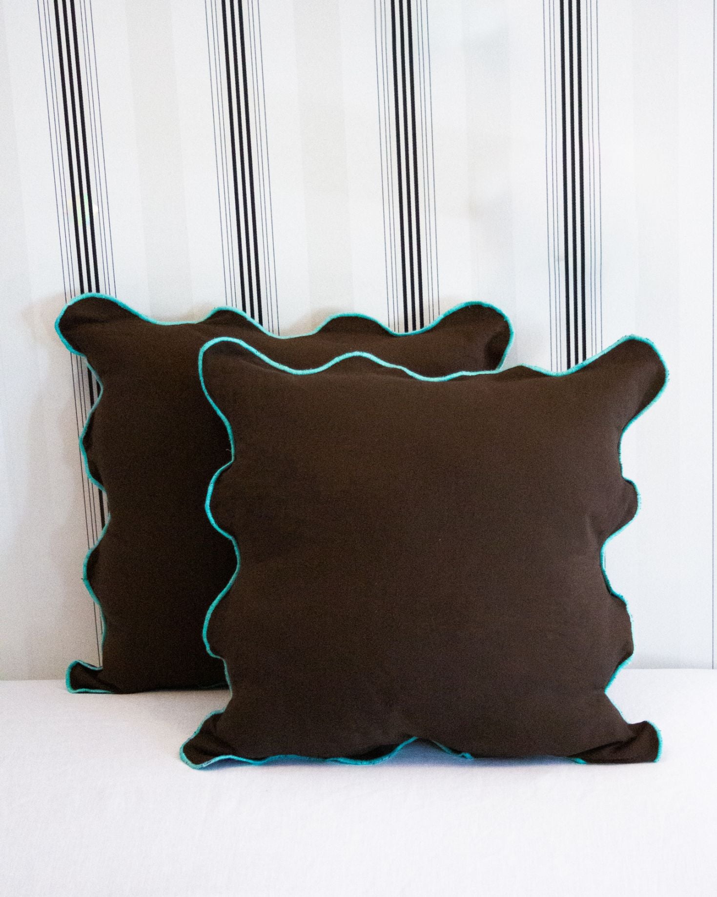 Cojín en tamaño mediano con lateral ondulado fabricado en algodón 100%. Disponible en color marrón y en burdeos. Incluye relleno.