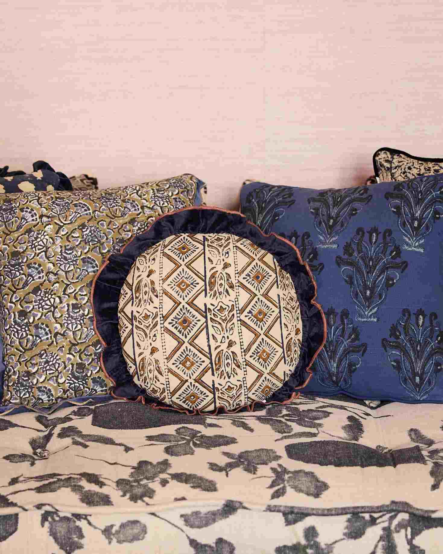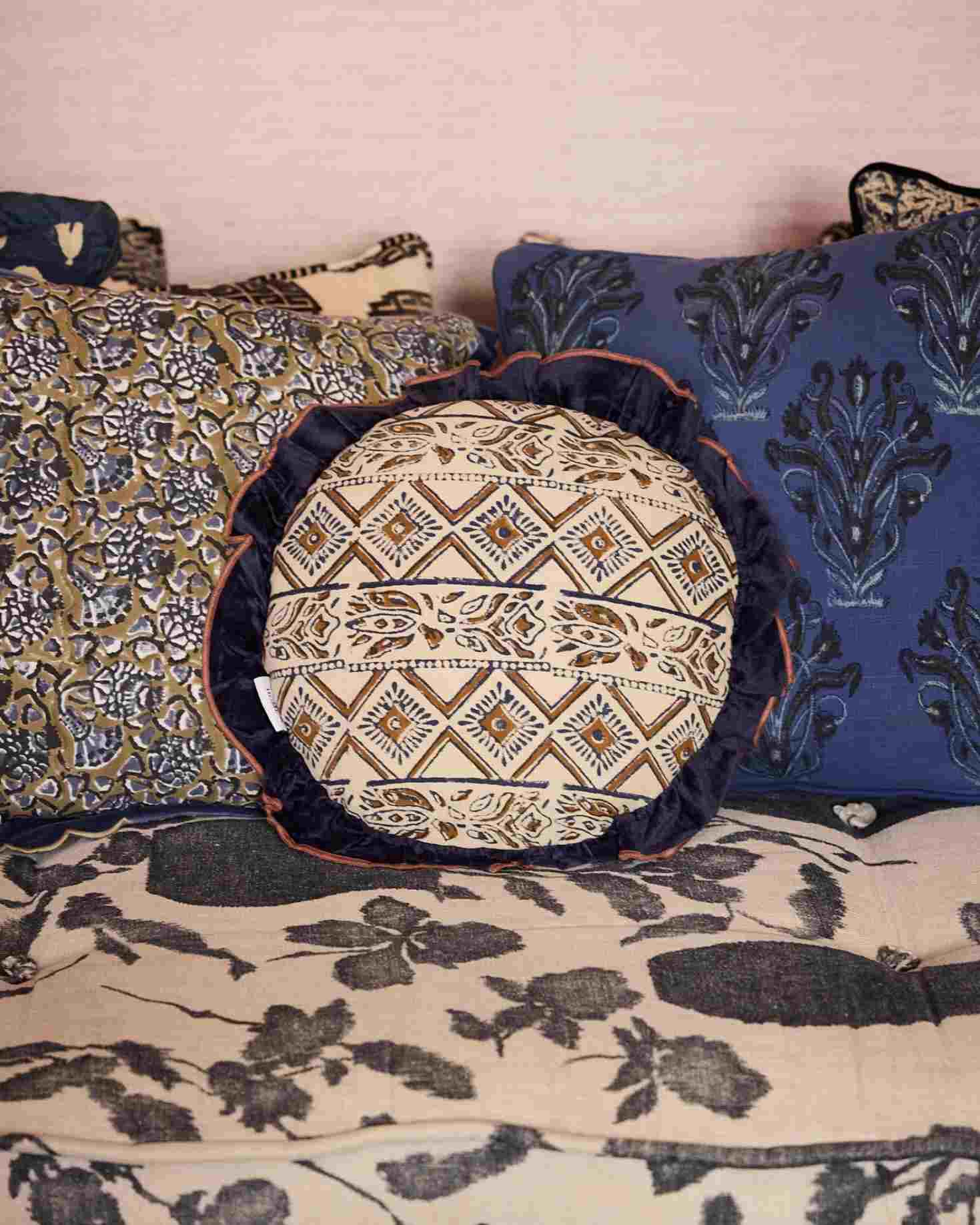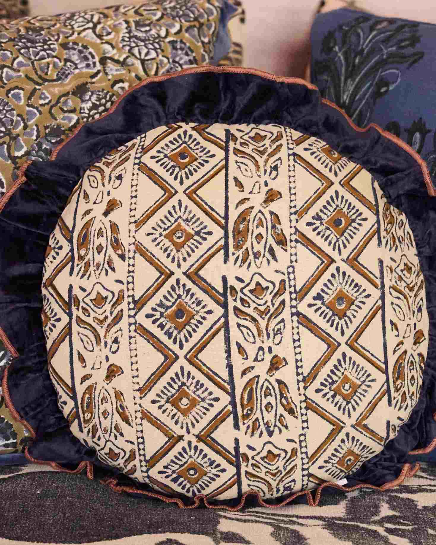 Cojín redondo de algodón con estampado geométrico en tonos azules, marrones y beige con volante azul de terciopelo. Este producto incluye el relleno.
