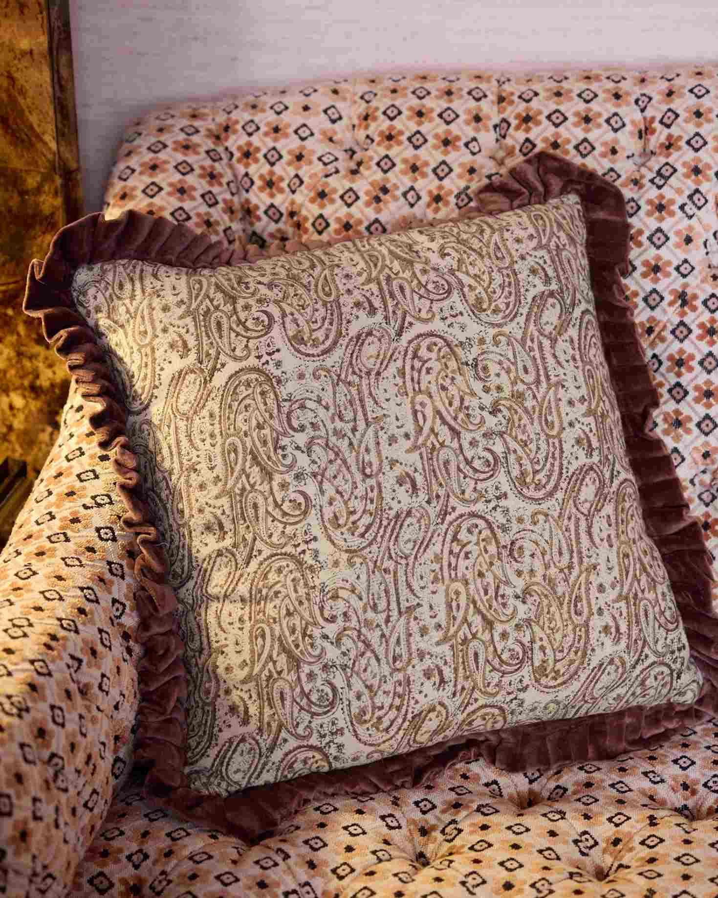 Cojín de algodón con estampado de paisley en tonos burdeos, rosas, y blanco con detalle de volante en color vino. Este producto incluye el relleno.