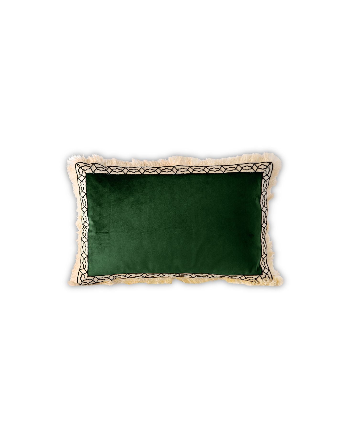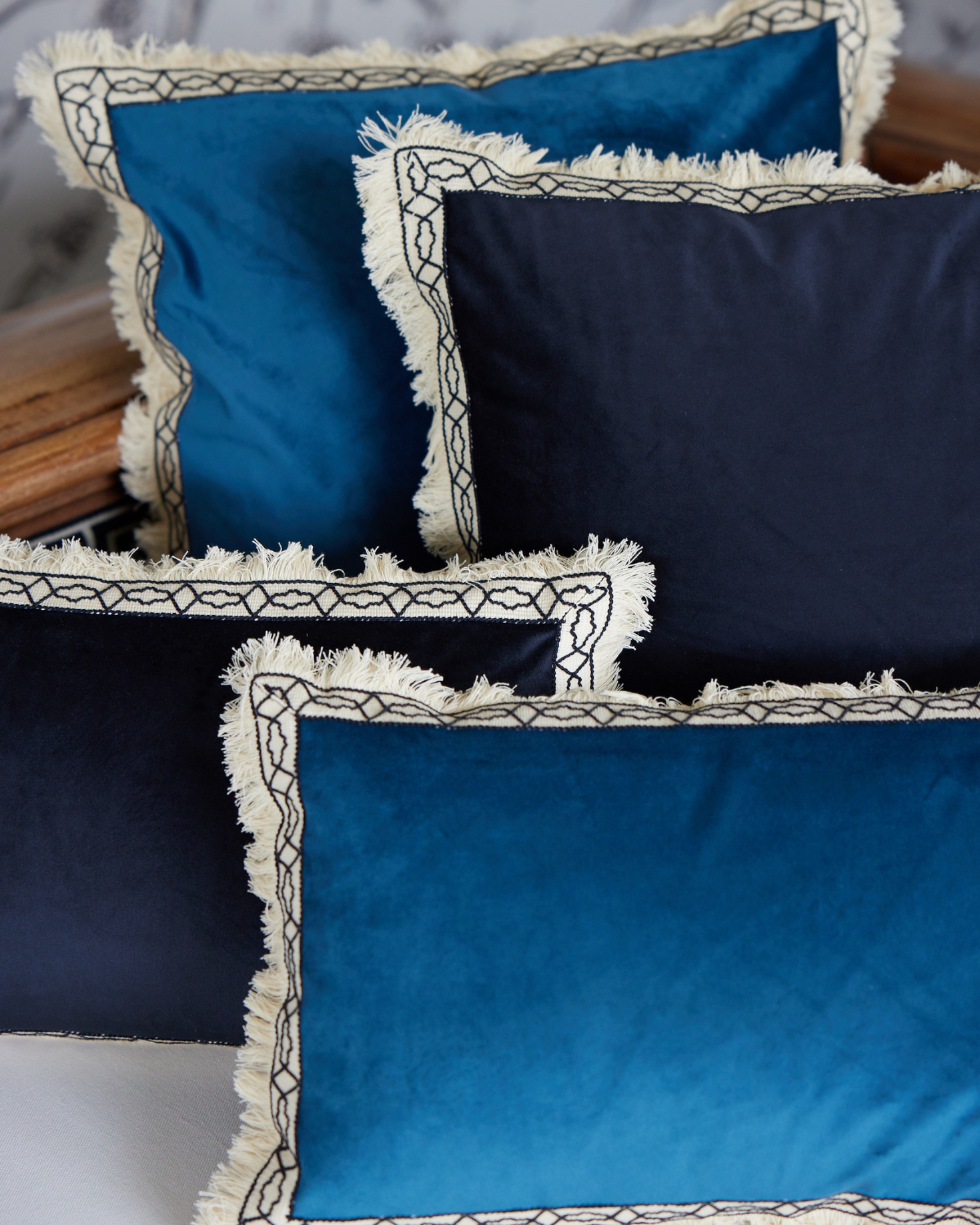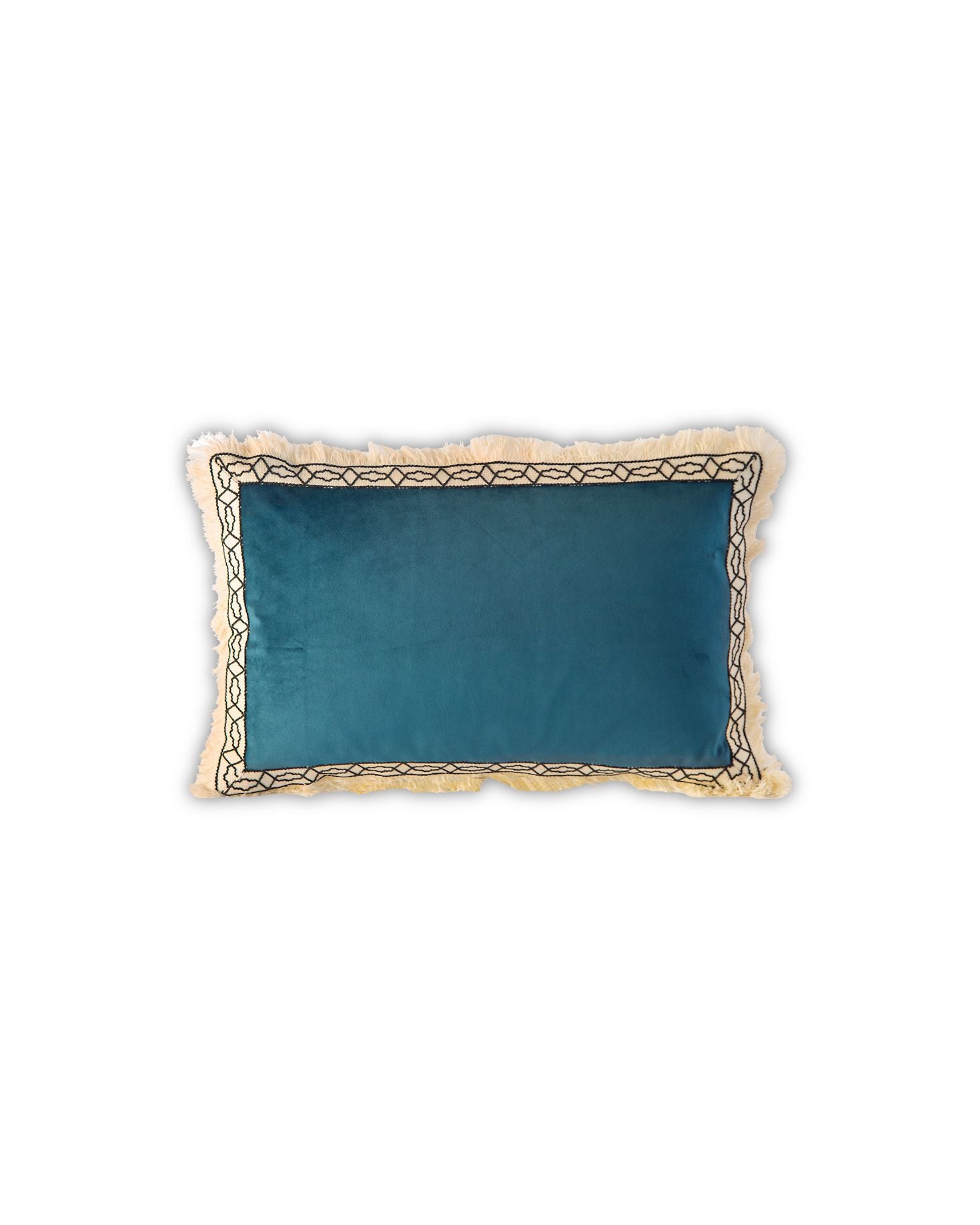 Cojín pequeño de terciopelo con greca exterior de flecos. Disponible en cuatro colores: burdeos, azul, verde y negro. No incluye relleno.