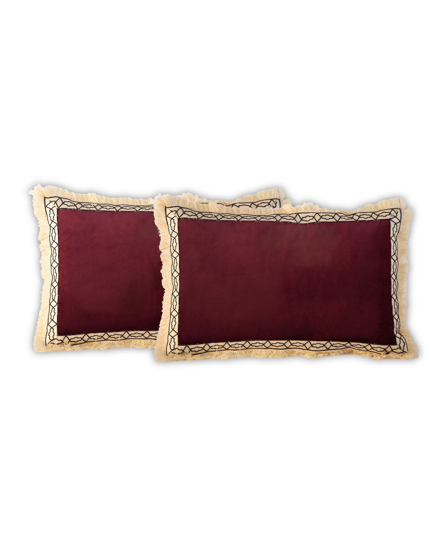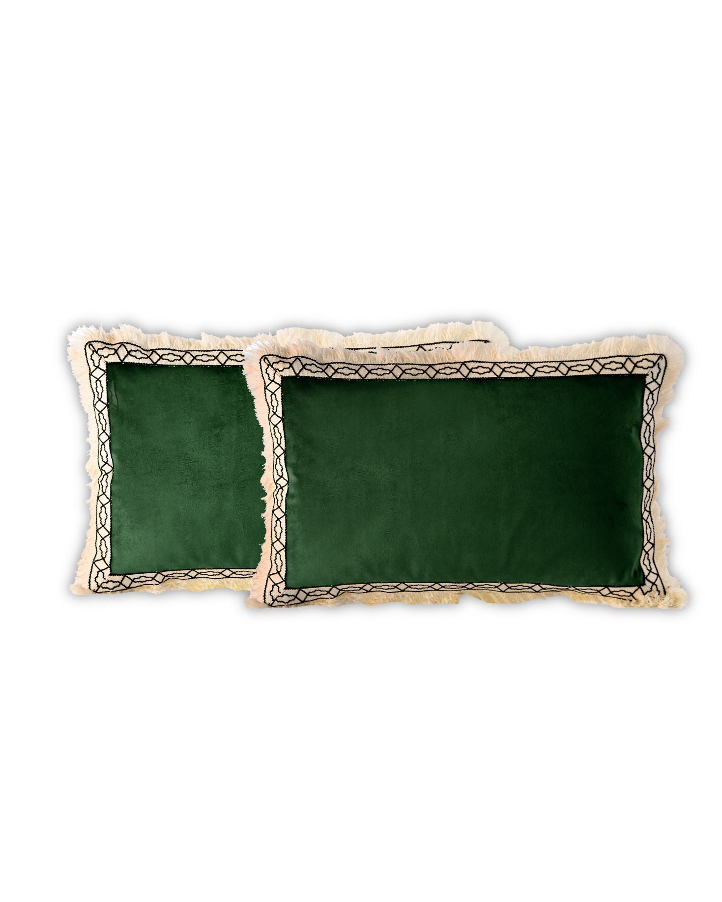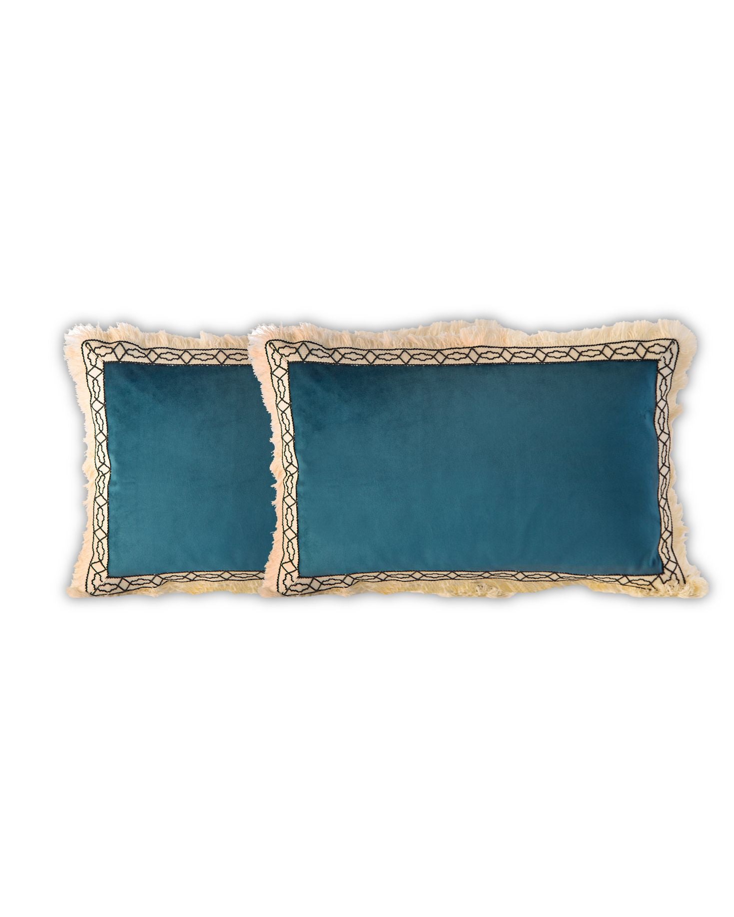 Cojín pequeño de terciopelo con greca exterior de flecos. Disponible en cuatro colores: burdeos, azul, verde y negro. No incluye relleno.