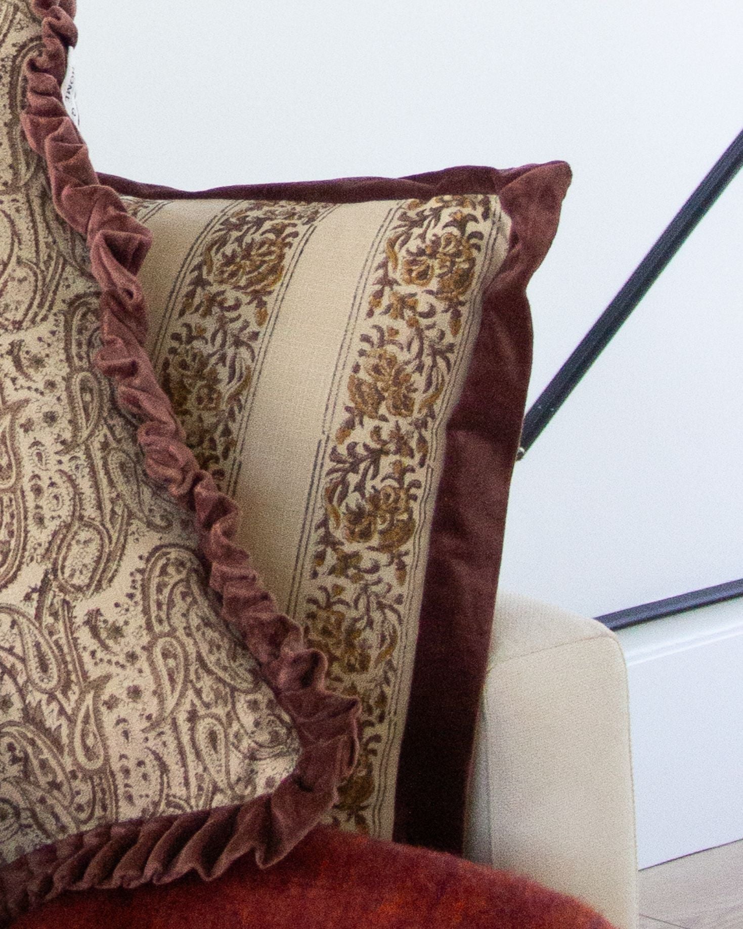 Cojín de algodón con estampado de rayas con detalles en tonos burdeos y beige con detalle de terciopelo en color vino. Este producto incluye el relleno.