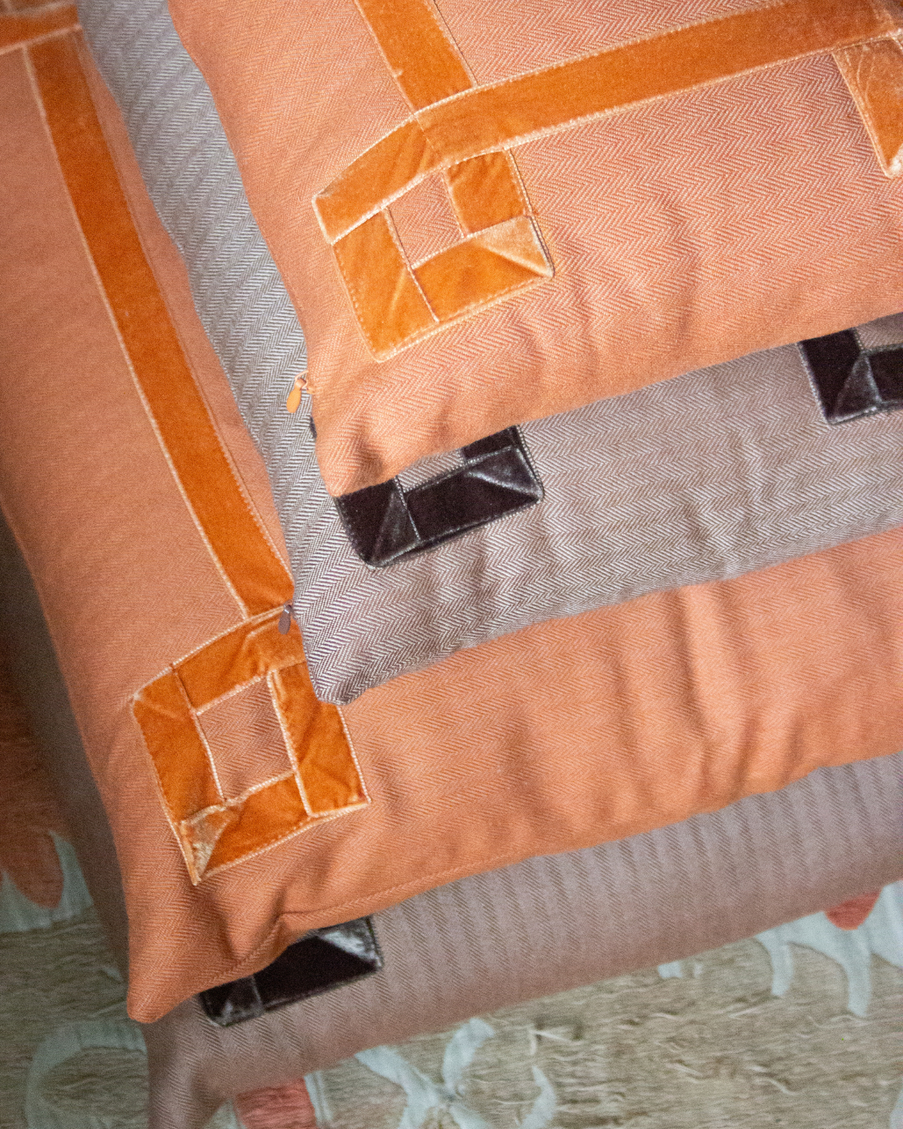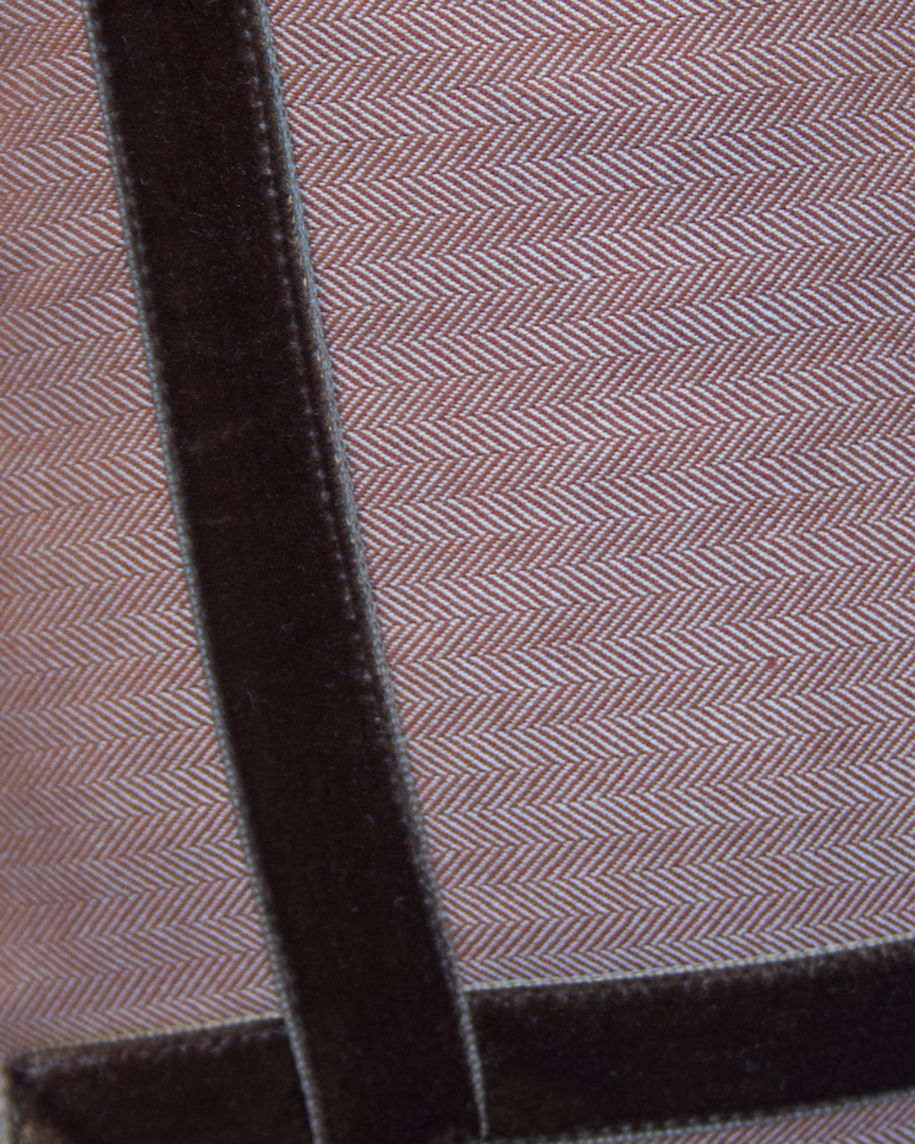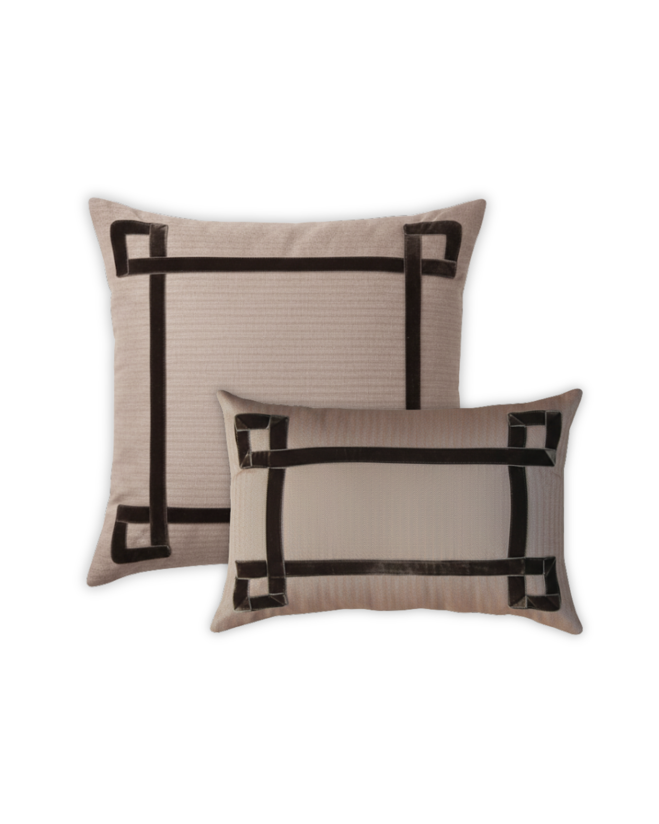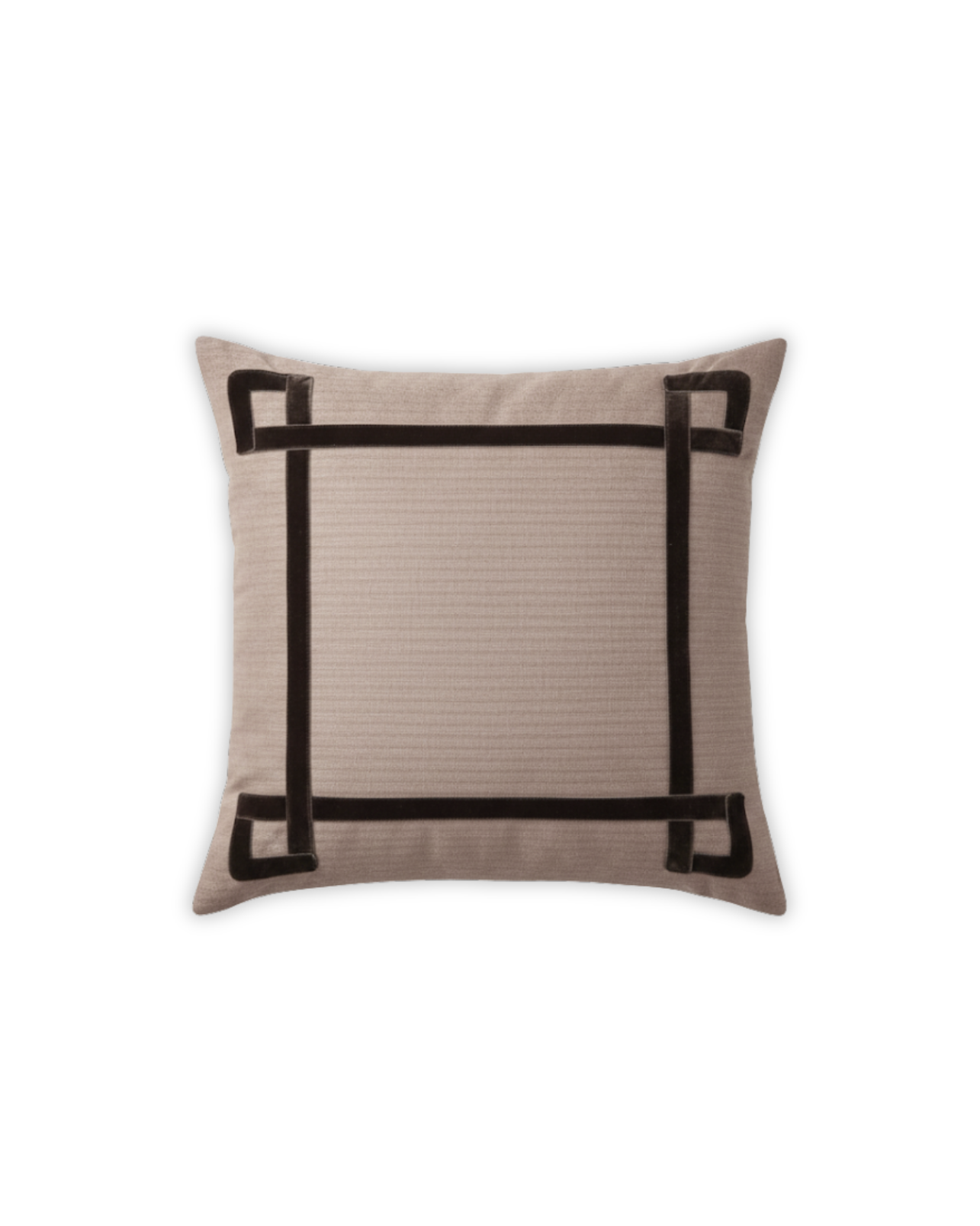Funda de cojín grande fabricado en tejido de espiga marrón y blanco con detalle de cenefa decorativa en terciopelo de color marrón. Disponible también en negro, azul y naranja.
