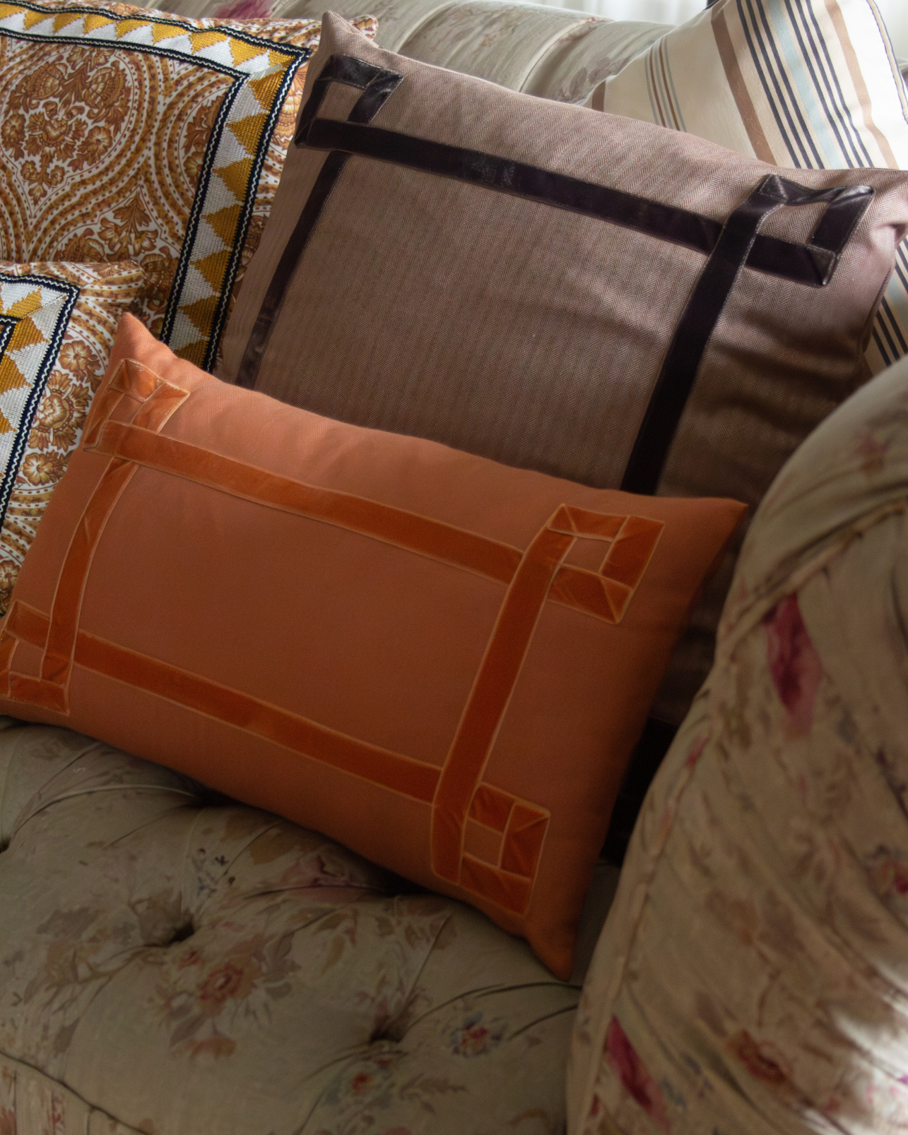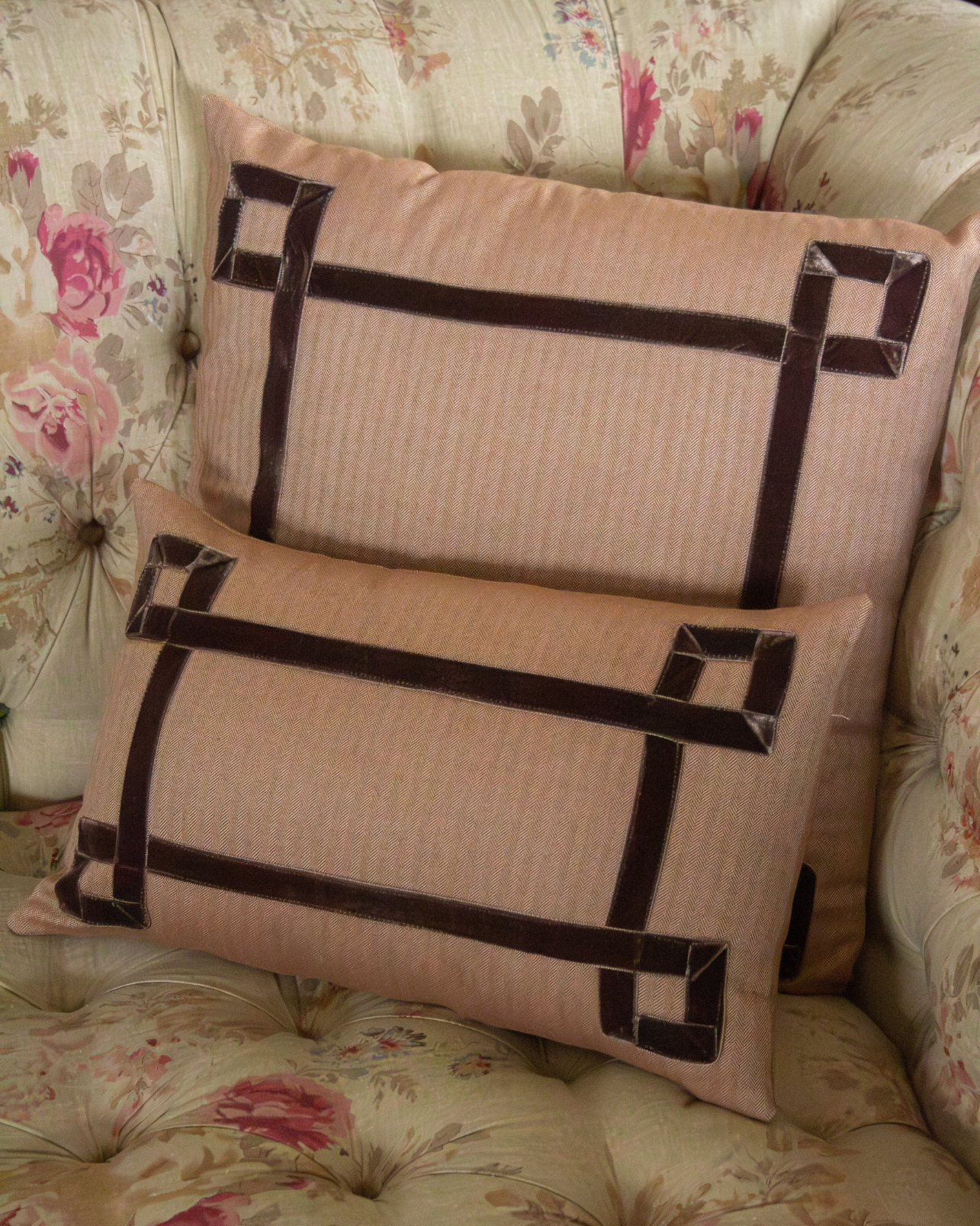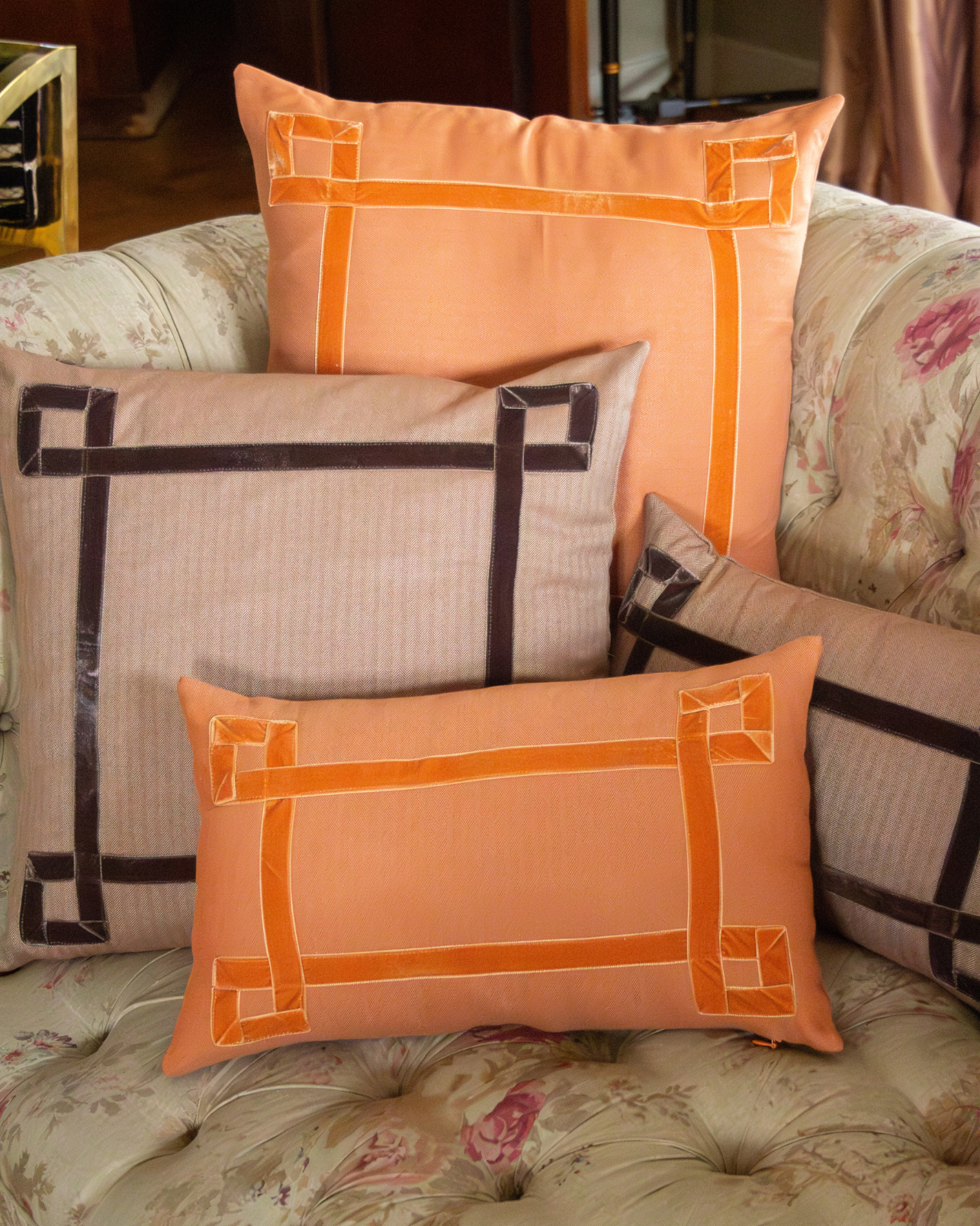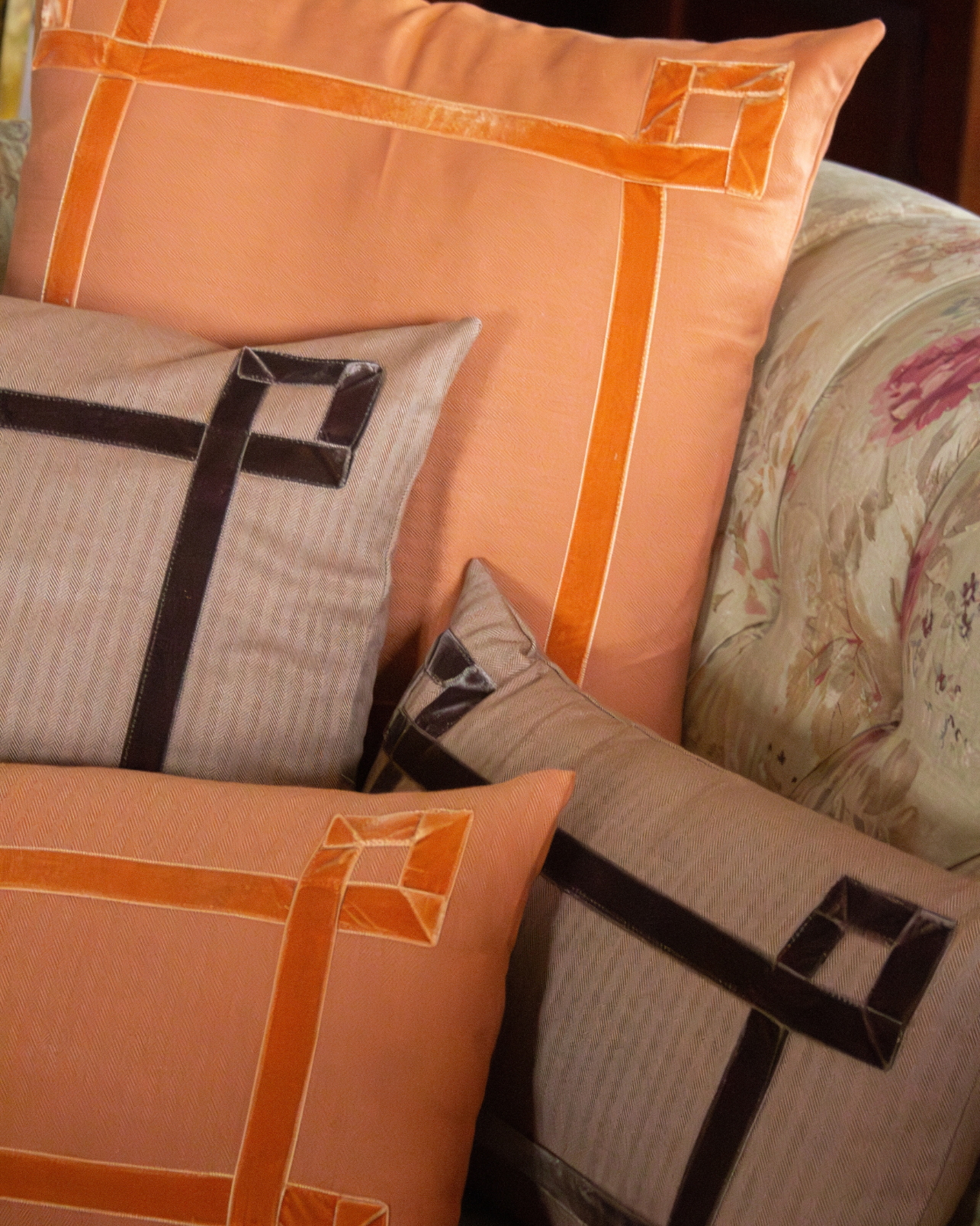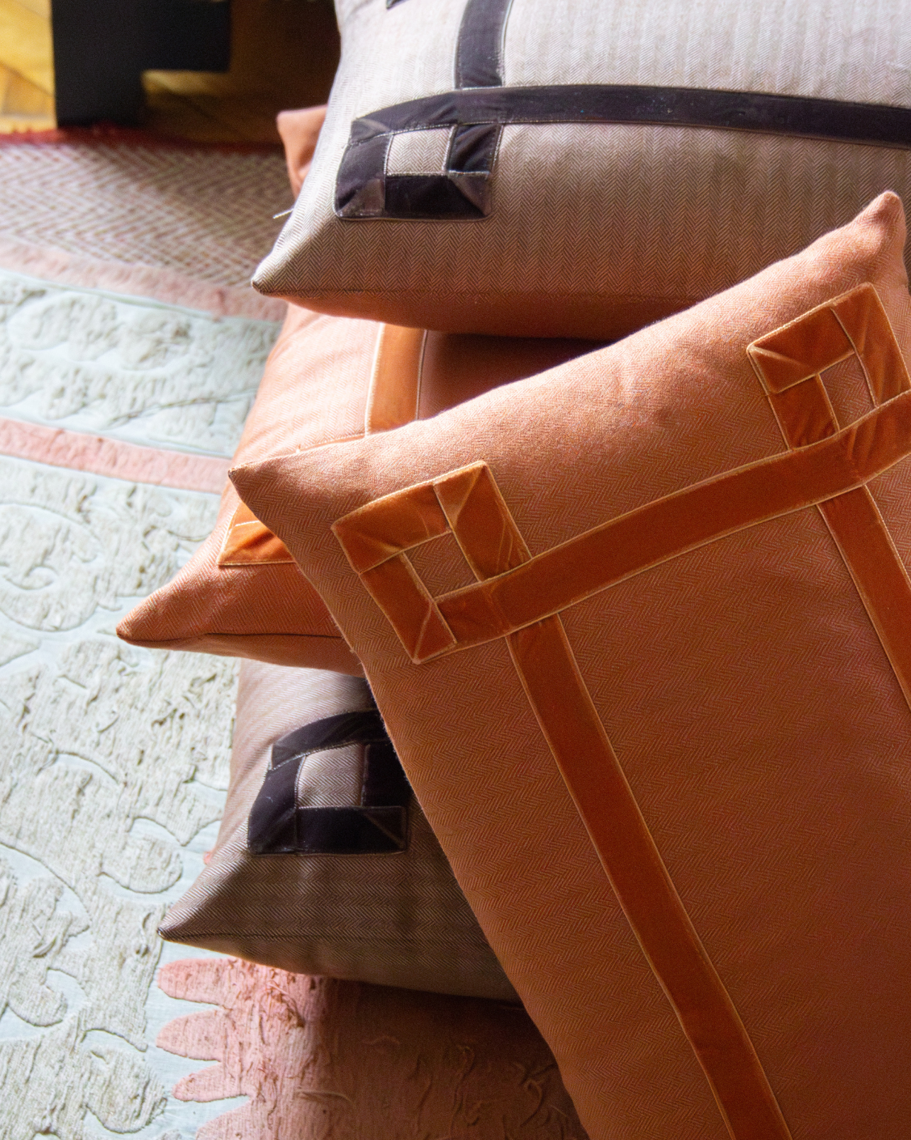 Funda de cojín grande fabricado en tejido de espiga marrón y blanco con detalle de cenefa decorativa en terciopelo de color marrón. Disponible también en negro, azul y naranja.