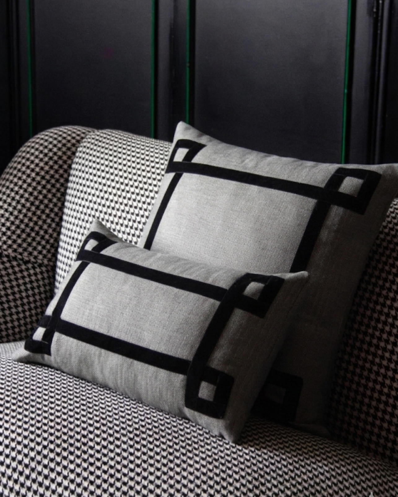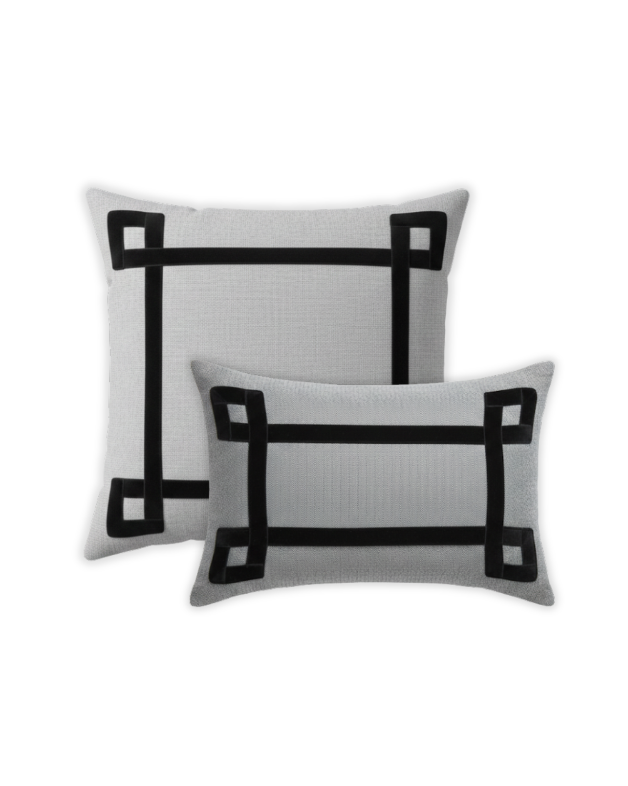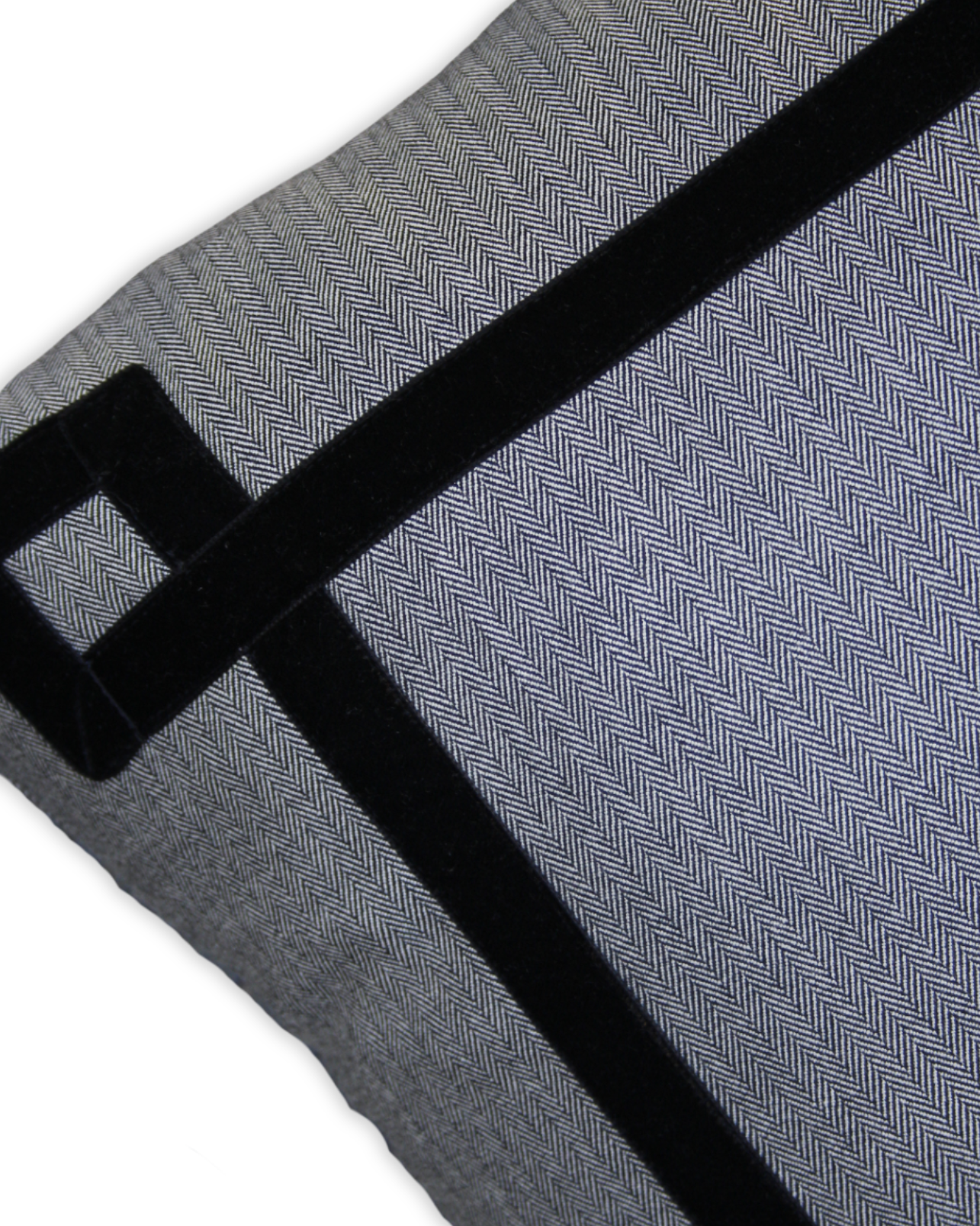Funda de cojín grande fabricado en tejido de espiga negro y blanco con detalle de cenefa decorativa en terciopelo de color negro. Disponible también en marrón, azul y naranja.