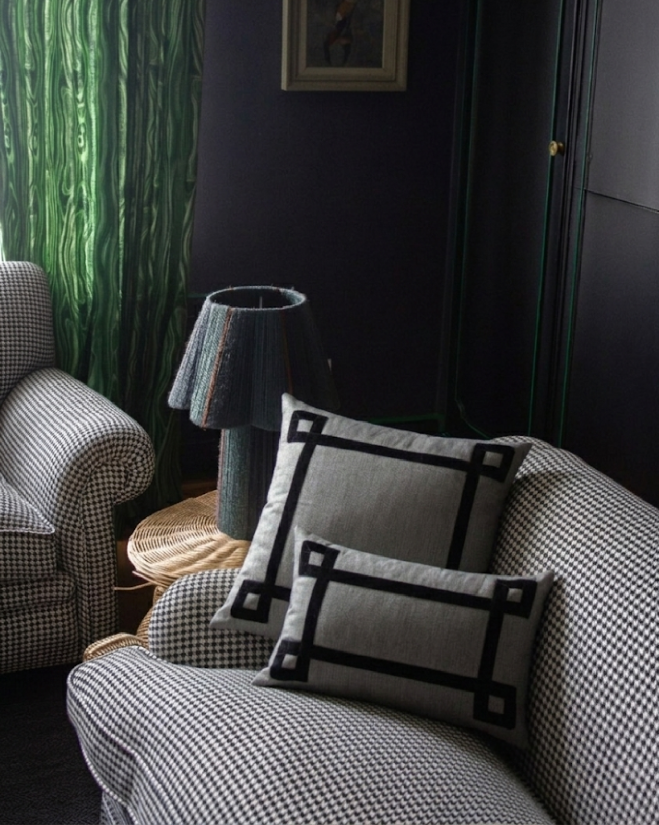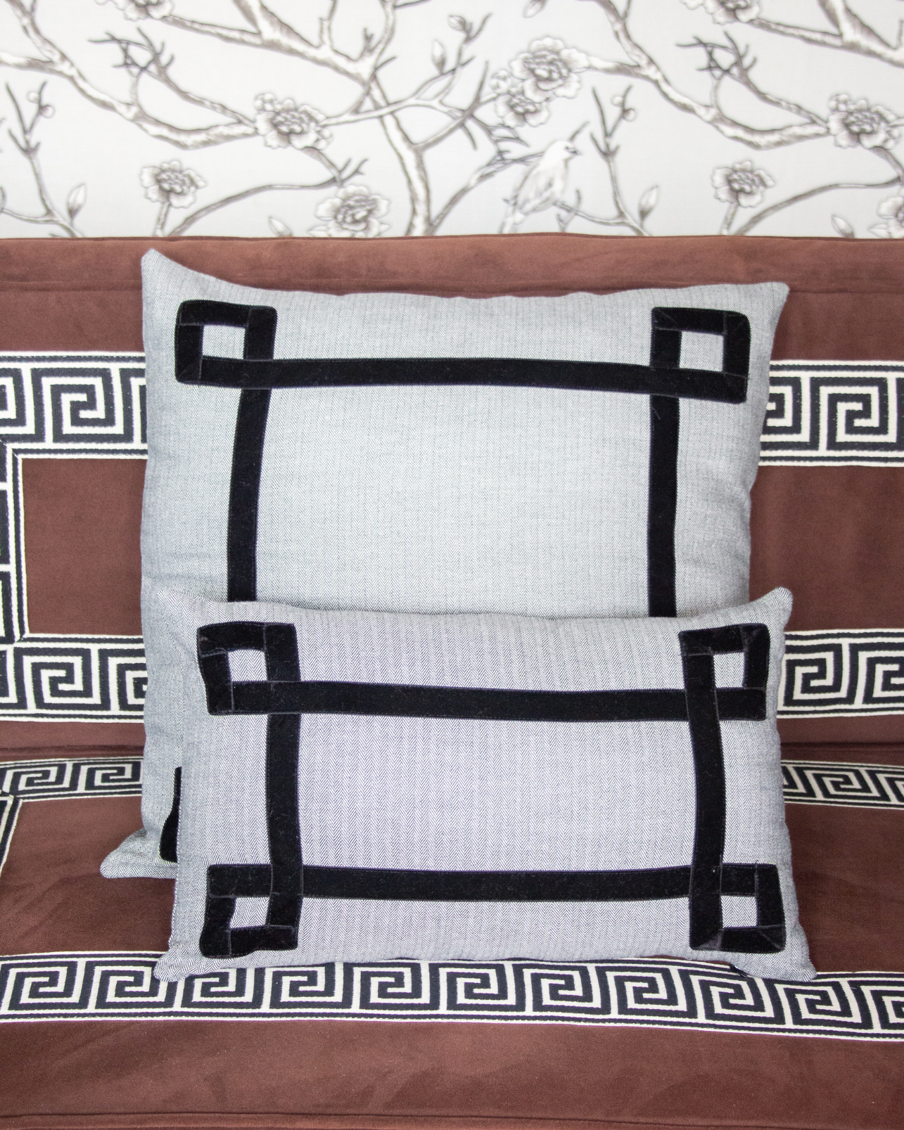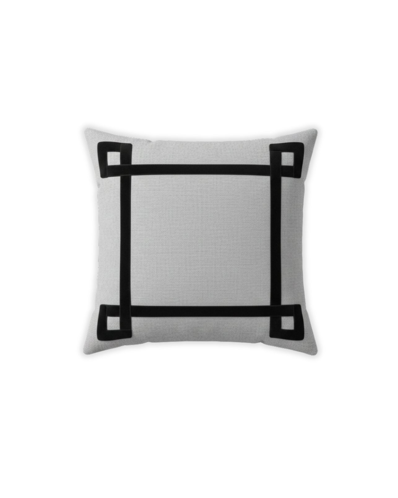 Funda de cojín grande fabricado en tejido de espiga negro y blanco con detalle de cenefa decorativa en terciopelo de color negro. Disponible también en marrón, azul y naranja.