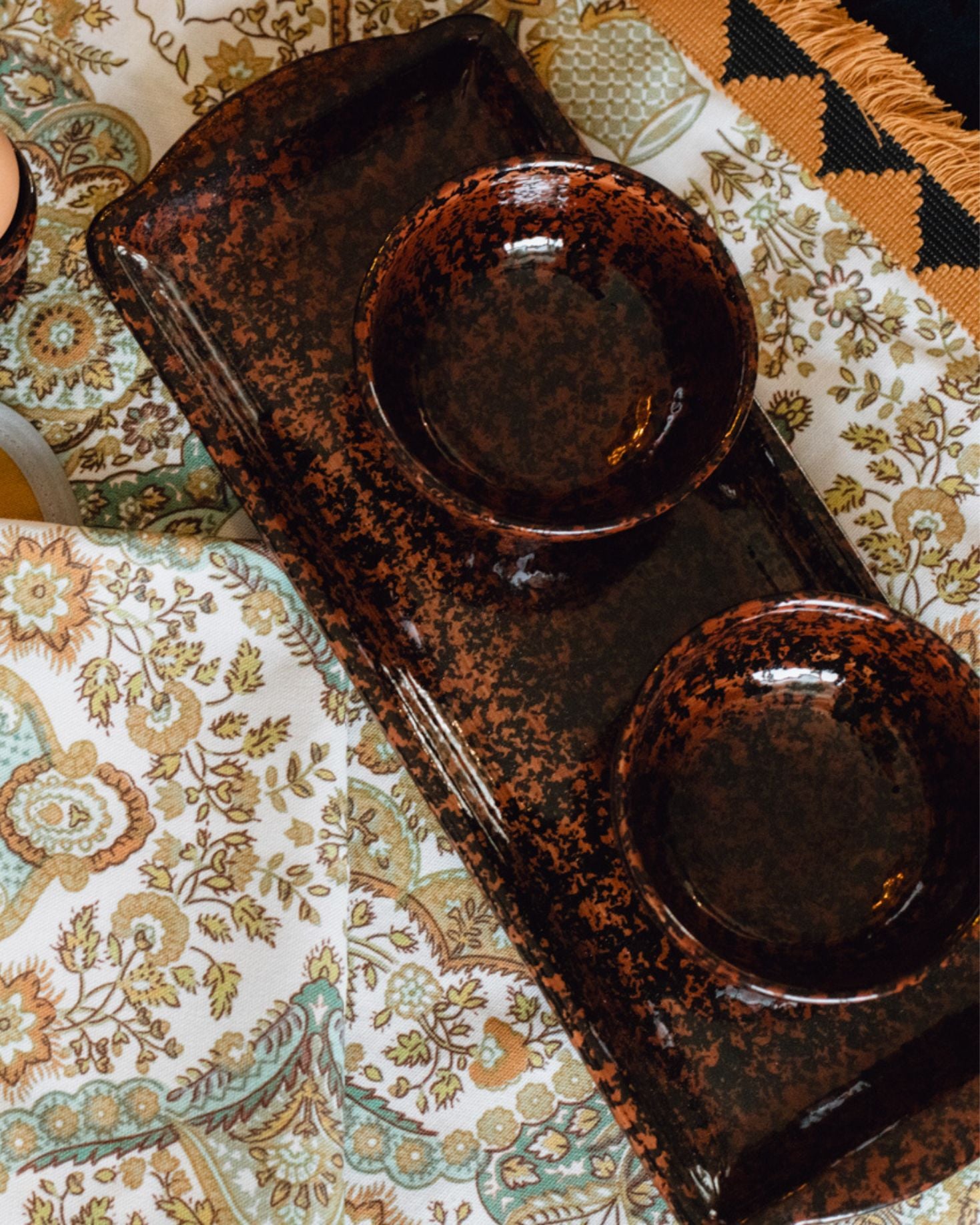 Bandeja rectangular de mármol en color marrón y negro, fabricada en cerámica artesanal y pintada a mano en España.