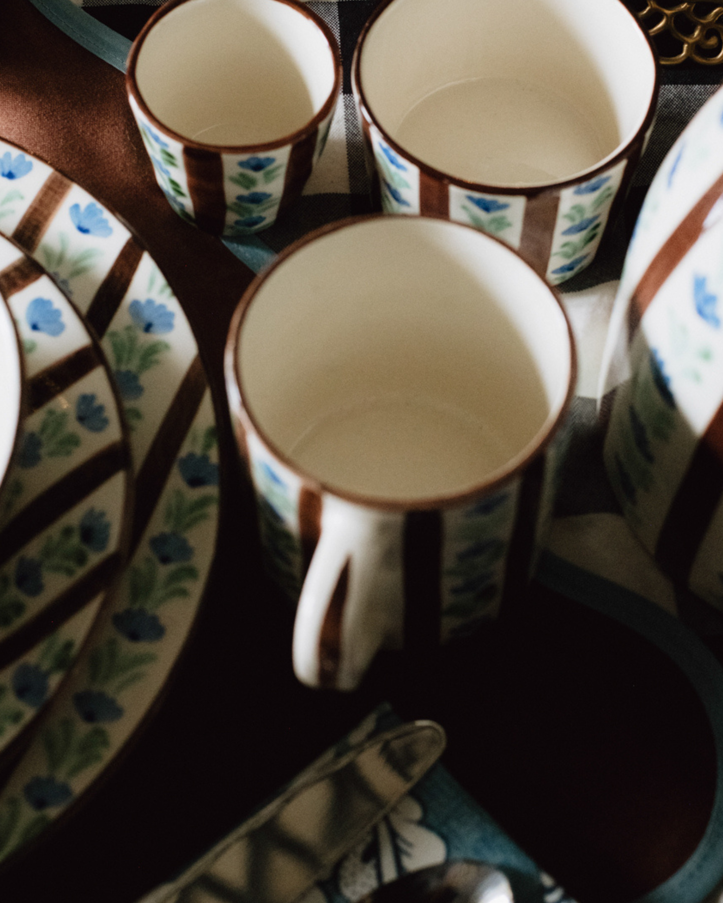 Taza de cerámica azul, marrón y blanca, pintada a mano. Colección Córdoba.
