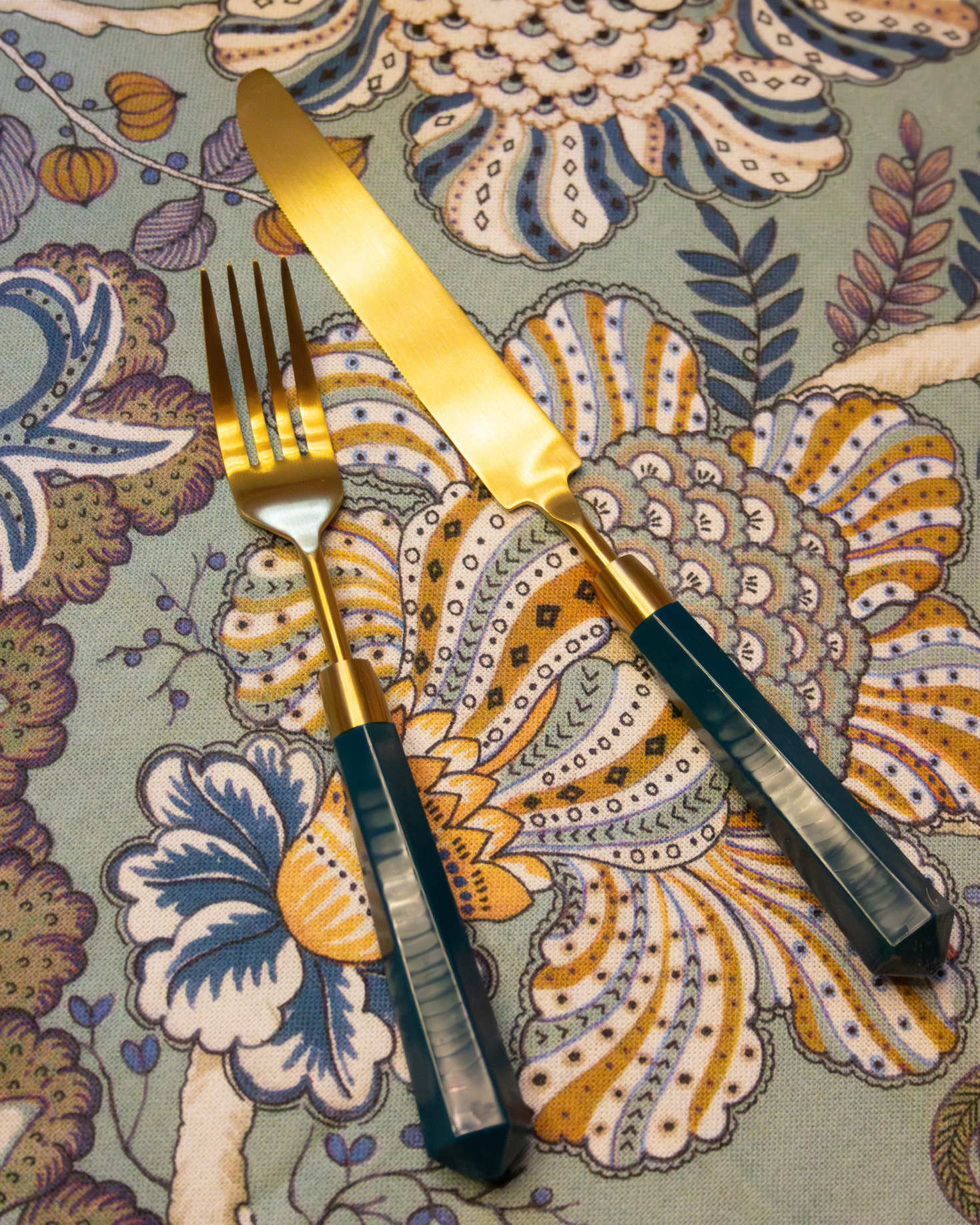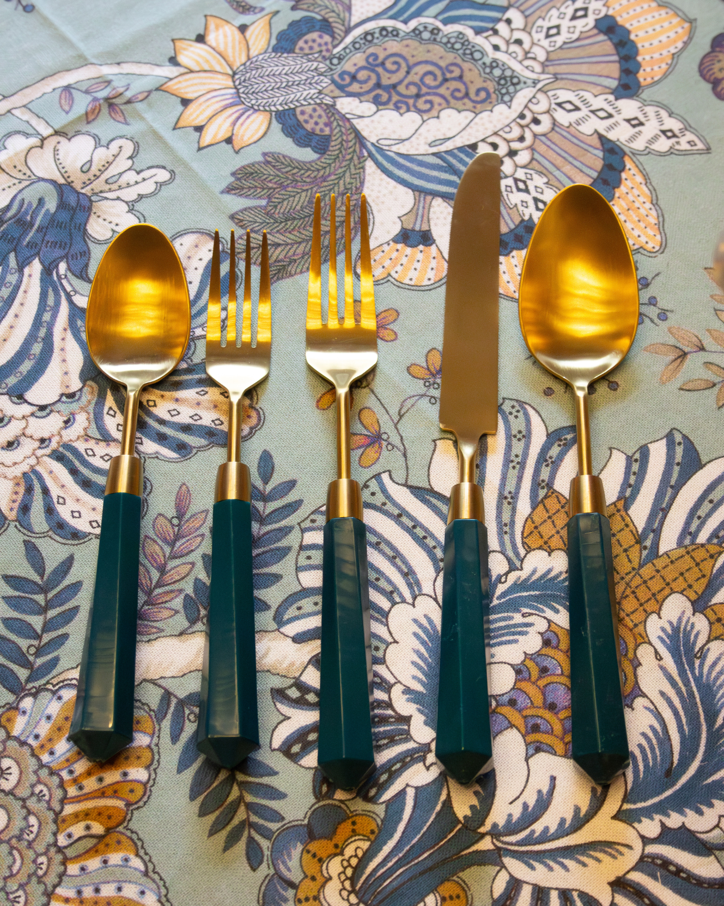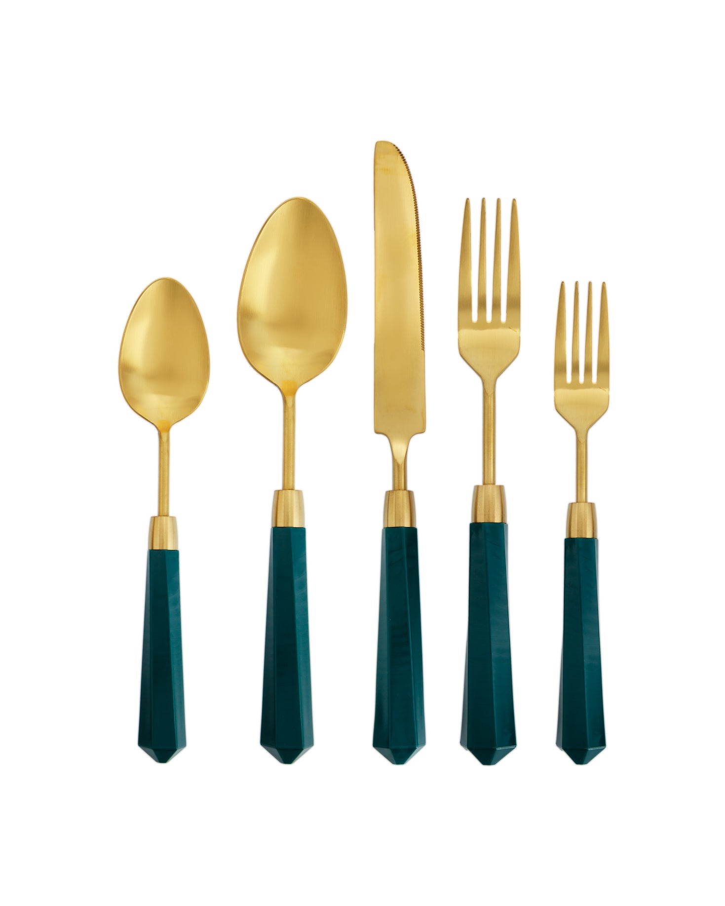 Cubiertos de acero inoxidable con mango verde. Las piezas se venden en cajas de 5 unidades.