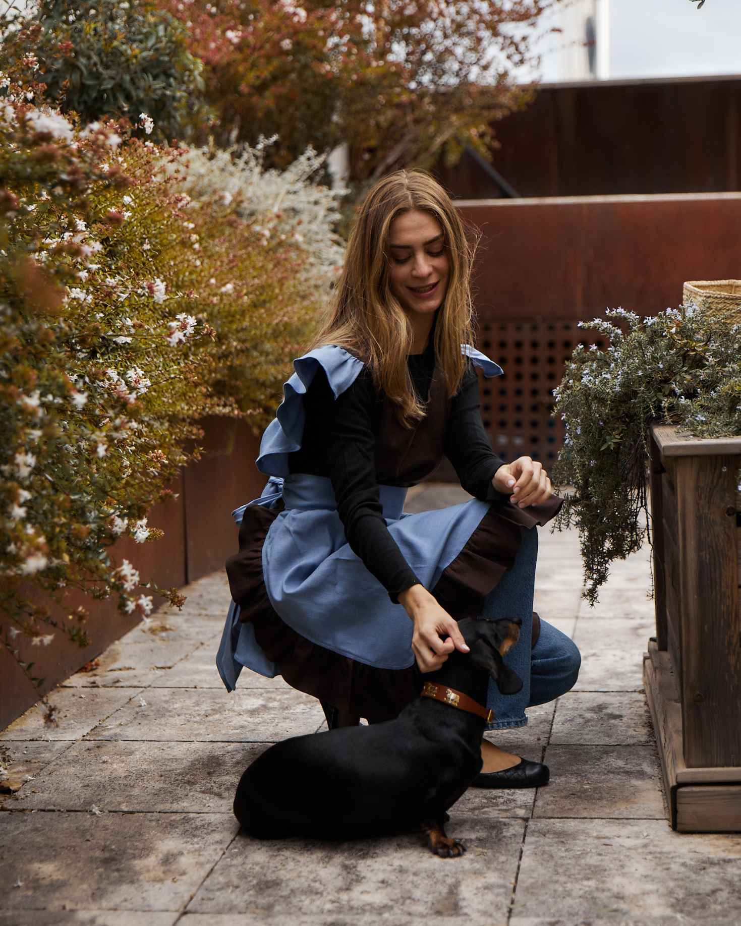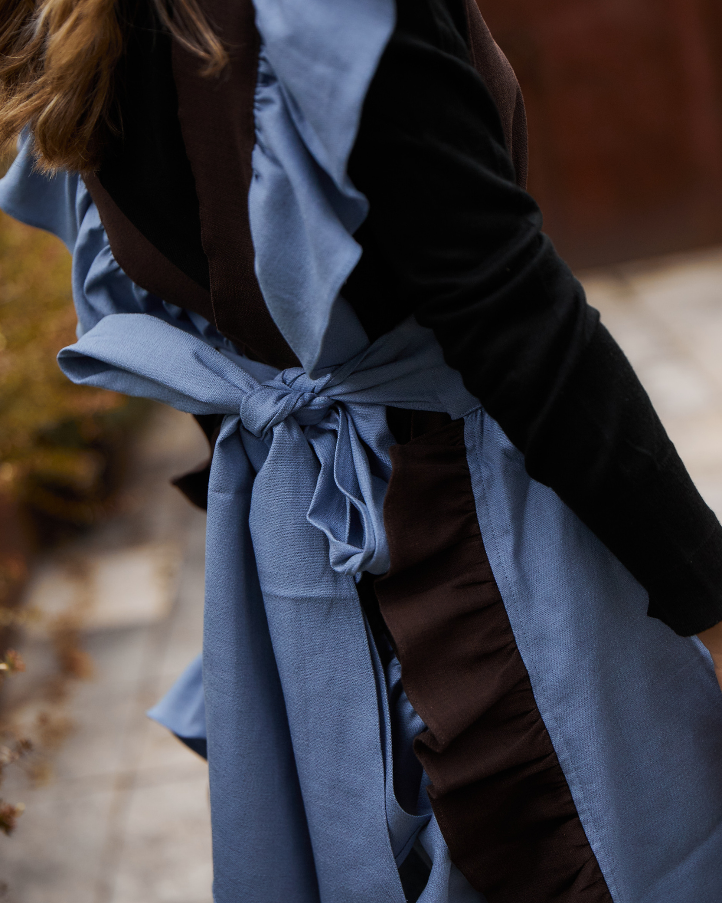 Delantal falda de hilo azul con volantes marrones. Cierre con lazada en la espalda.