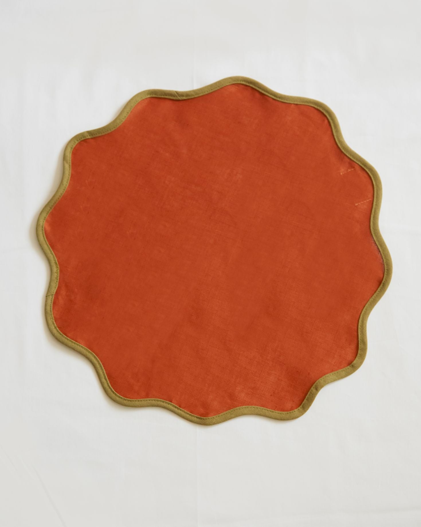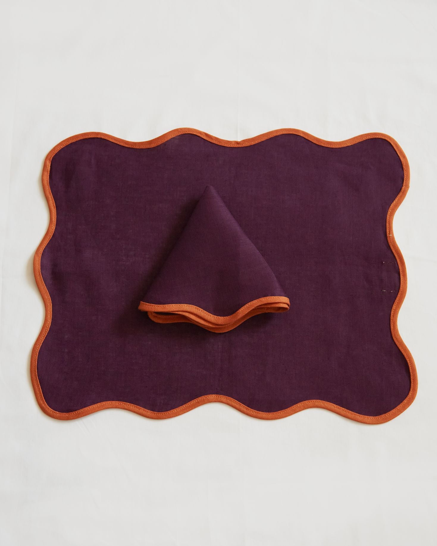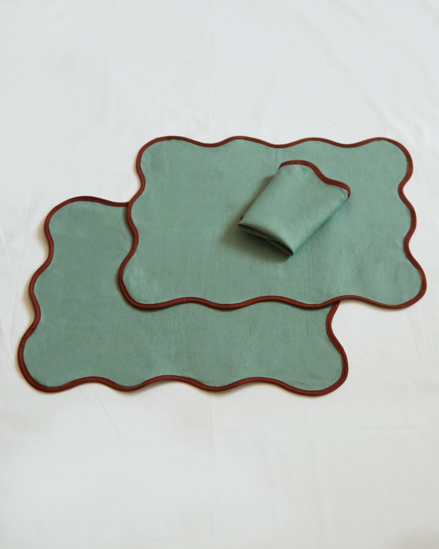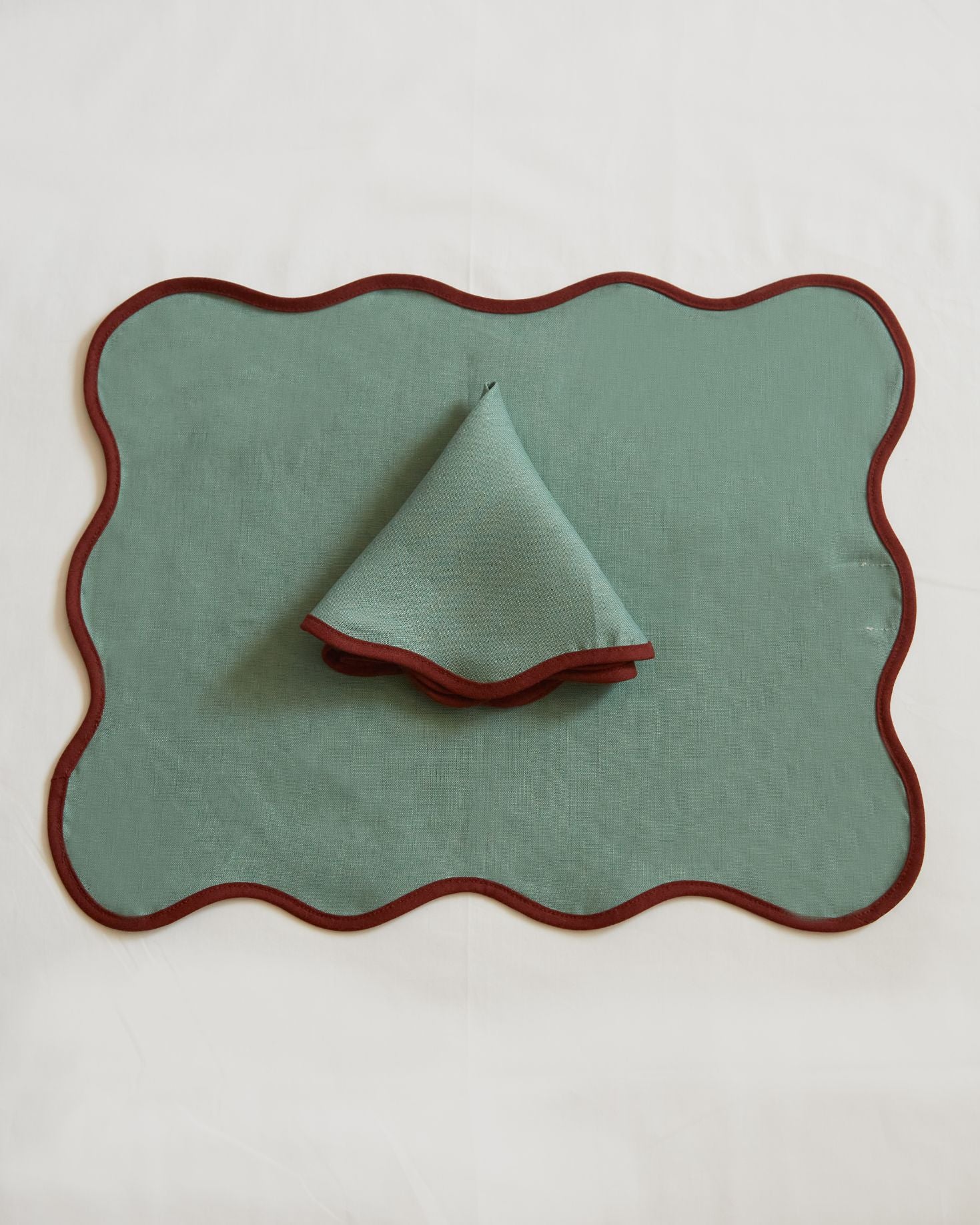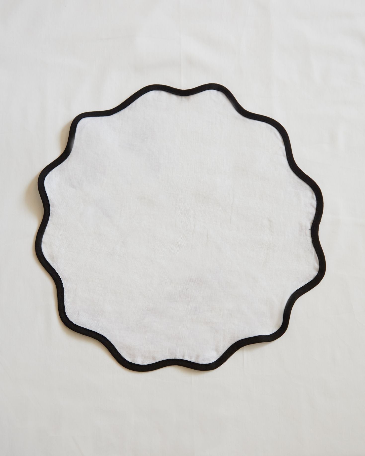 Set individual rectangular y servilleta redonda ondulada con ribete festoneado, disponibles en una amplia variedad de colores.
