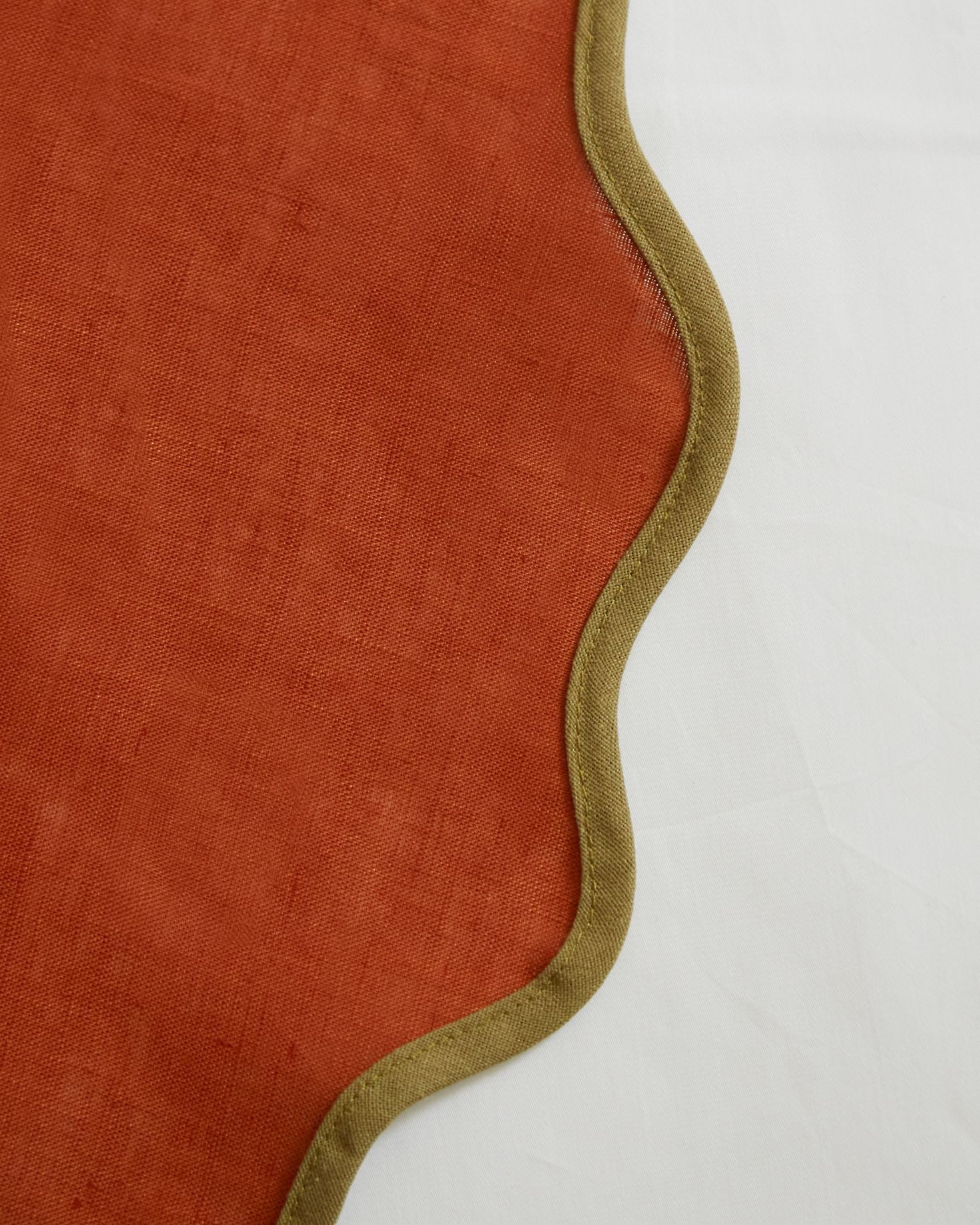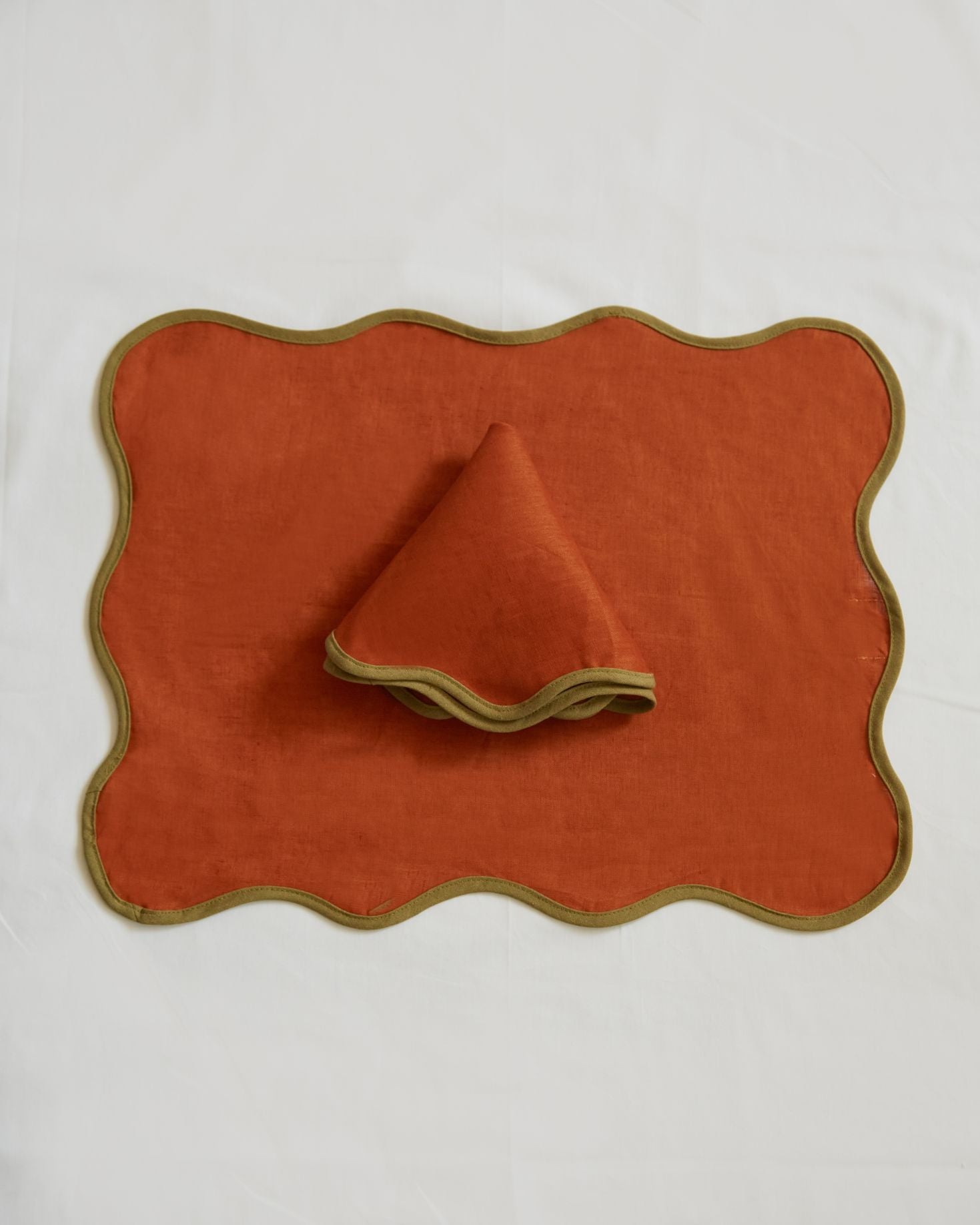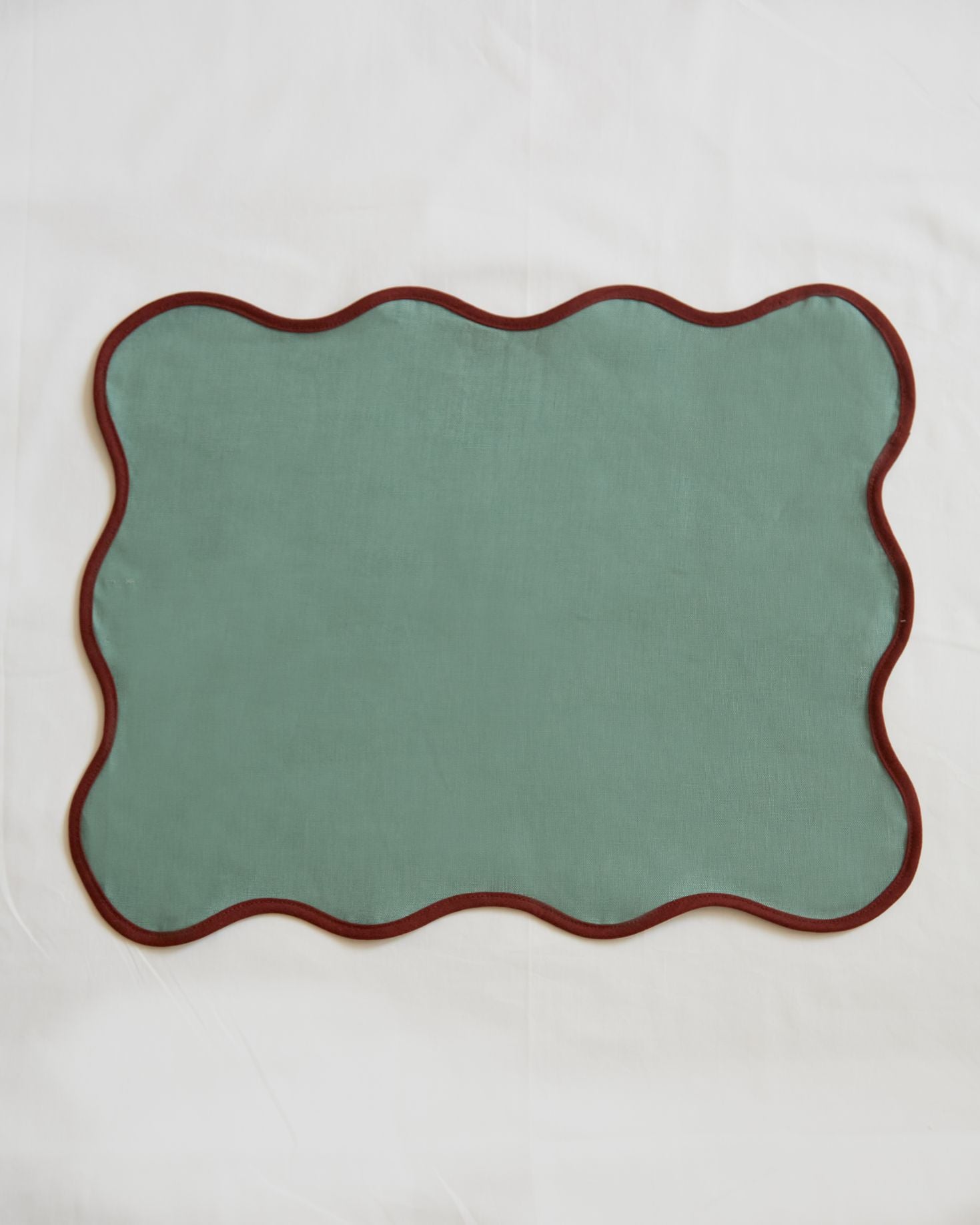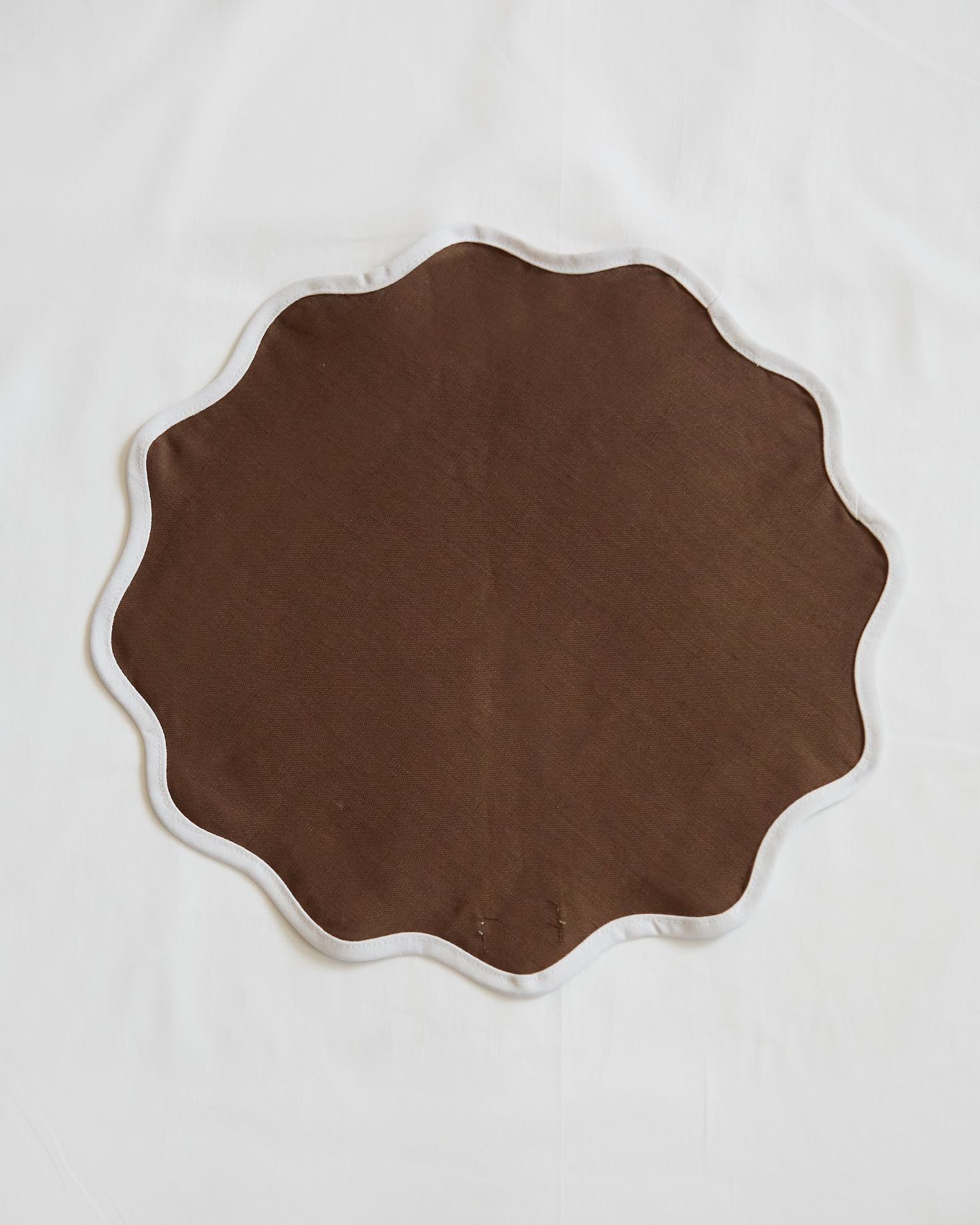 Set individual rectangular y servilleta redonda ondulada con ribete festoneado, disponibles en una amplia variedad de colores.