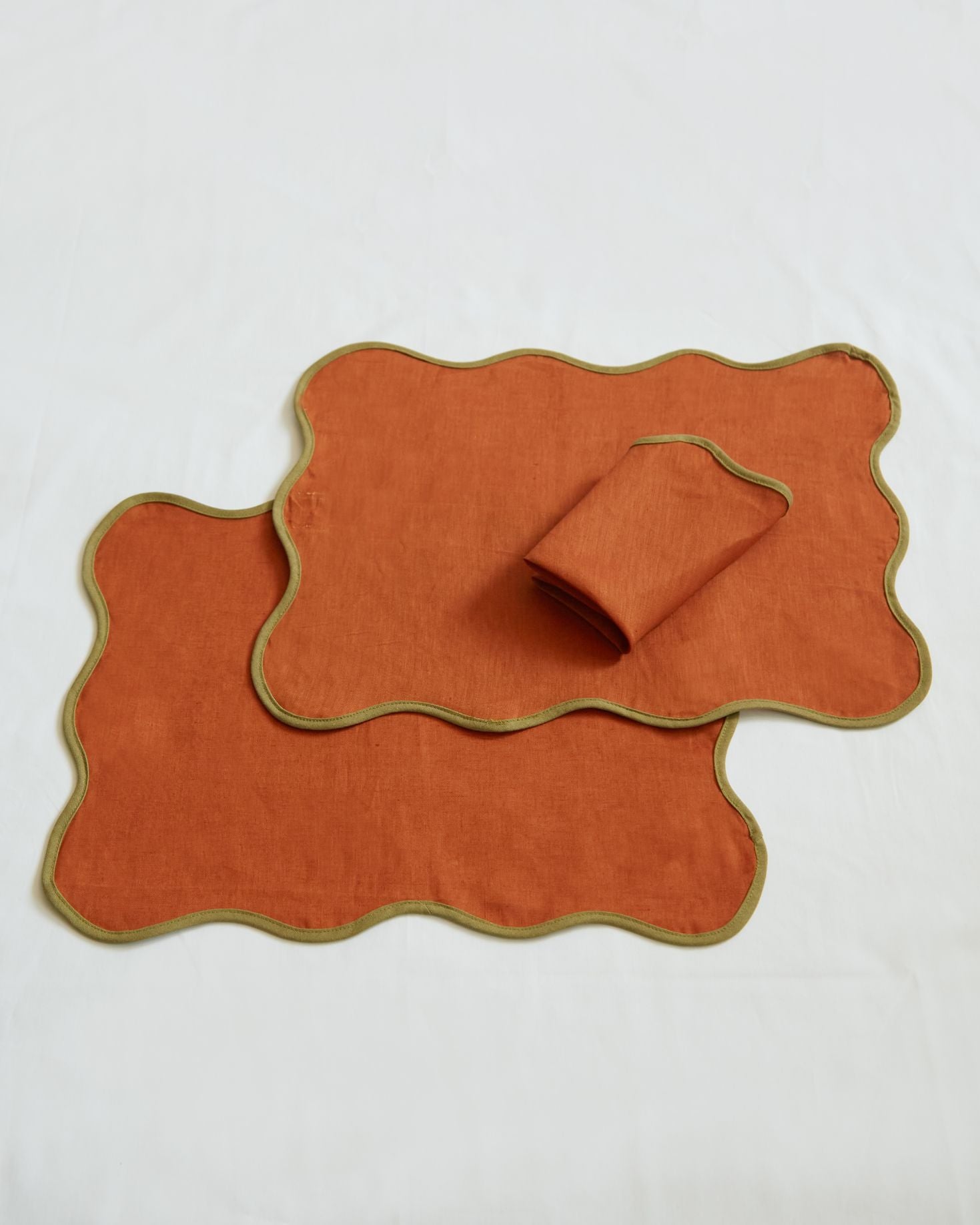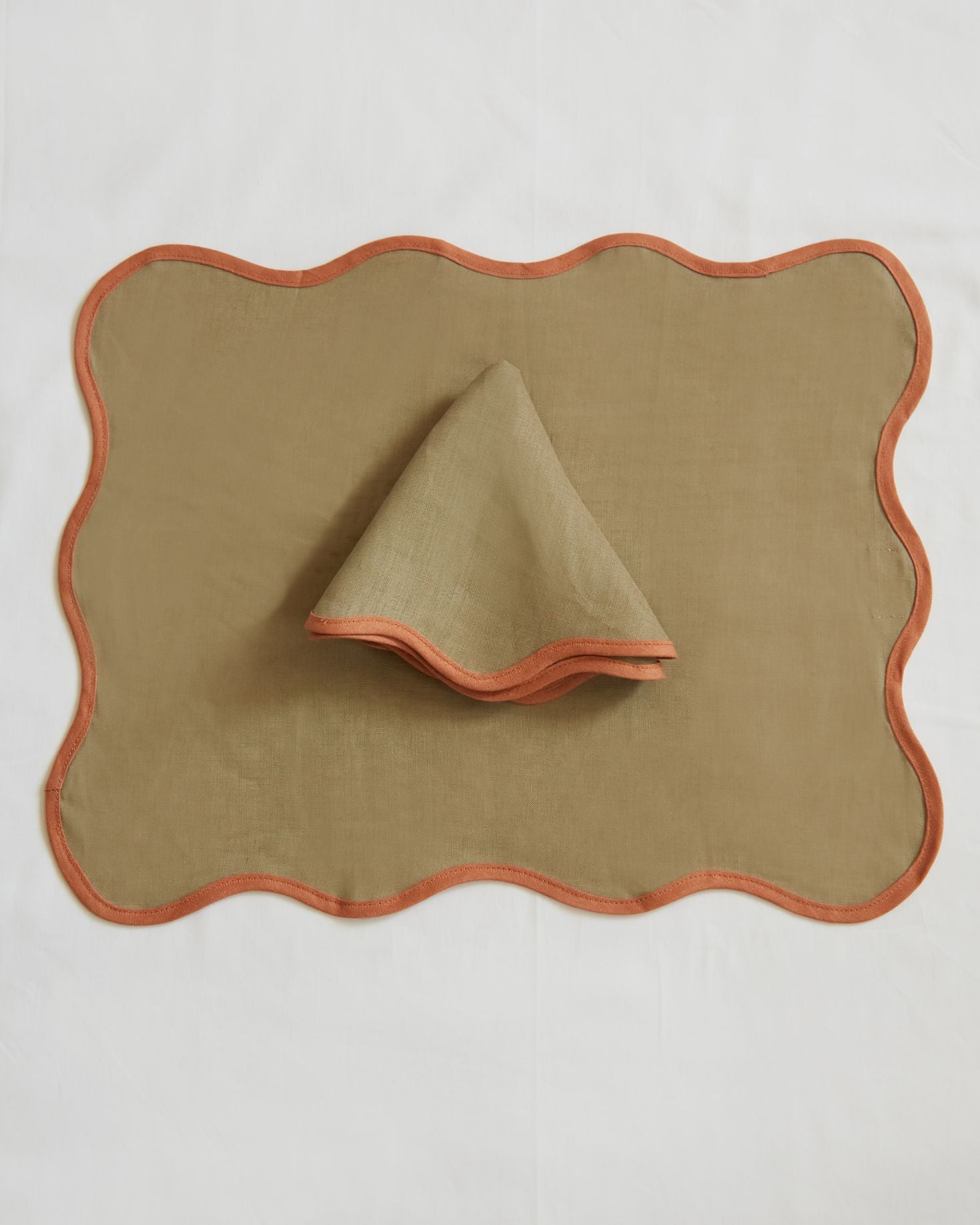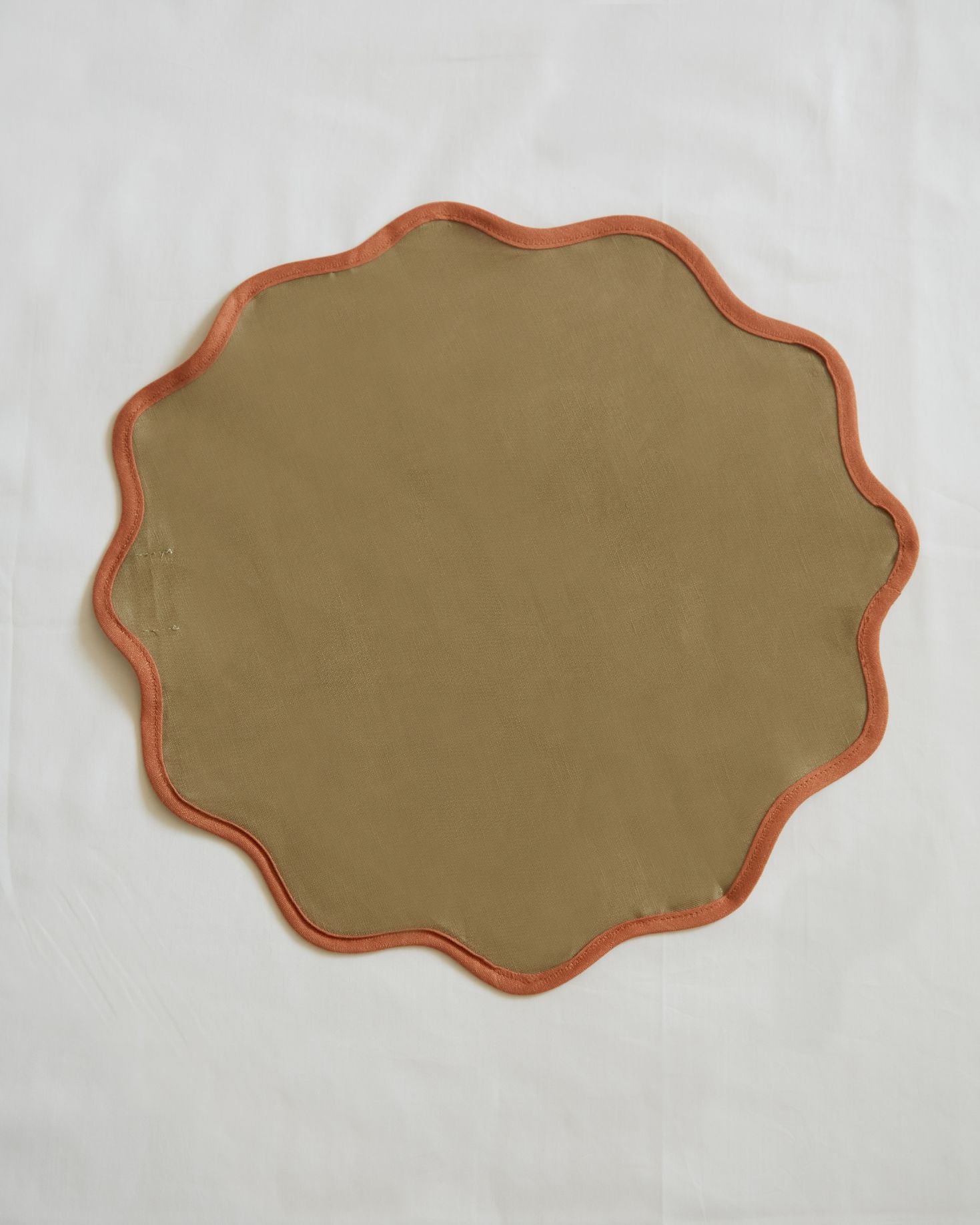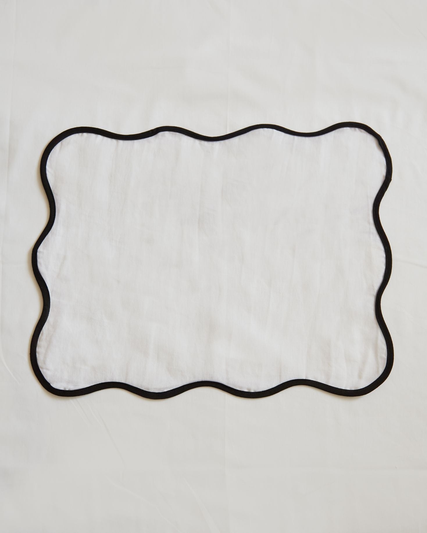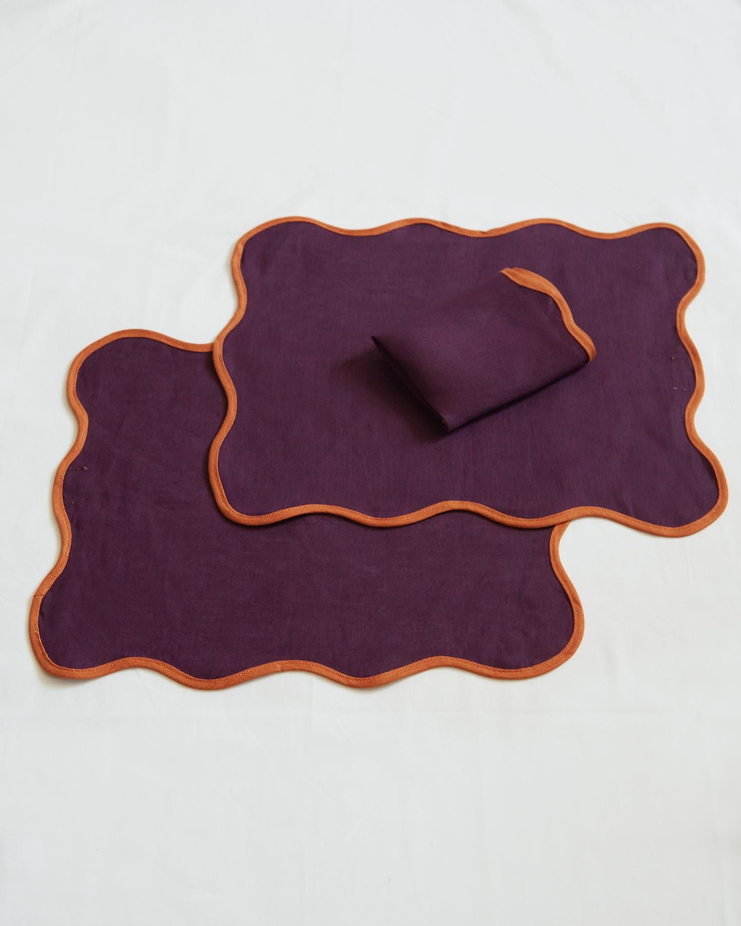 Set individual rectangular y servilleta redonda ondulada con ribete festoneado, disponibles en una amplia variedad de colores.