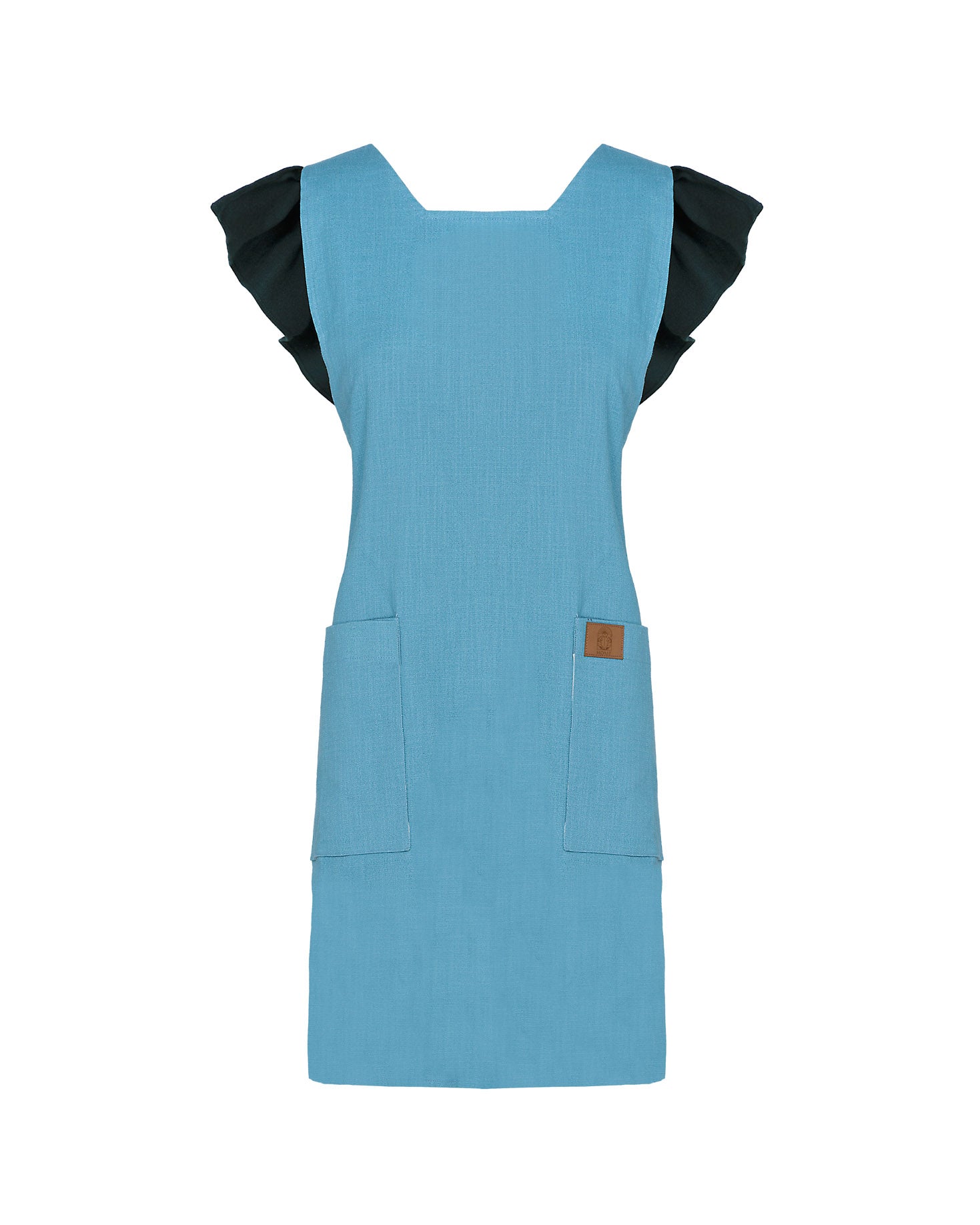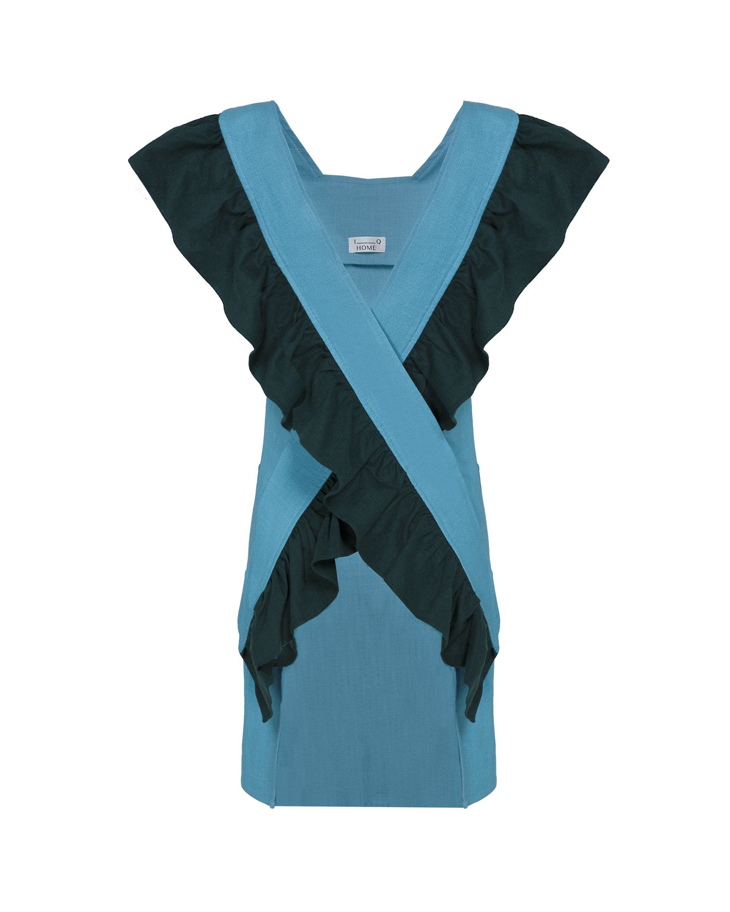 Mandil con espalda cruzada y bolsillos delanteros. Detalle de volantes en tirantes. En color azul con volante verde, fabricado en algodón 100%.