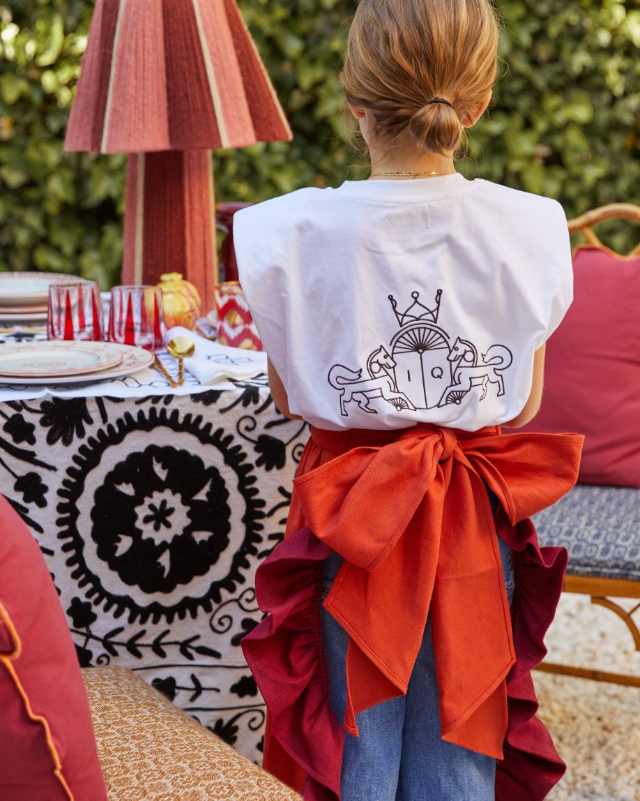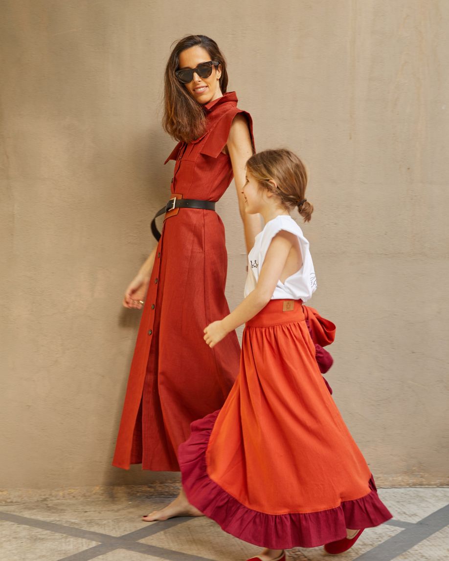 Delantal naranja con volantes en color burdeos y cintura anudada con lazada en la espalda.