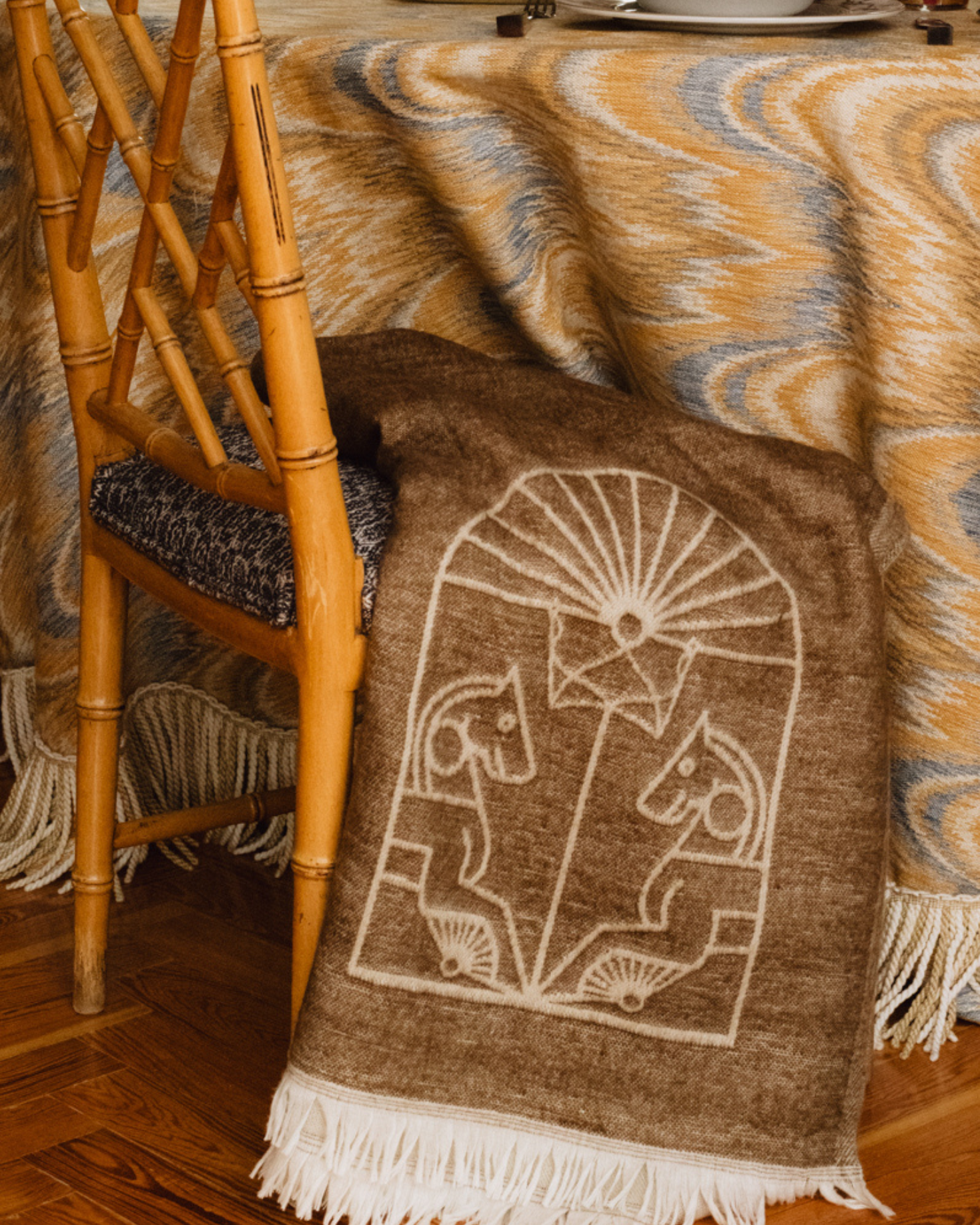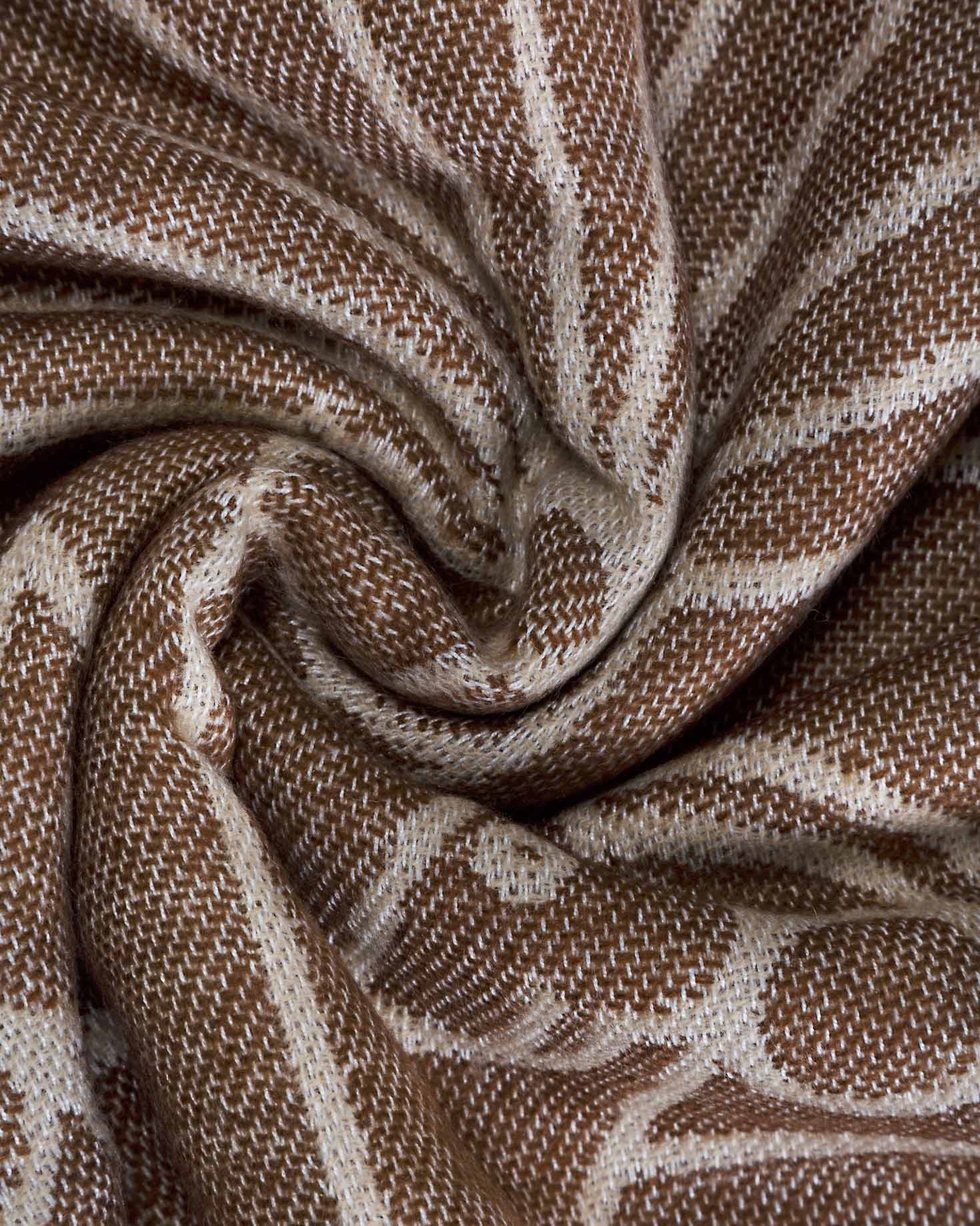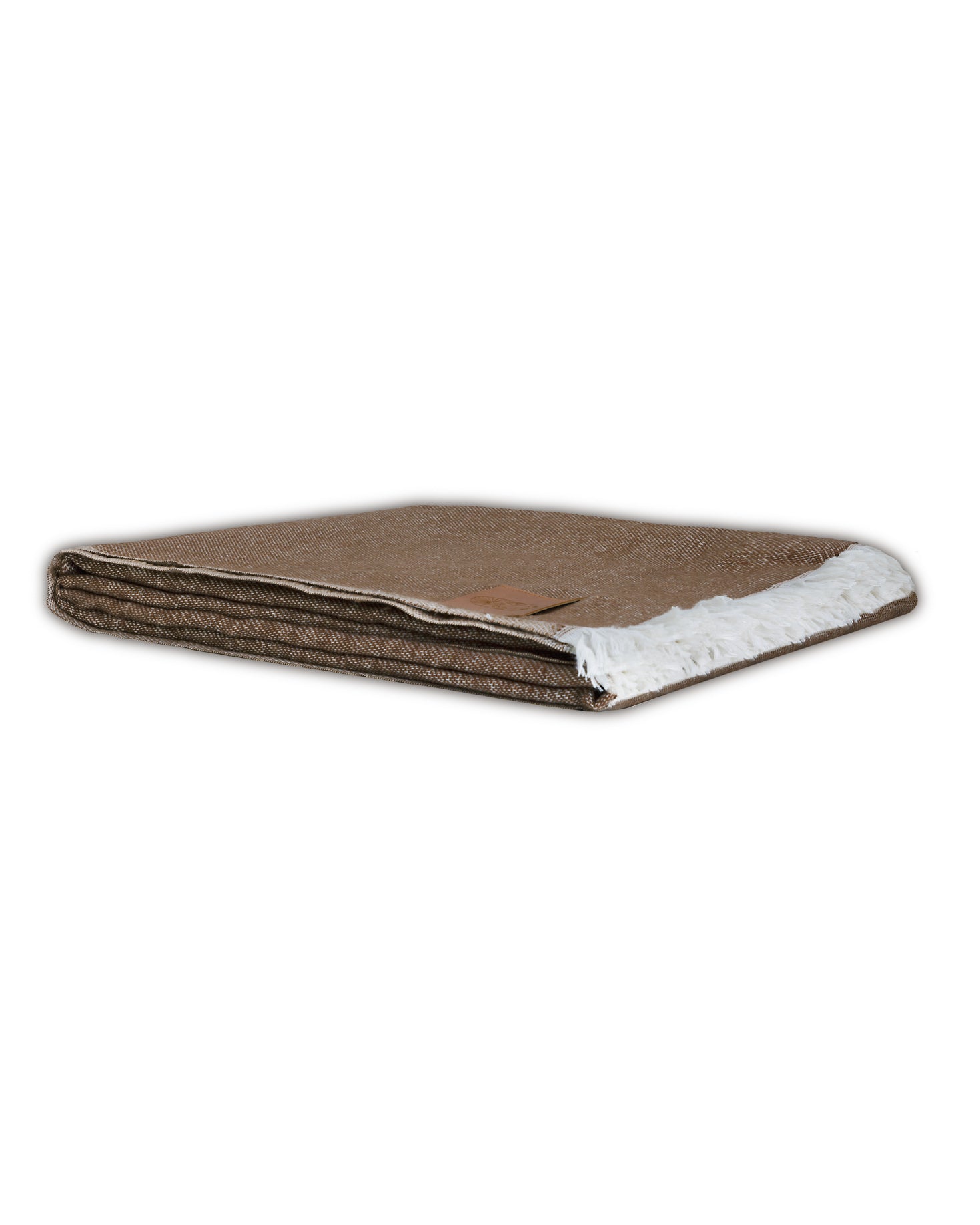 Manta en color marrón con logo de IQ Home en beige y flecos blancos.