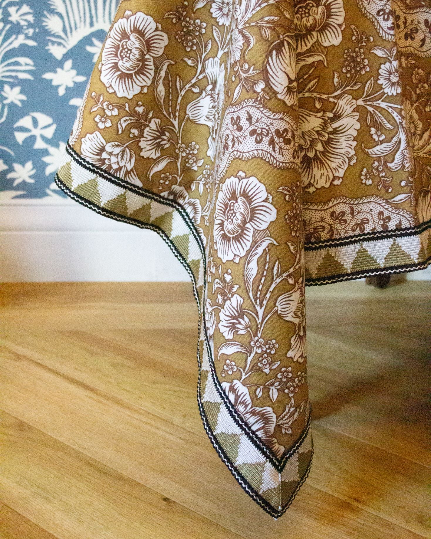 Mantel cuadrado de algodón con estampado floral diseñado en exclusiva para IQ Home. Detalle de cenefa. Disponible en colores azul y marrón.