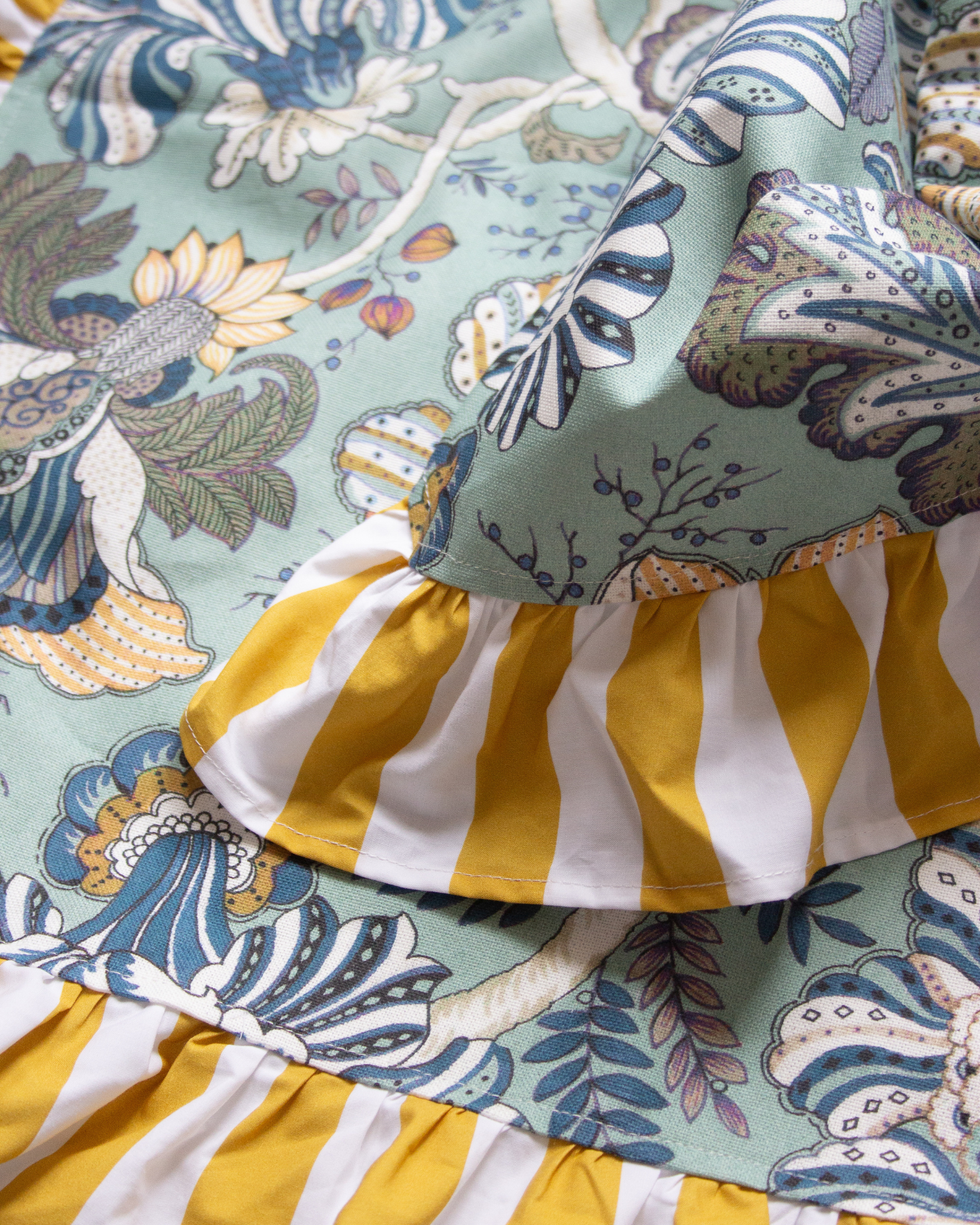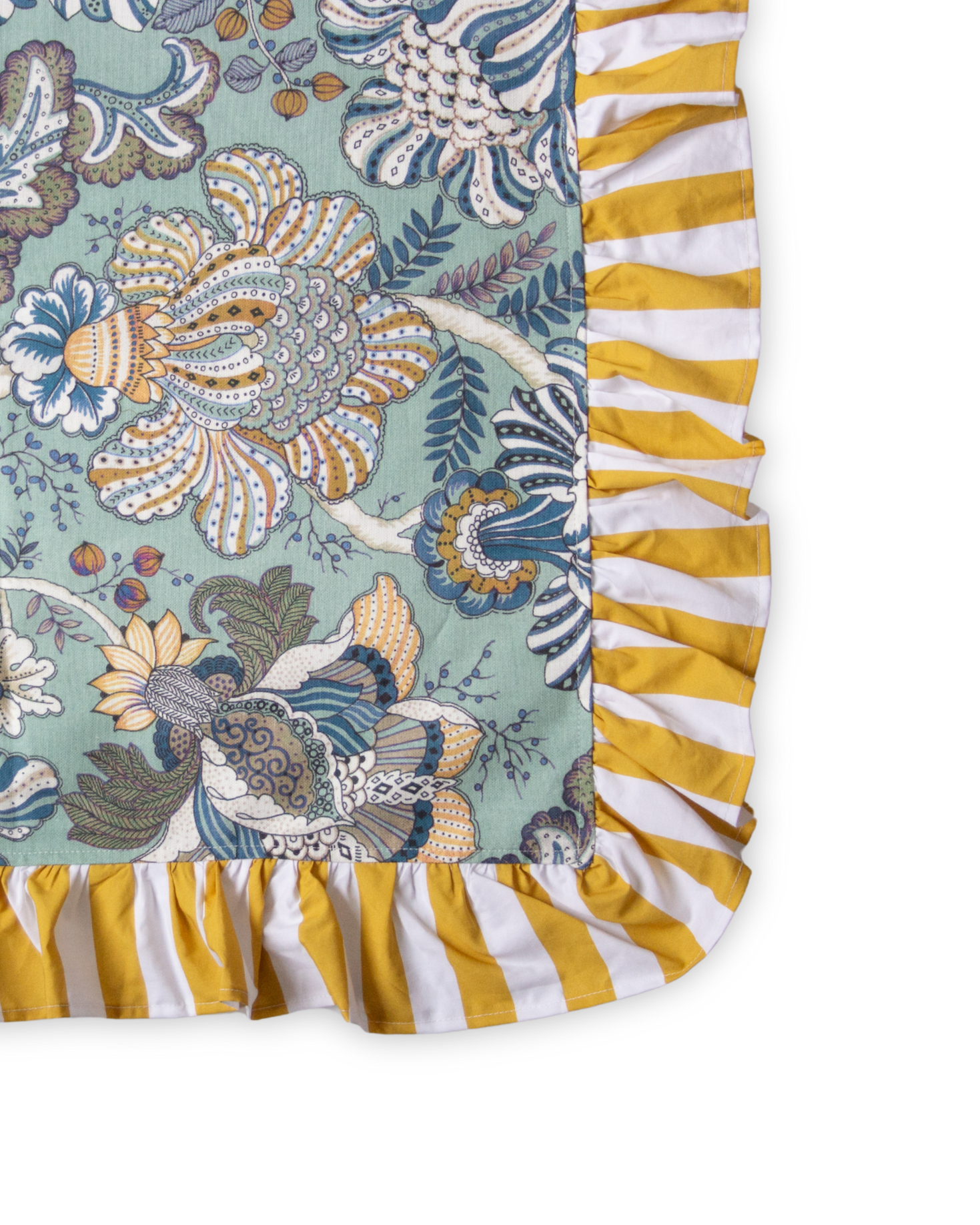 Mantel cuadrado de color azul hecho en 100% algodón con estampado floral. Detalle de volante con estampado de rayas blanco y amarillo. También disponible en rayas azules.