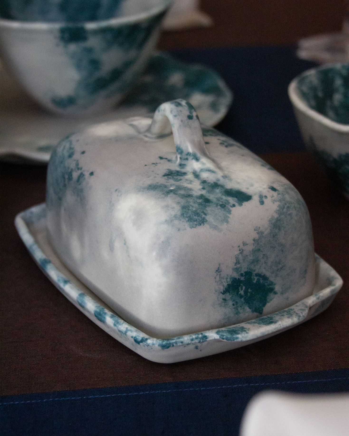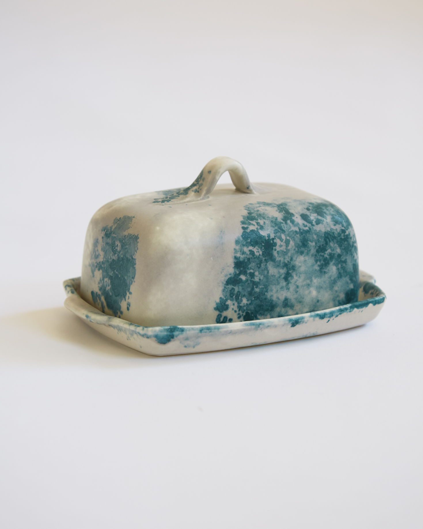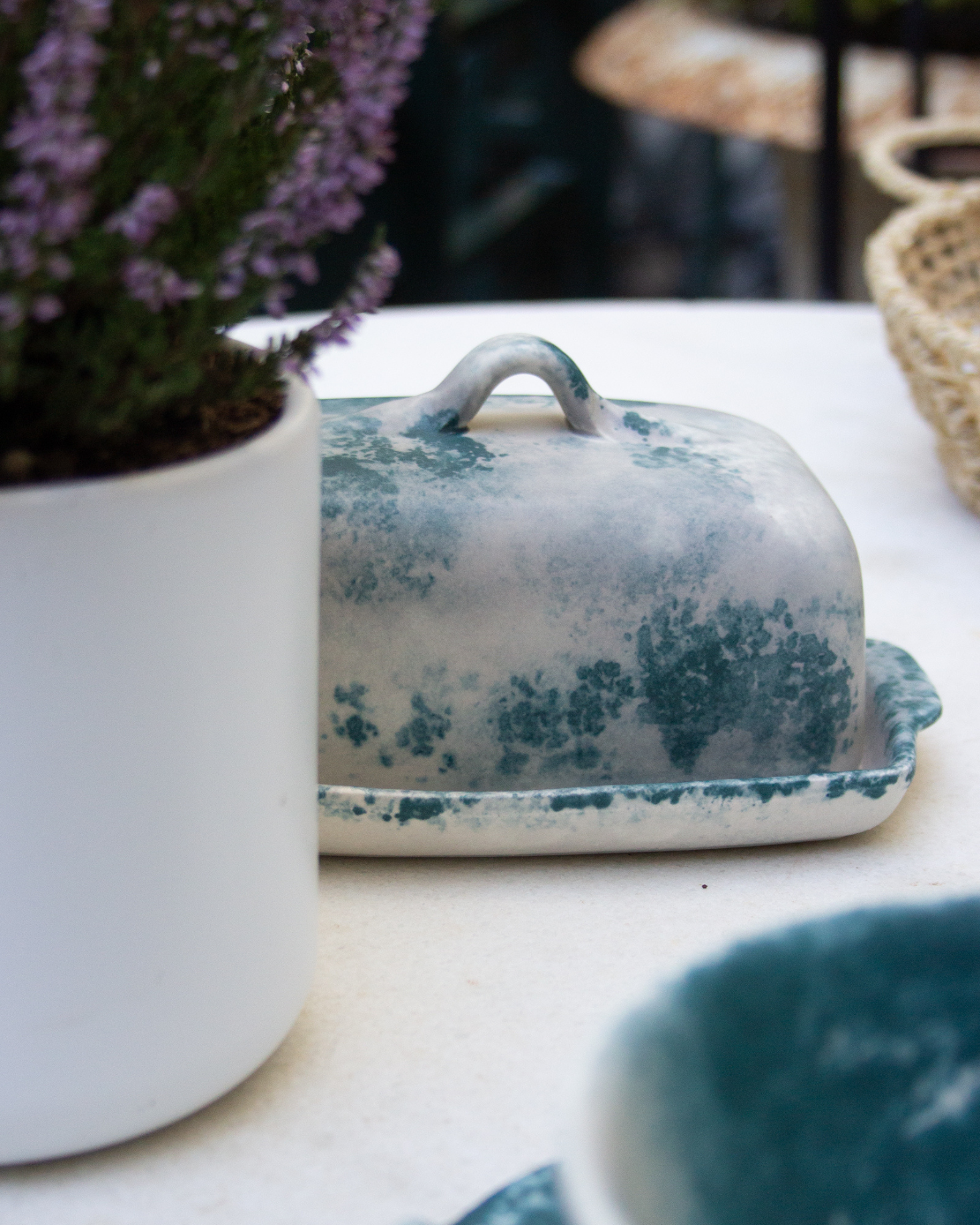Mantequillera orgánica de cerámica artesanal pintada a mano en tonos blancos y verdes.