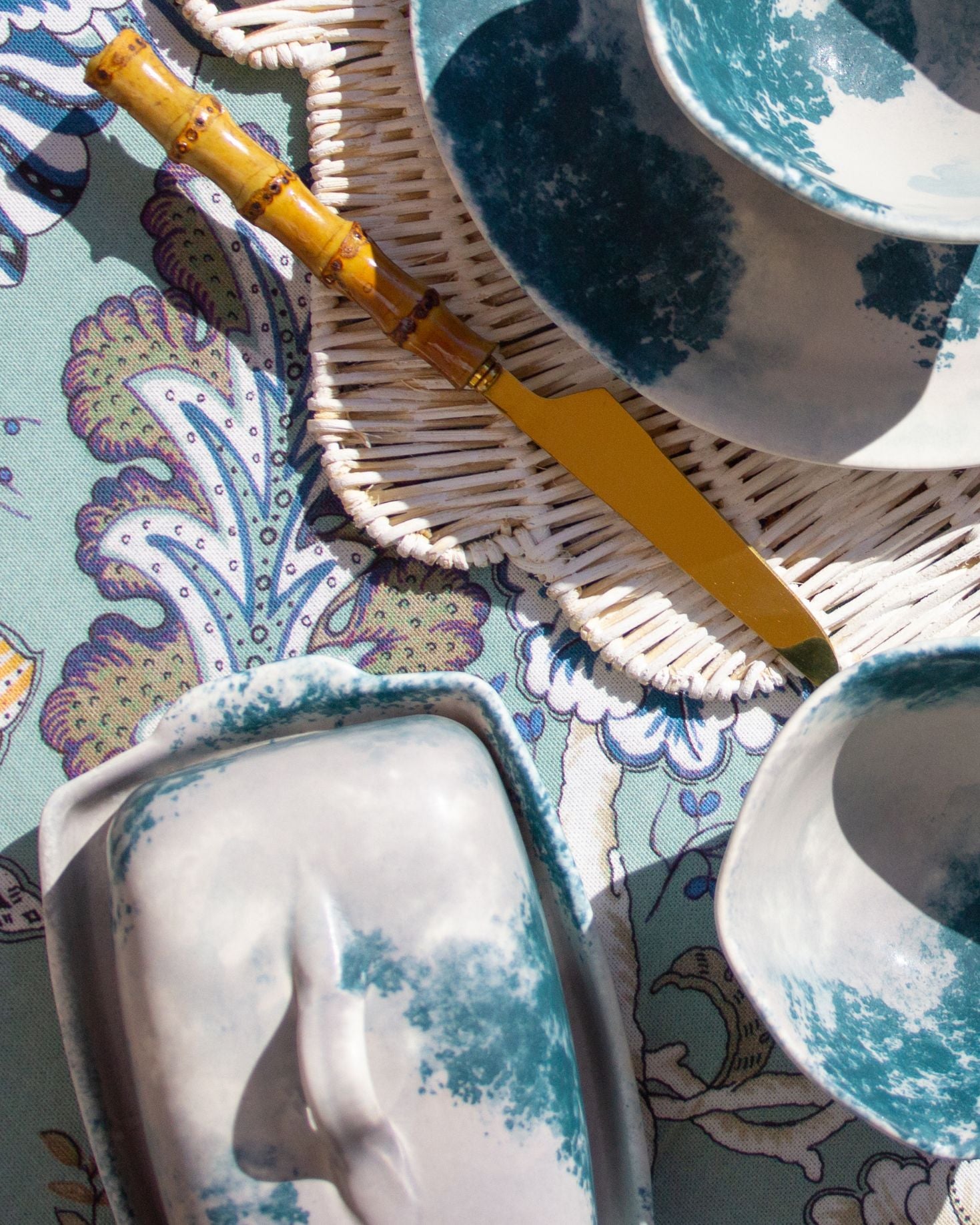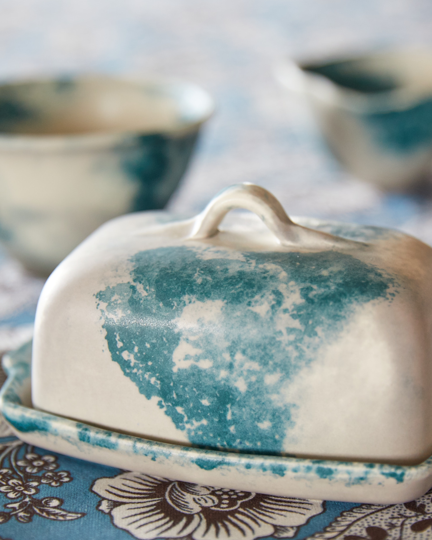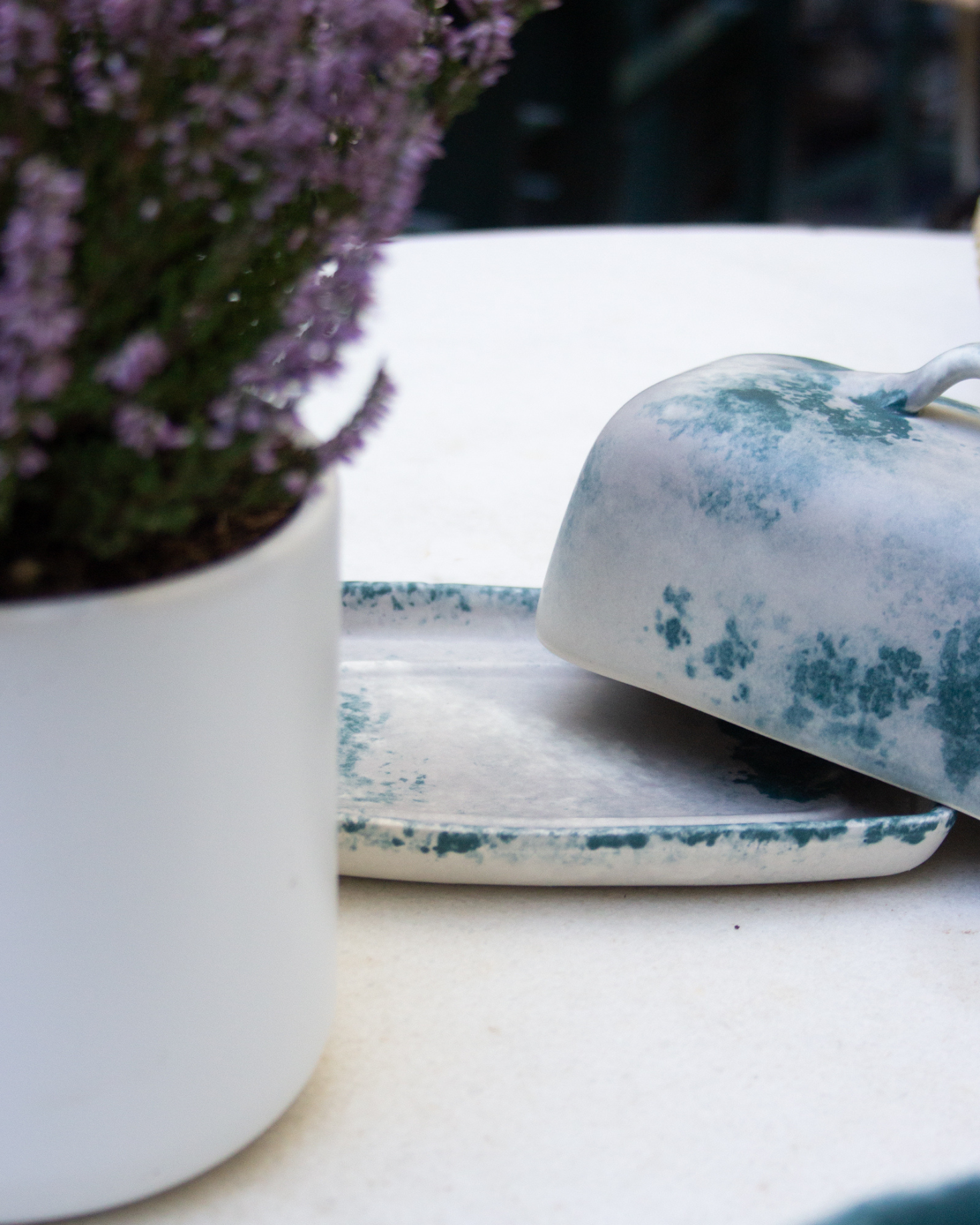 Mantequillera orgánica de cerámica artesanal pintada a mano en tonos blancos y verdes.