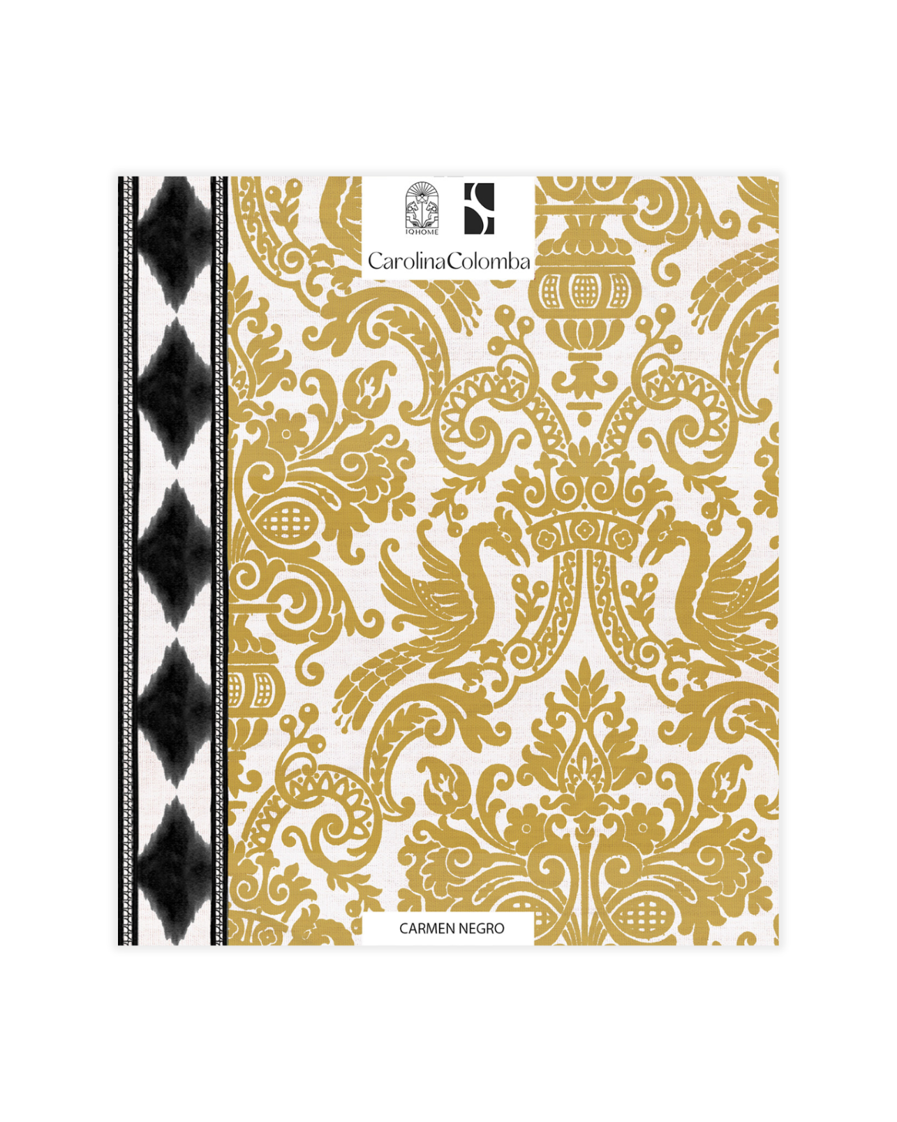 CARMEN NEGRO es un papel pintado de una hermosa trama caleidoscópica de tono ocre, que fusiona elementos clásicos como los leones palaciegos con lo étnico, diseño en colaboración con Carolina Colomba.