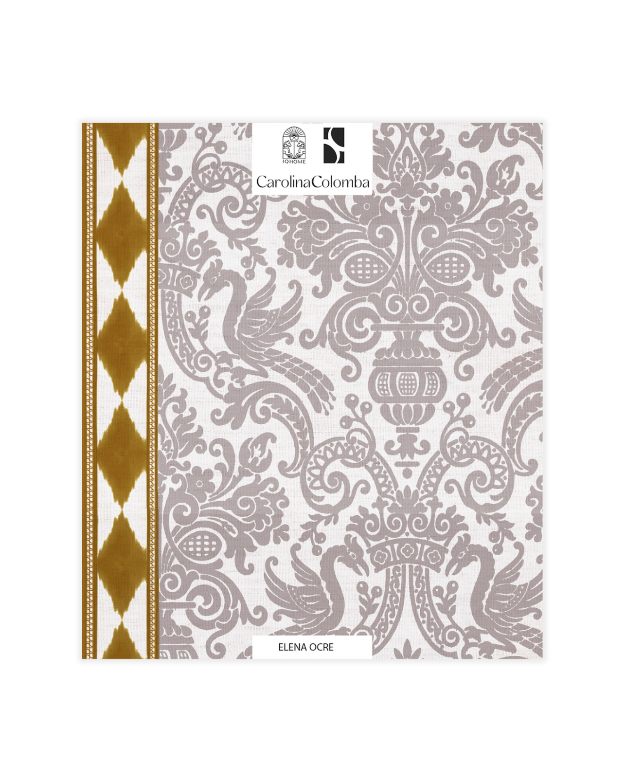 ELENA OCRE es un papel pintado de una hermosa trama caleidoscópica de tono taupe, que fusiona elementos clásicos como los leones palaciegos con una guarda étnico, diseño en colaboración con Carolina Colomba.