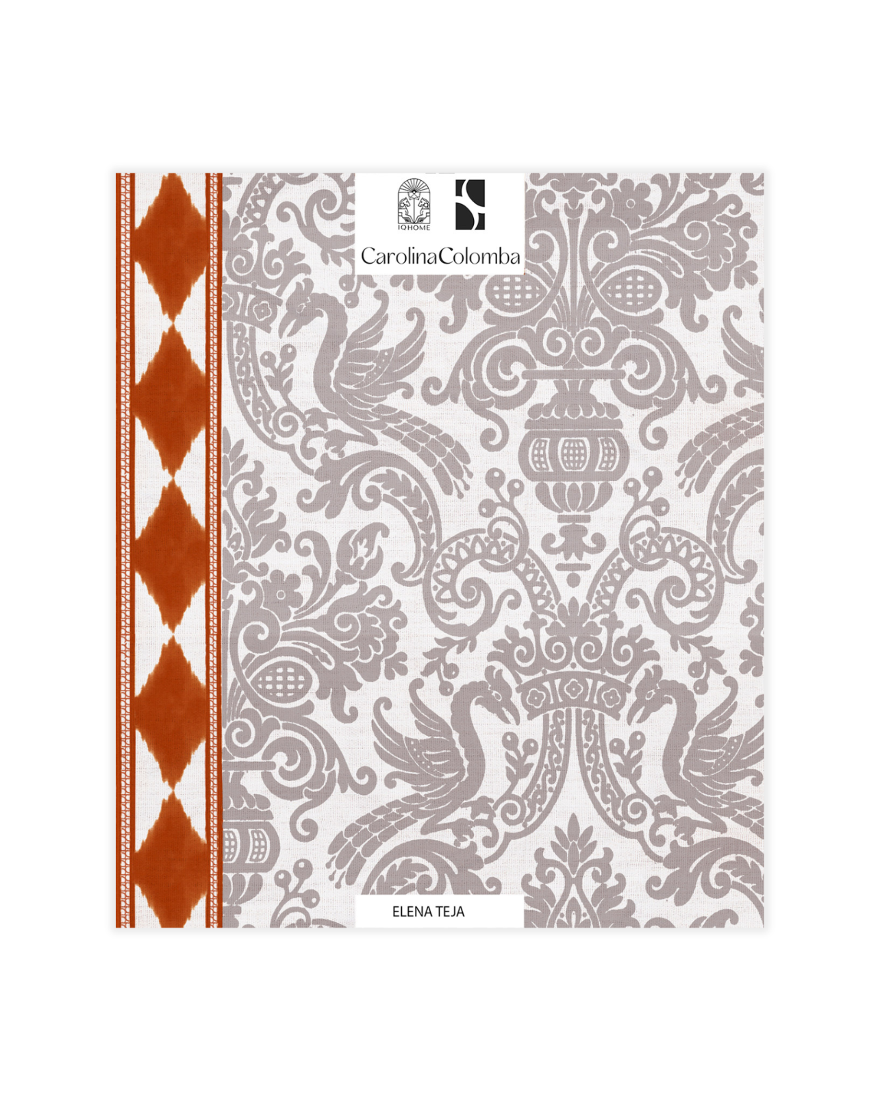 ELENA TEJA es un papel pintado de una hermosa trama caleidoscópica de tono taupe, que fusiona elementos clásicos como los leones palaciegos con una guarda étnico, diseño en colaboración con Carolina Colomba.