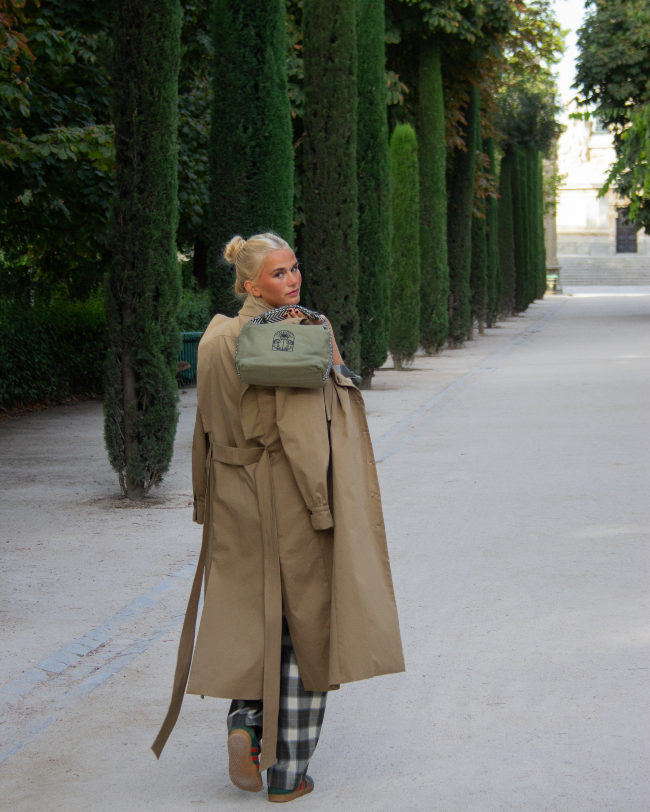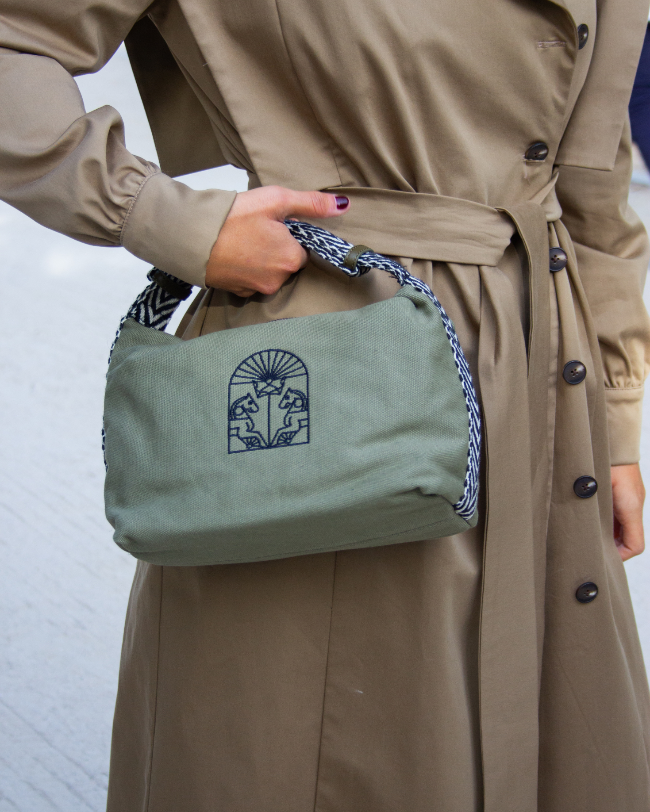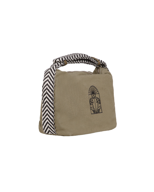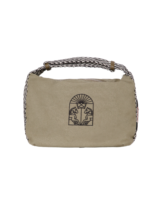 Neceser con asa extensible en color verde con cremallera y detalle de greca beige y negro. Logo bordado en color negro. Disponible en color verde y negro.