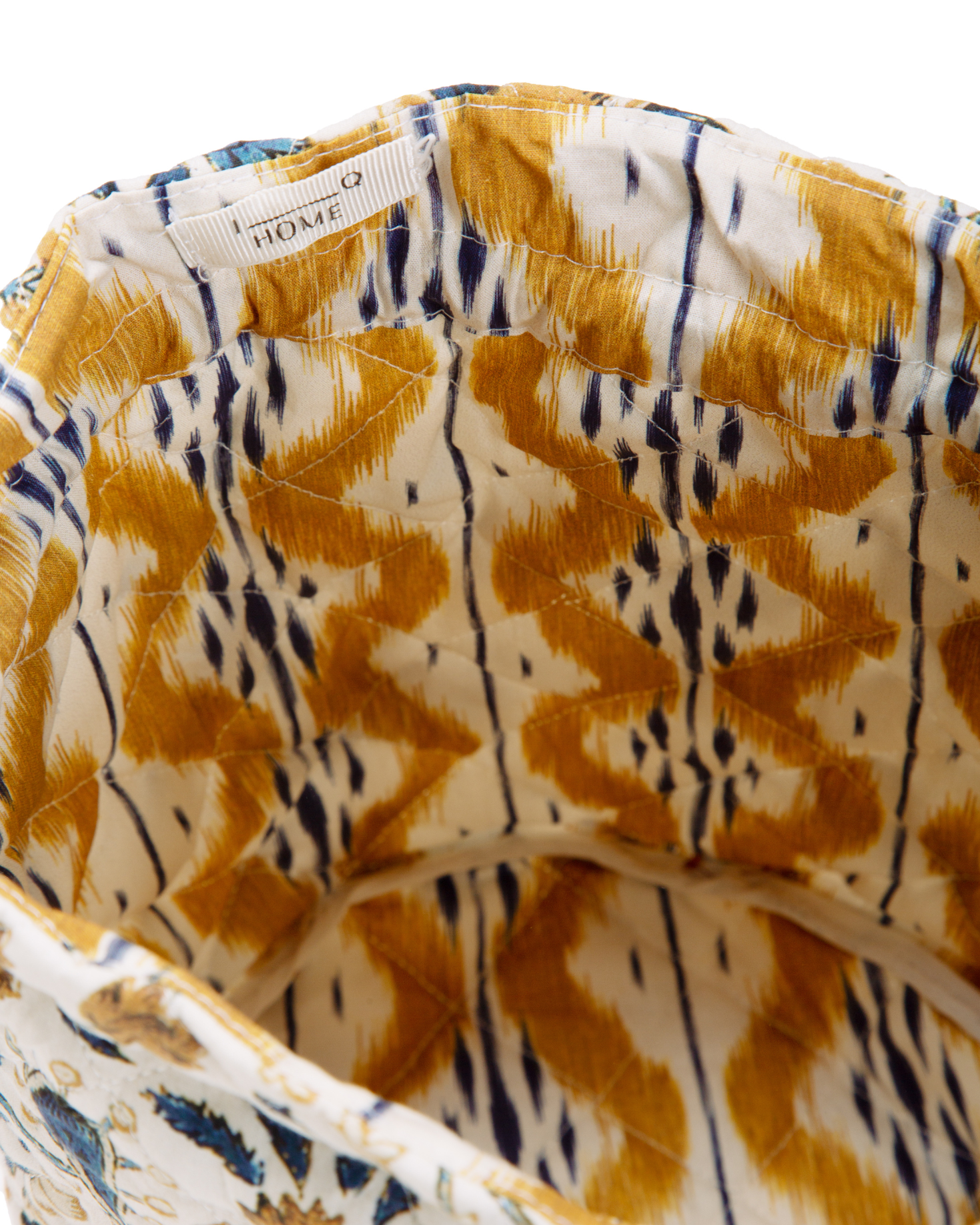 Neceser confeccionado en algodón 100% acolchado, con un exterior suave y resistente decorado con un delicado estampado floral en tonos azul y mostaza. Su interior está resinado para facilitar la limpieza y presenta un forro con estampado étnico, que aporta un toque inesperado de color y estilo.