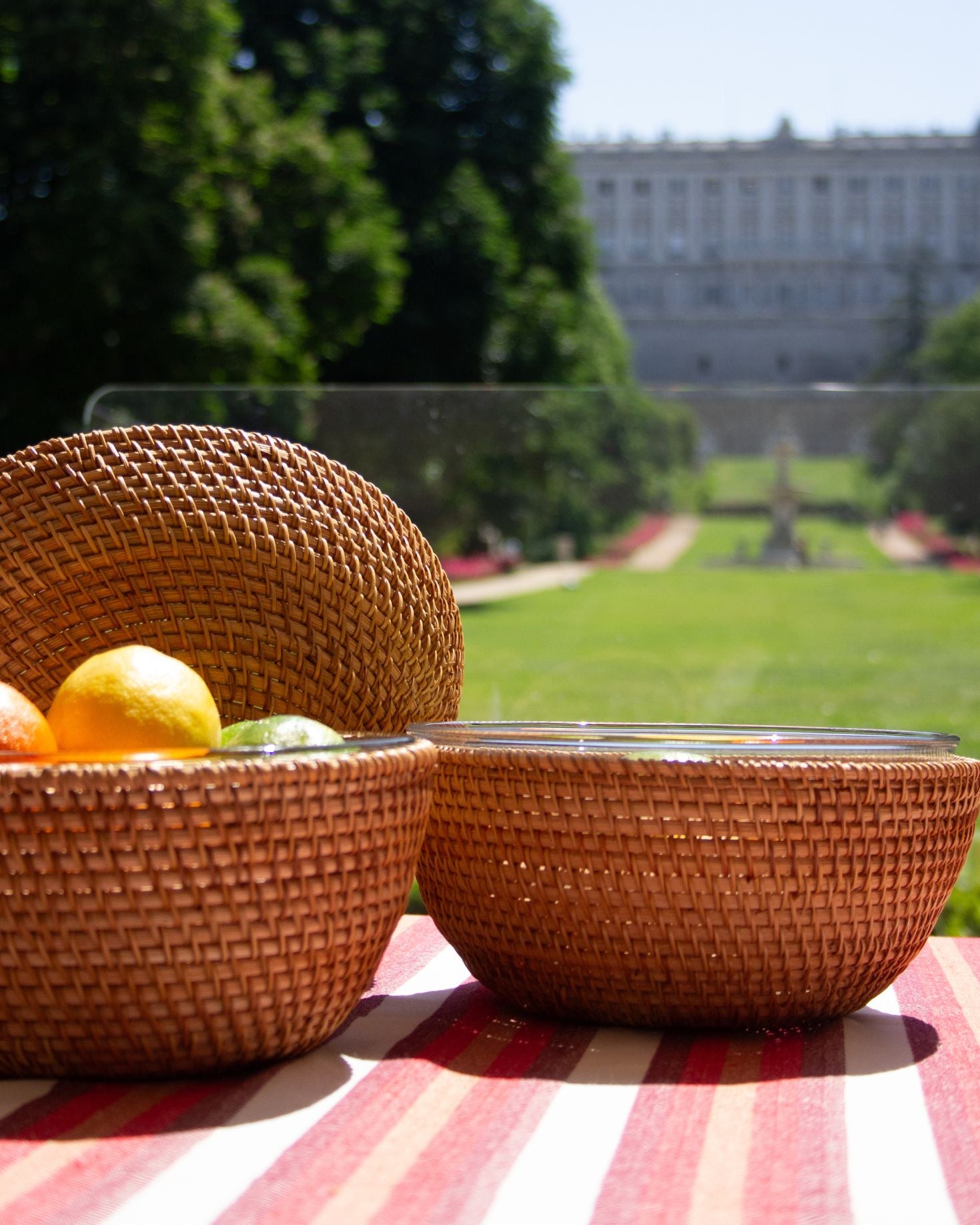 Pack de 3 cuencos redondos de mimbre con base de cristal en tamaño grande, mediano y pequeño.