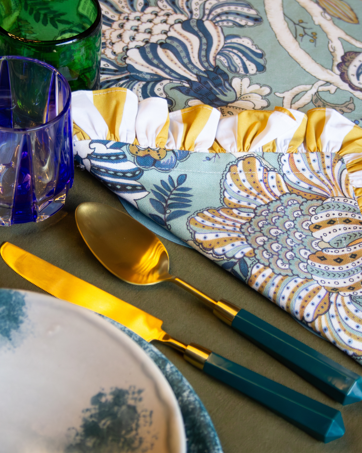 Pack de 4 servilletas cuadradas de color azul hechas en 100% algodón con estampado floral. Detalle de volante con estampado de rayas blanco y amarillo. También disponible en rayas azules.